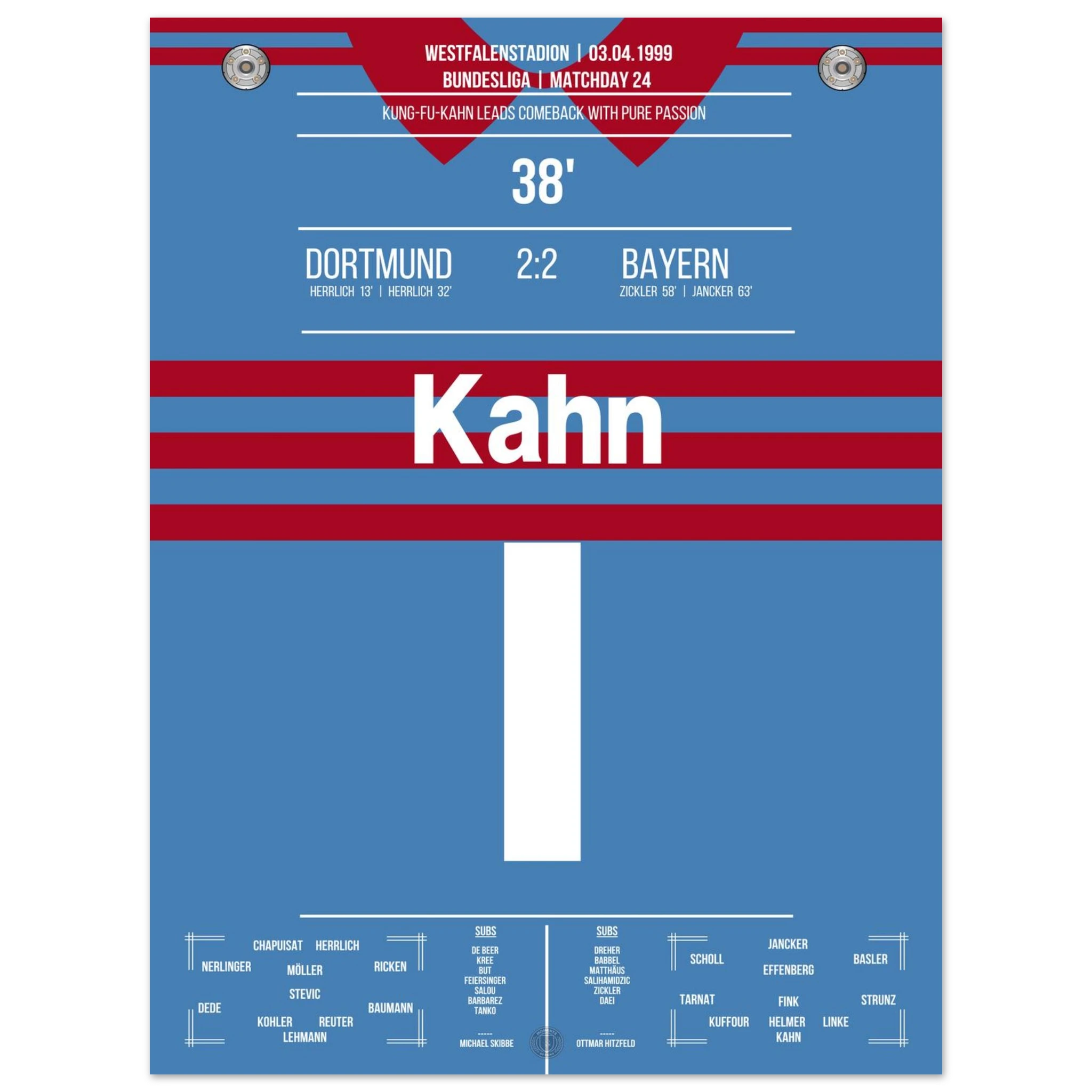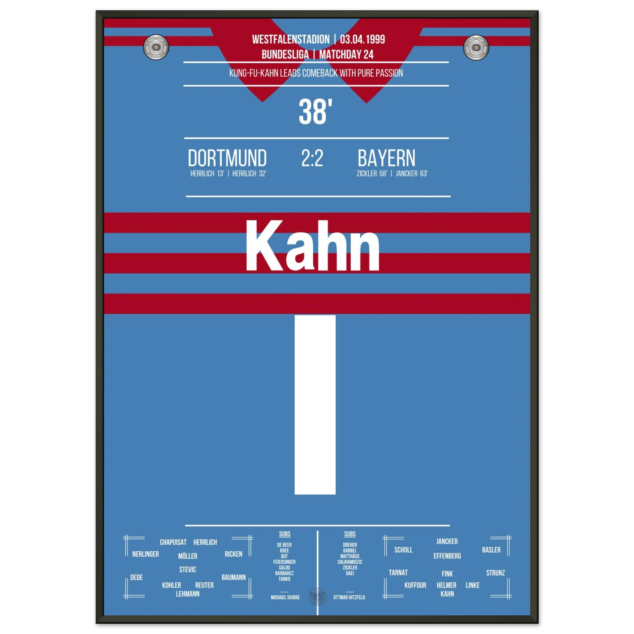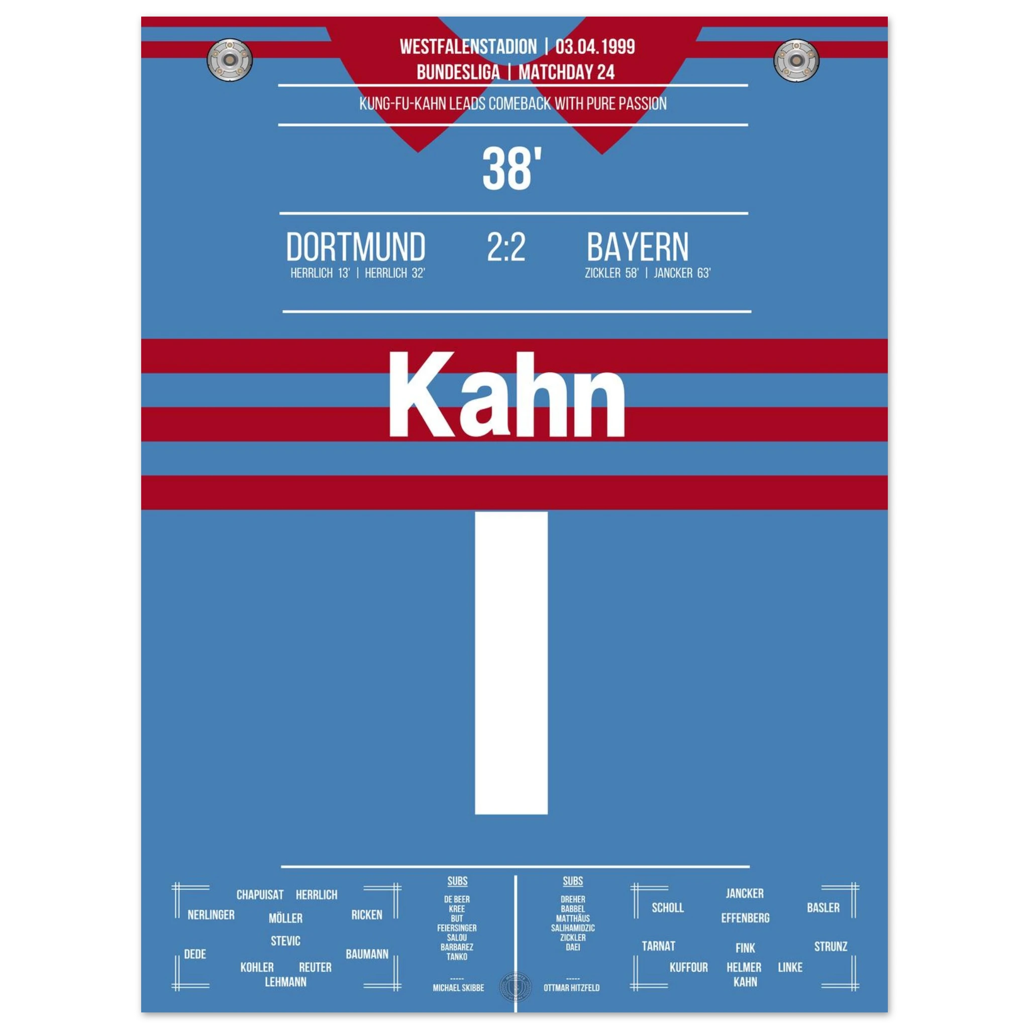 Ein Spiel, das Kultstatus erreichte: Dortmund führt 2:0, doch Bayern kämpft sich mit Leidenschaft zurück – ehe Oliver Kahn mit seinem legendären „Kung-Fu-Sprung“ gegen Chapuisat und einem Beißversuch auf Heiko Herrlich Fußball-Geschichte schreibt. Am Ende rettet München ein 2:2 – Dramatik pur im Westfalenstadion.