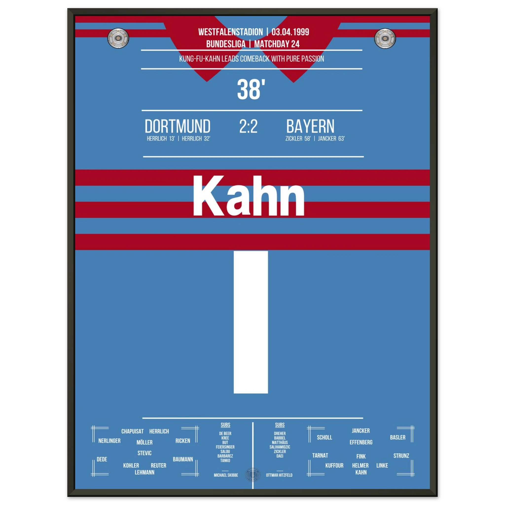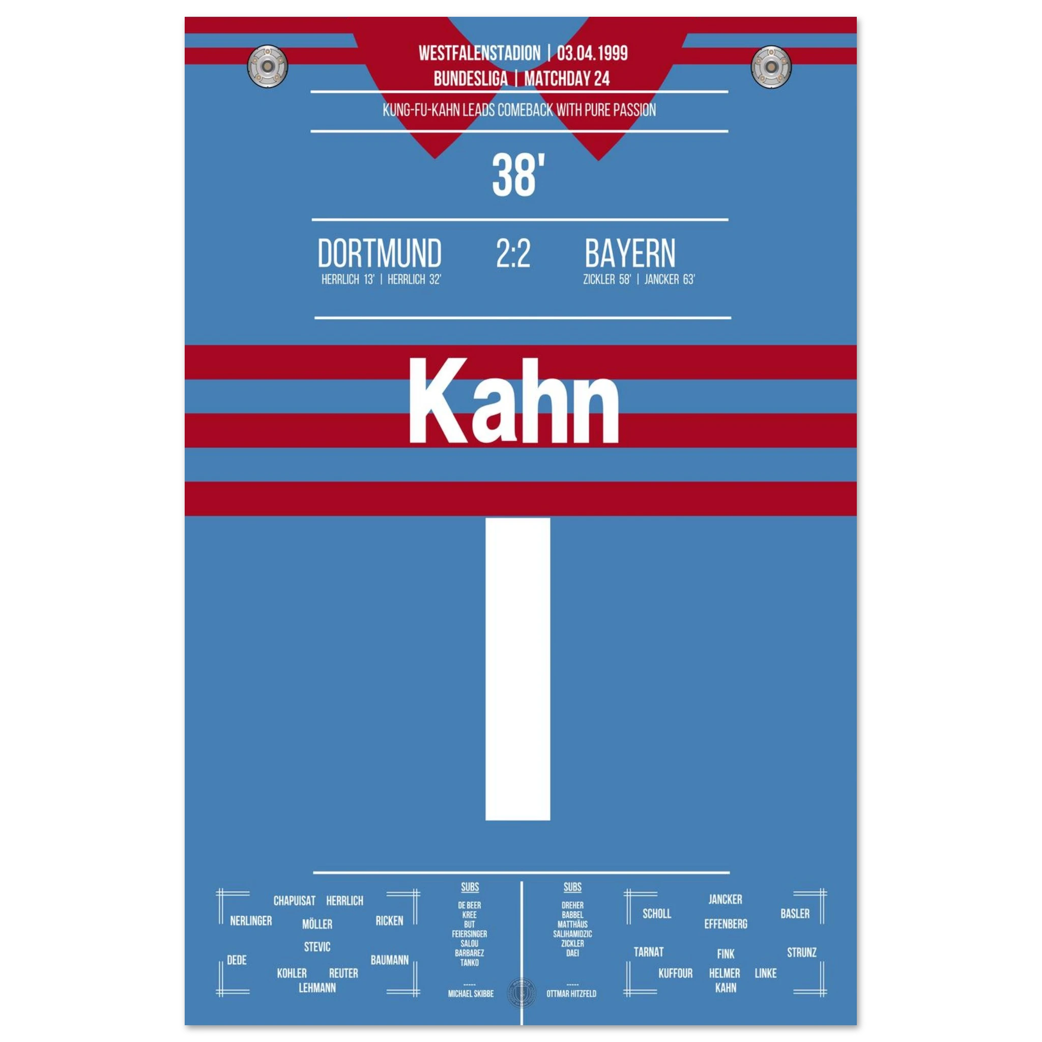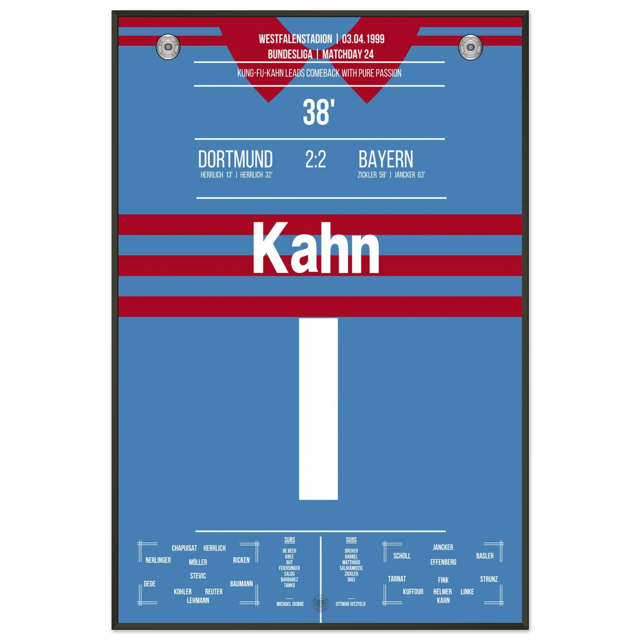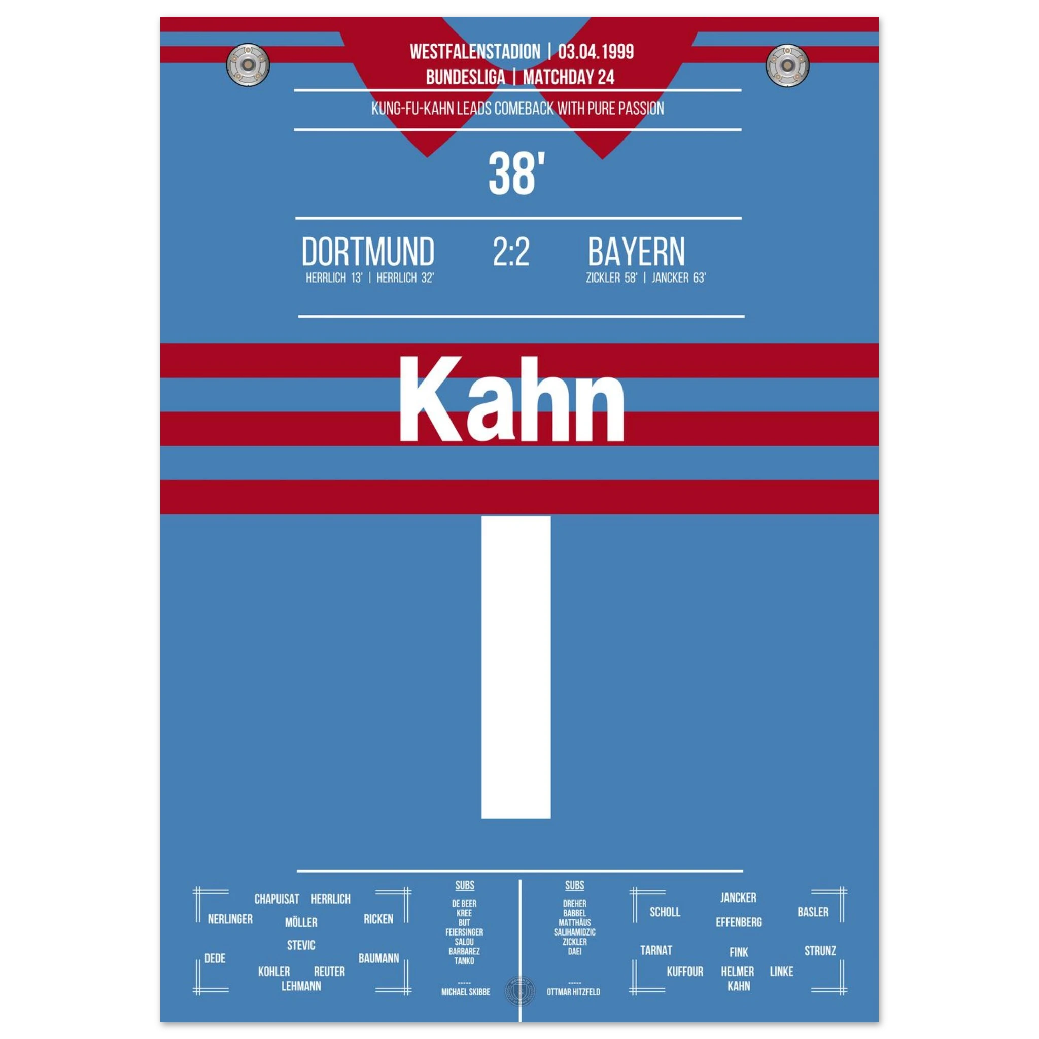 Ein Spiel, das Kultstatus erreichte: Dortmund führt 2:0, doch Bayern kämpft sich mit Leidenschaft zurück – ehe Oliver Kahn mit seinem legendären „Kung-Fu-Sprung“ gegen Chapuisat und einem Beißversuch auf Heiko Herrlich Fußball-Geschichte schreibt. Am Ende rettet München ein 2:2 – Dramatik pur im Westfalenstadion.
