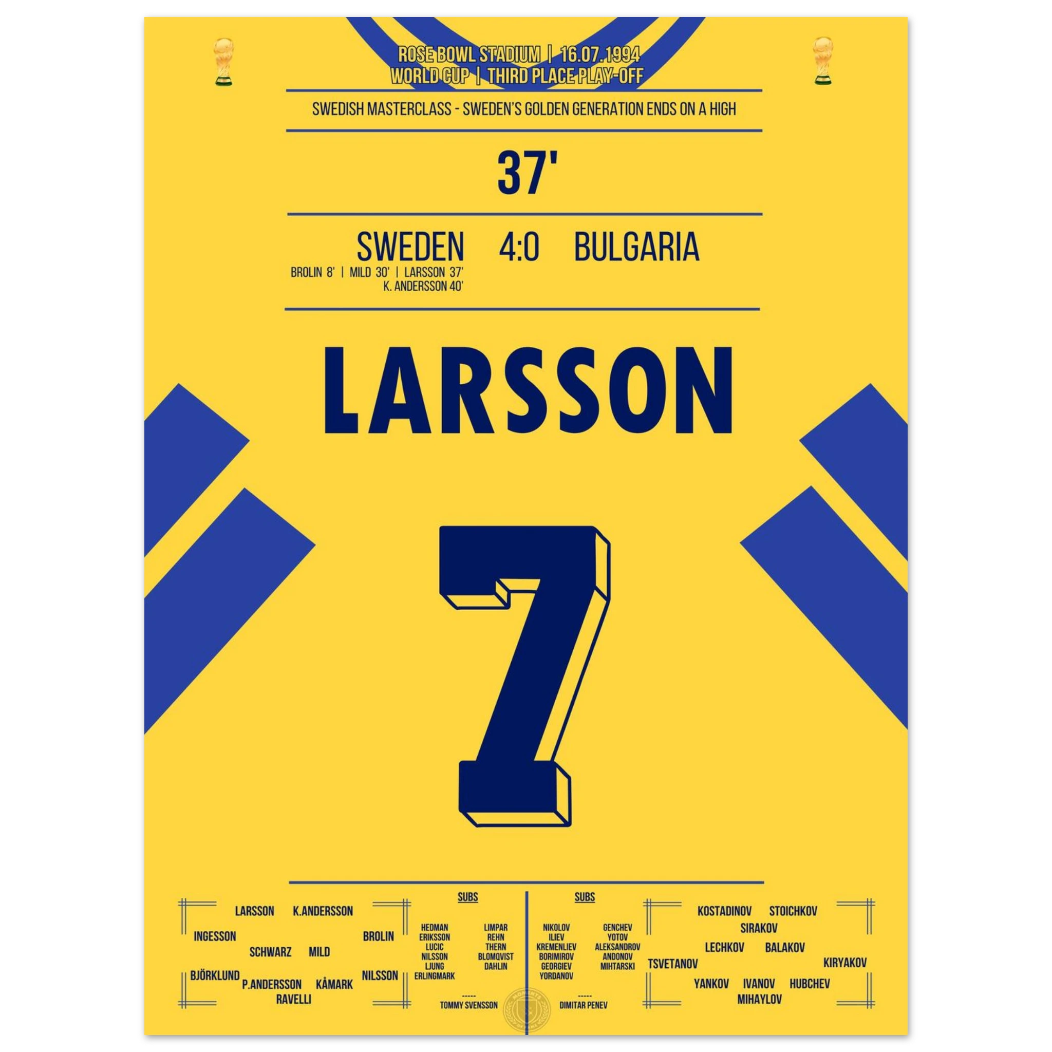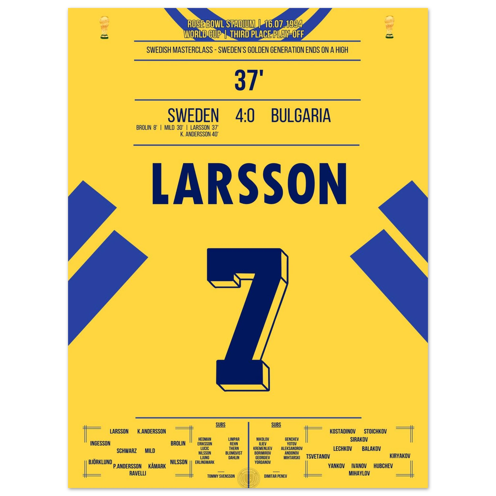 Im Spiel um Platz drei der Weltmeisterschaft schreibt Schweden Fußballgeschichte. Brolin, Mild, Larsson und Kenneth Andersson treffen beim klaren 4:0-Erfolg gegen Bulgarien und sichern ihrem Land die beste WM-Platzierung seit 1958. Ein rauschendes Finale eines unvergesslichen Turniers.