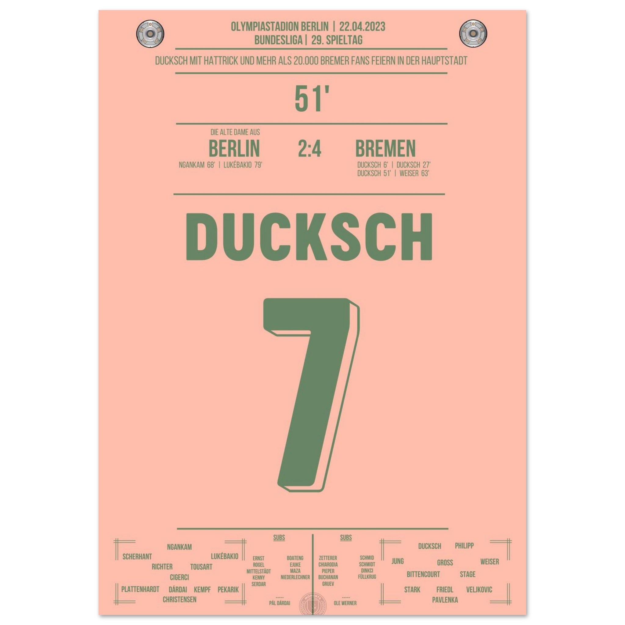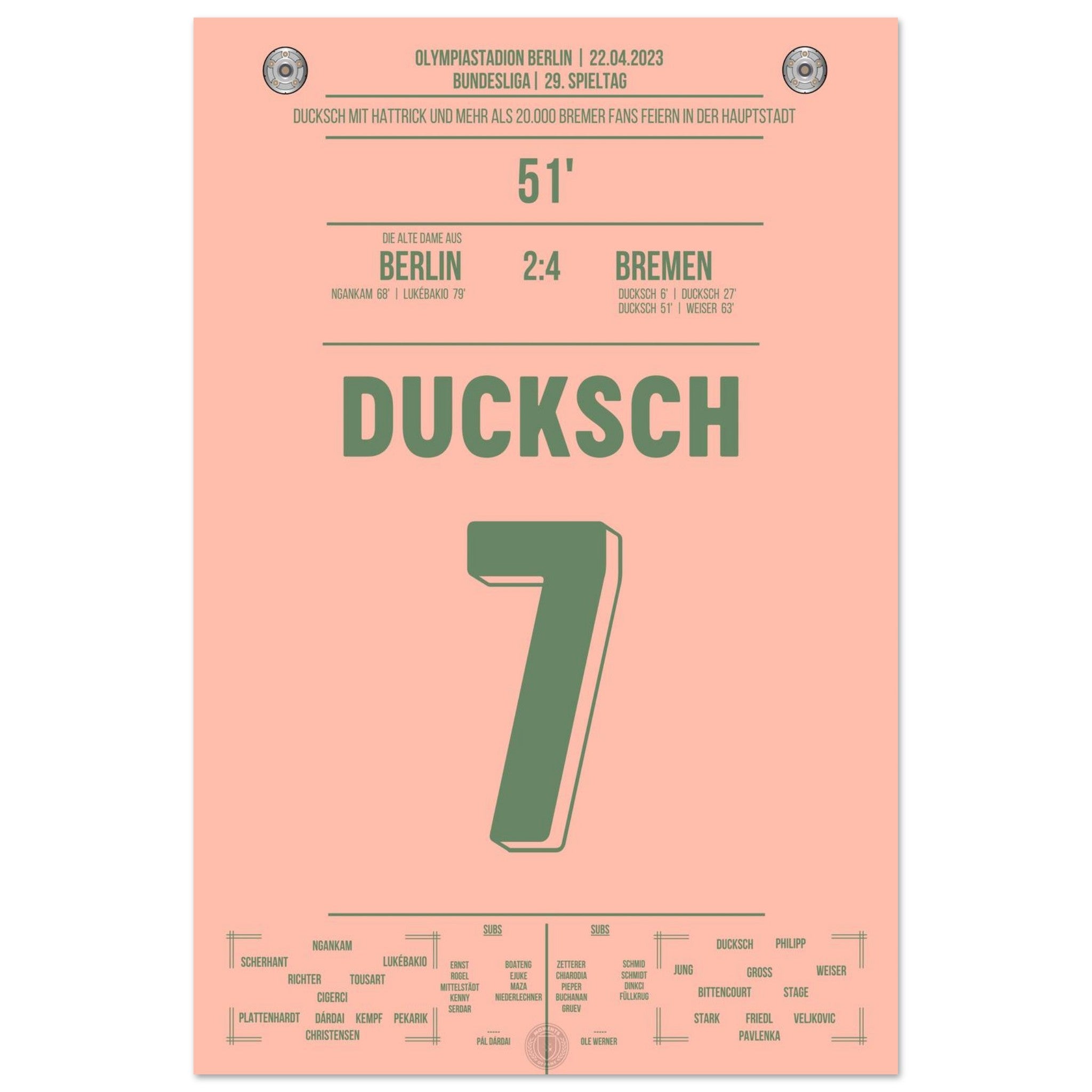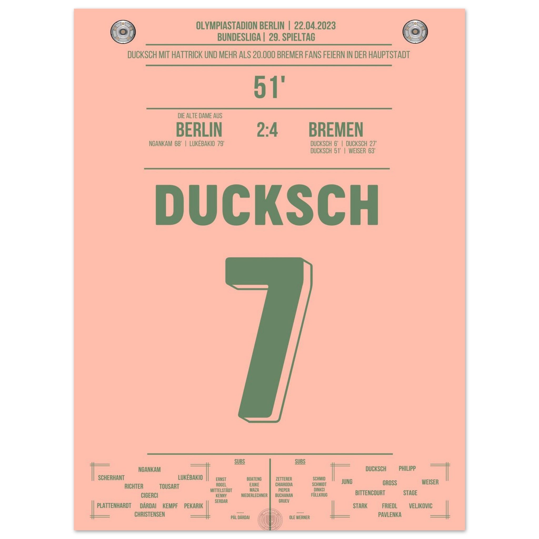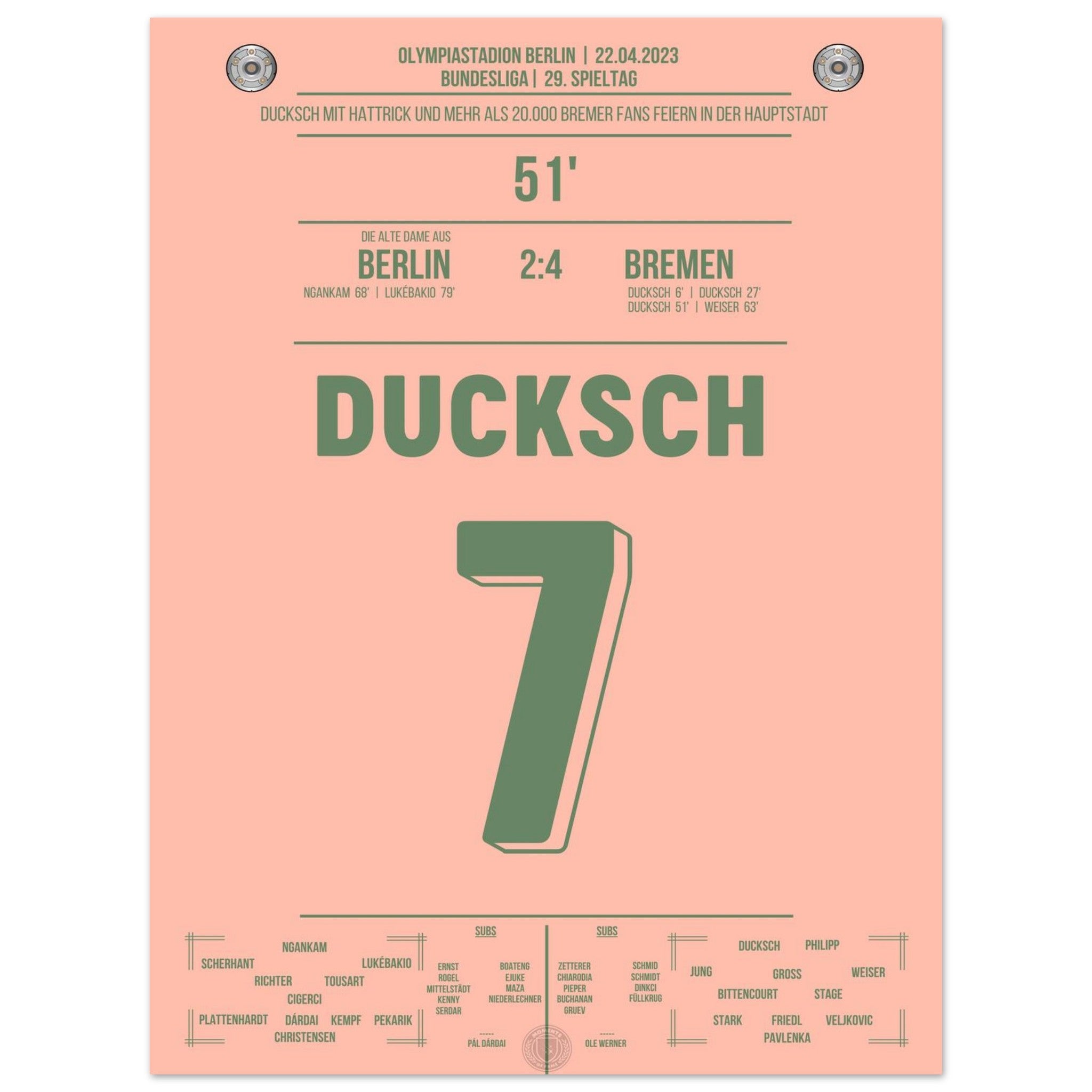 Marvin Ducksch. 6., 27., 51. Minute. Hattrick im Olympiastadion. Werder-Fans feiern Heimspiel in Berlin. Duckschs erster Bundesliga-Dreierpack – jetzt als Poster für deine Wand.
