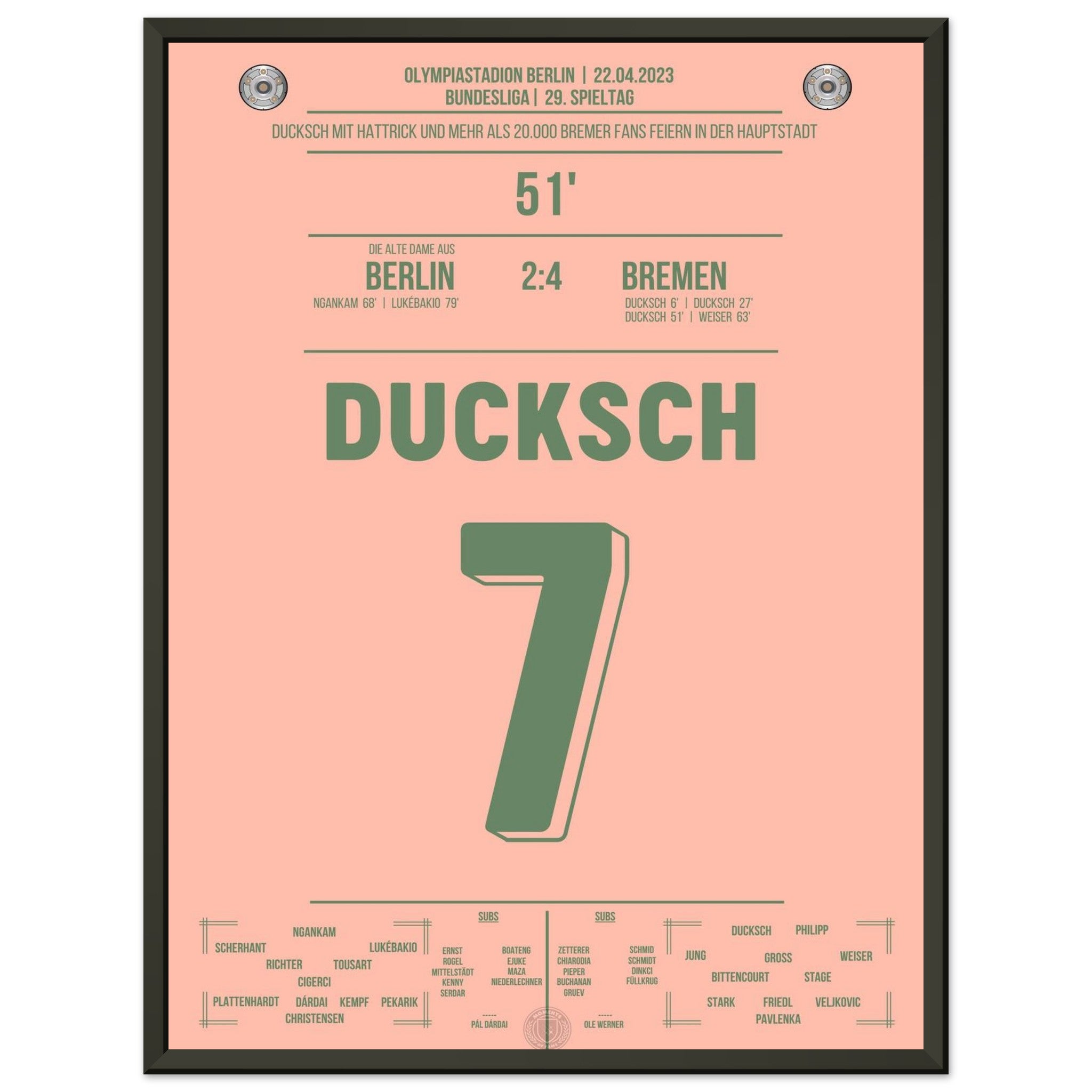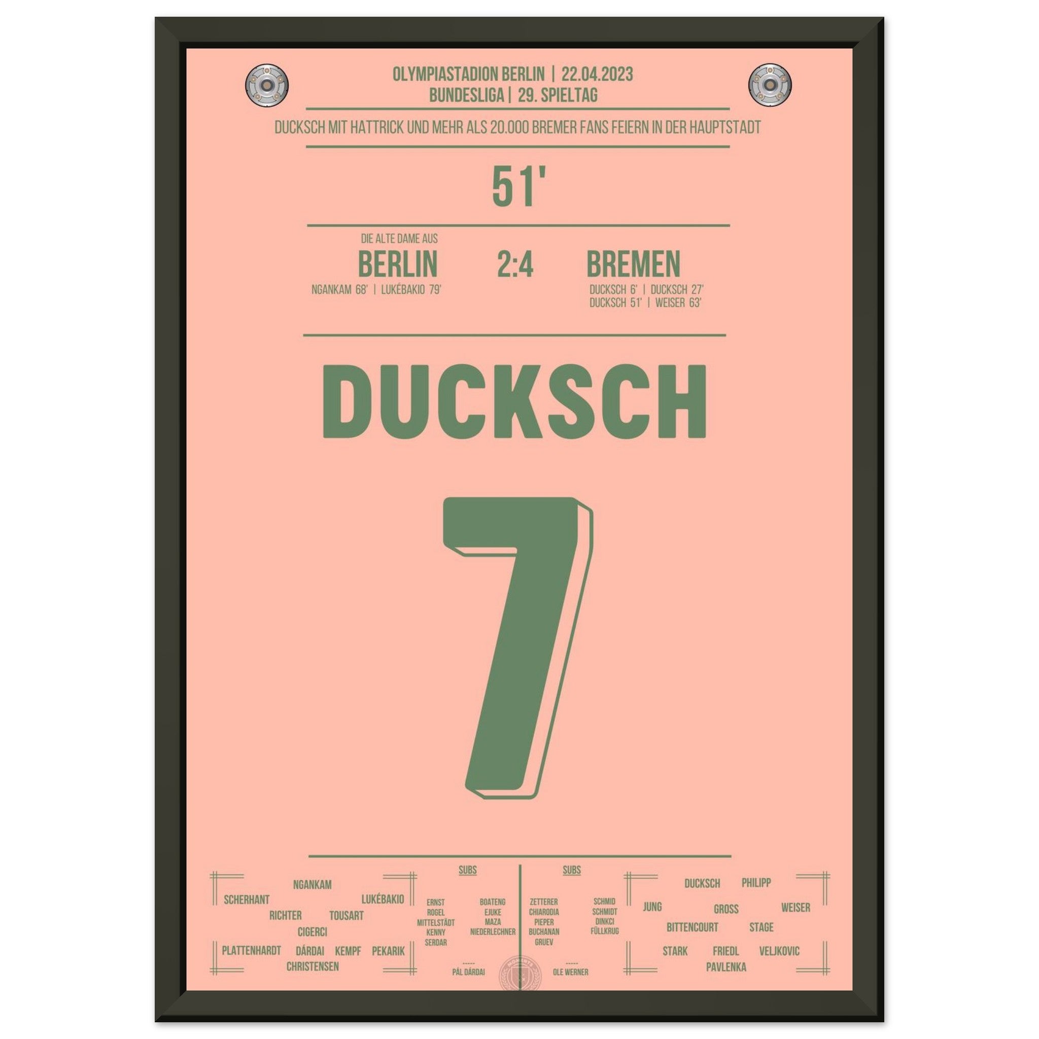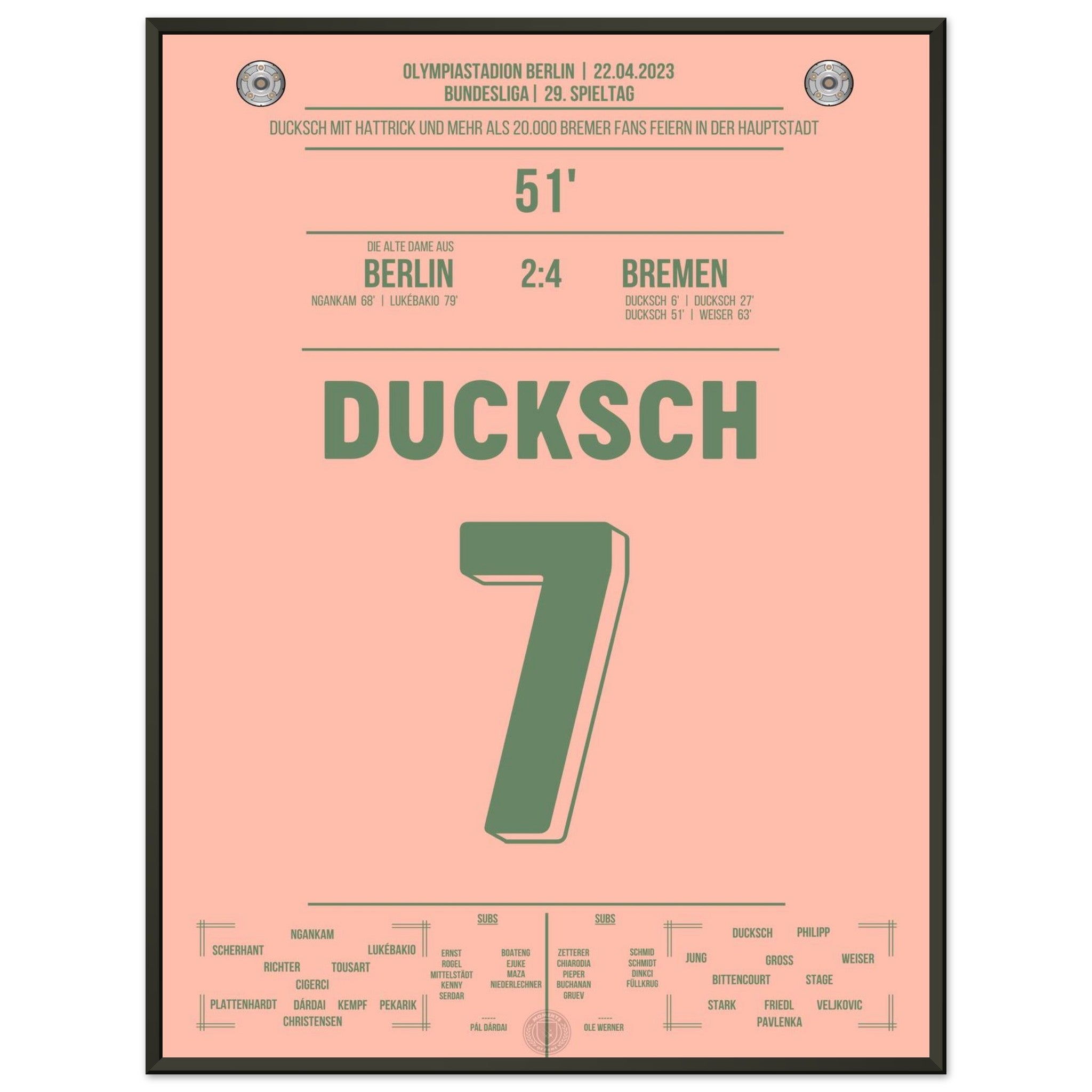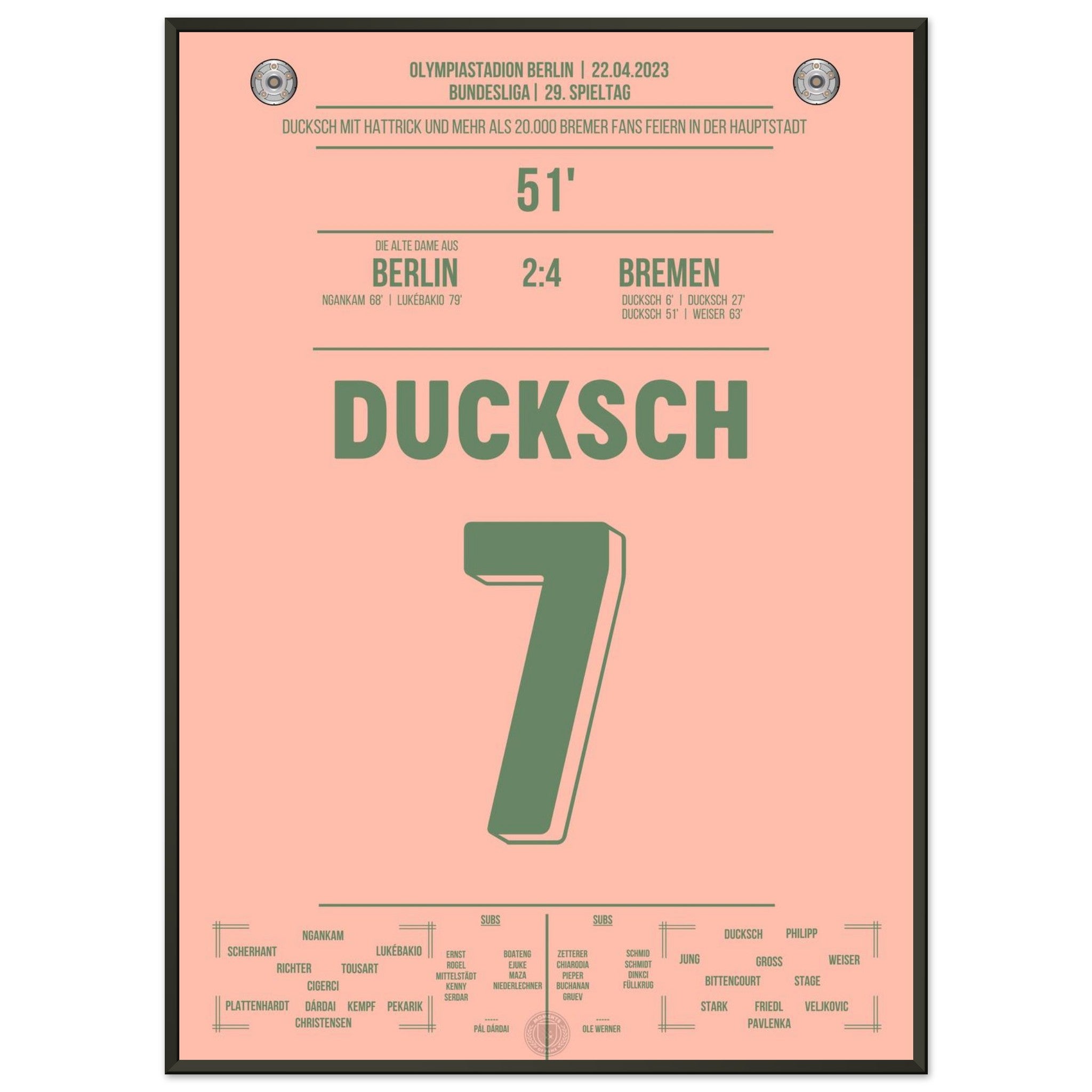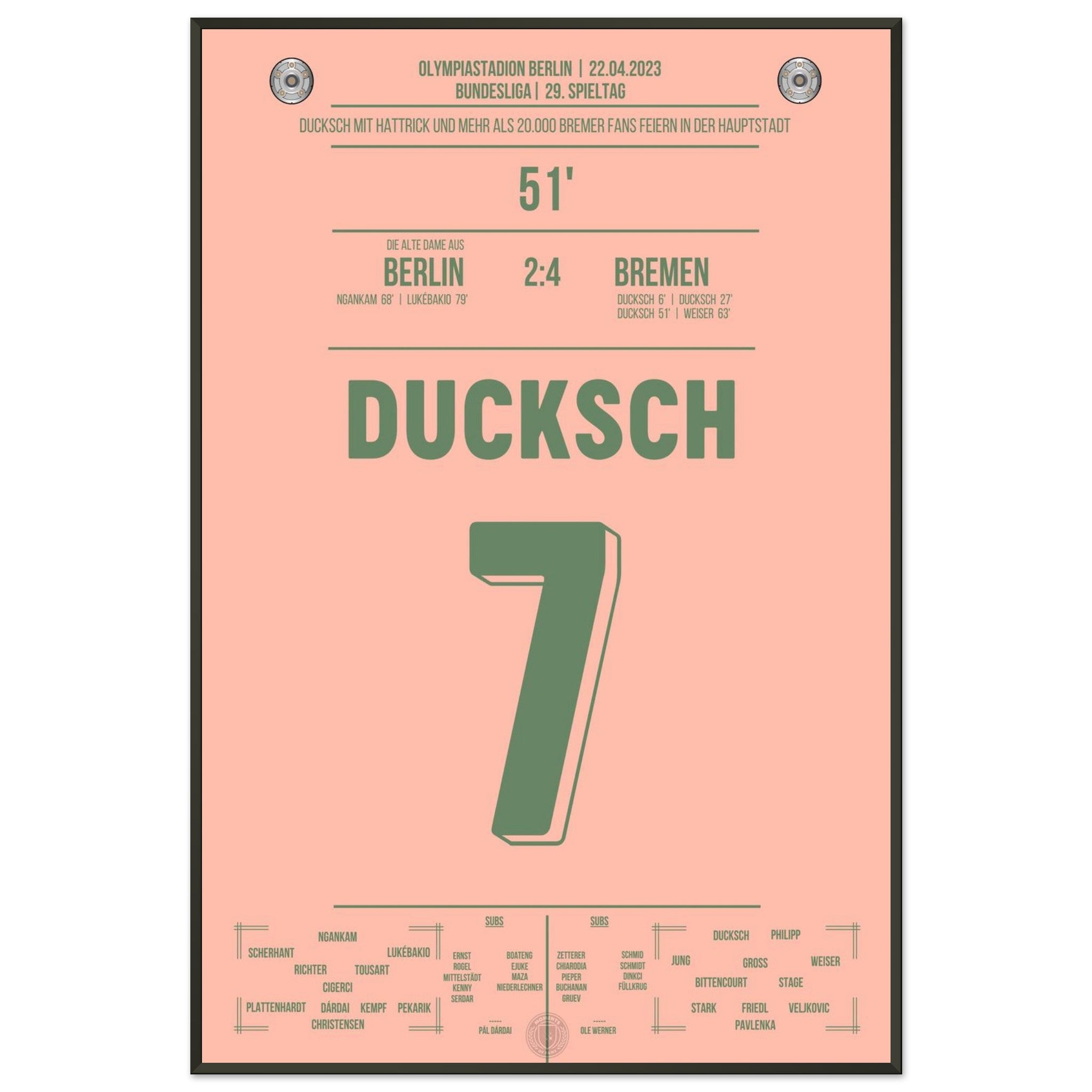 Marvin Ducksch. 6., 27., 51. Minute. Hattrick im Olympiastadion. Werder-Fans feiern Heimspiel in Berlin. Duckschs erster Bundesliga-Dreierpack – jetzt als Poster für deine Wand.