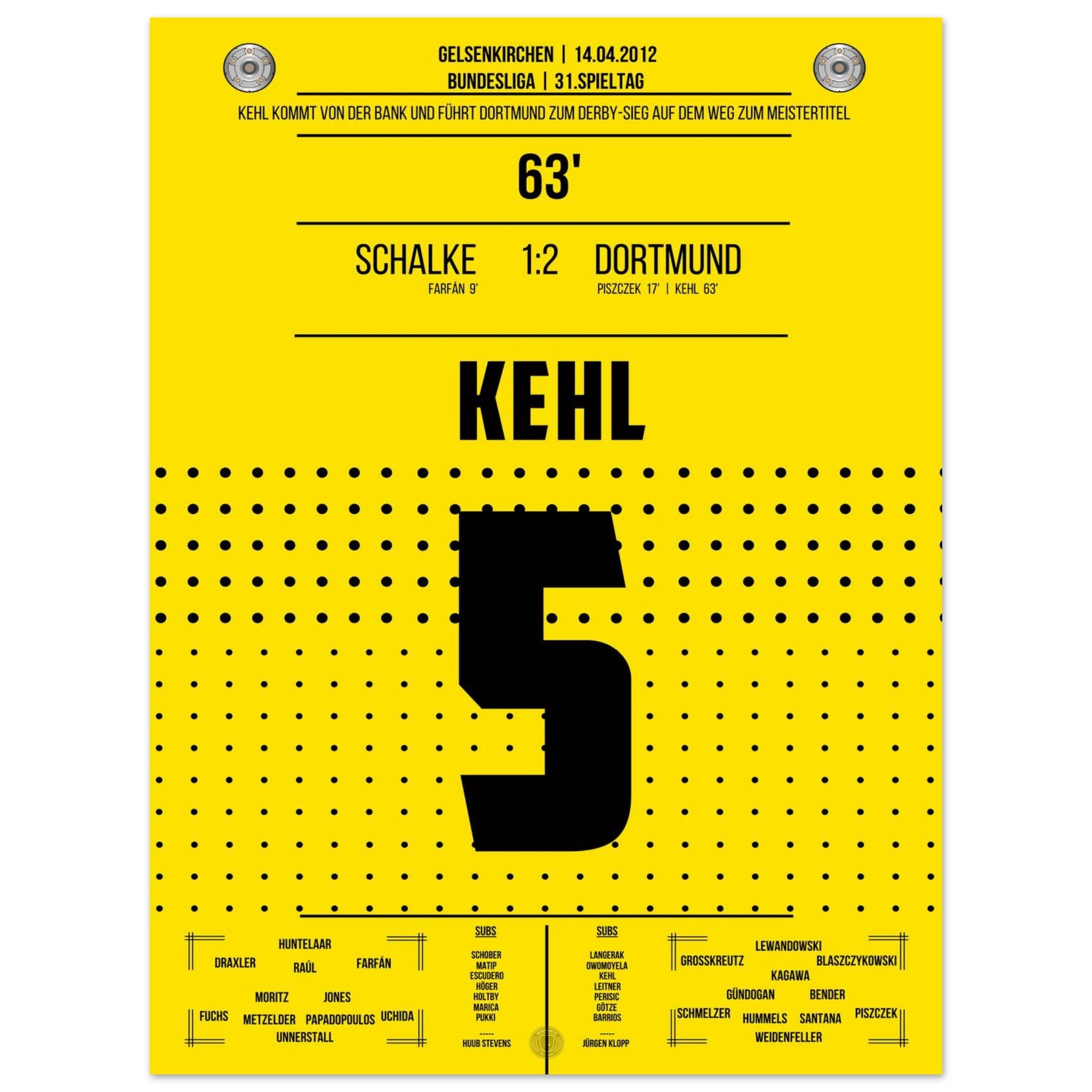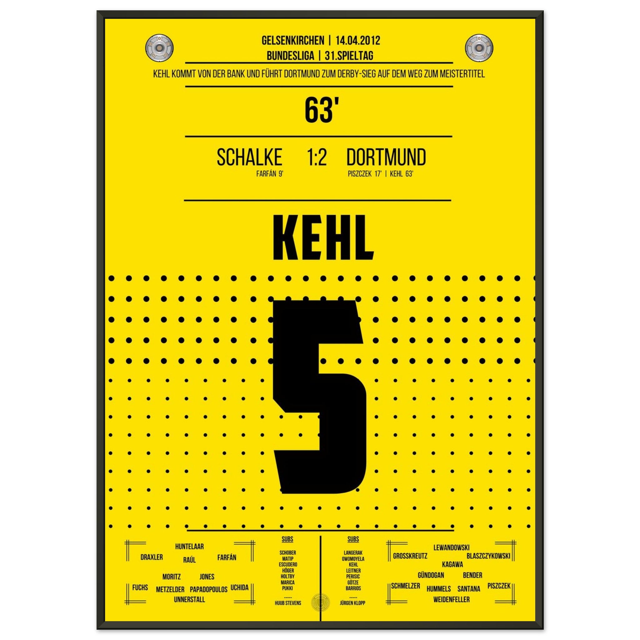 14. April 2012 – Schalke vs. Dortmund 1:2: Nach seiner Einwechslung trifft Sebastian Kehl in der 63. Minute im Revierderby zum 2:1 – und bringt Dortmund auf Titelkurs. Ein leidenschaftlicher Sieg im Feindesland, gekrönt vom Kapitän. Unser Poster verewigt diesen goldenen Derby-Moment für die Ewigkeit.