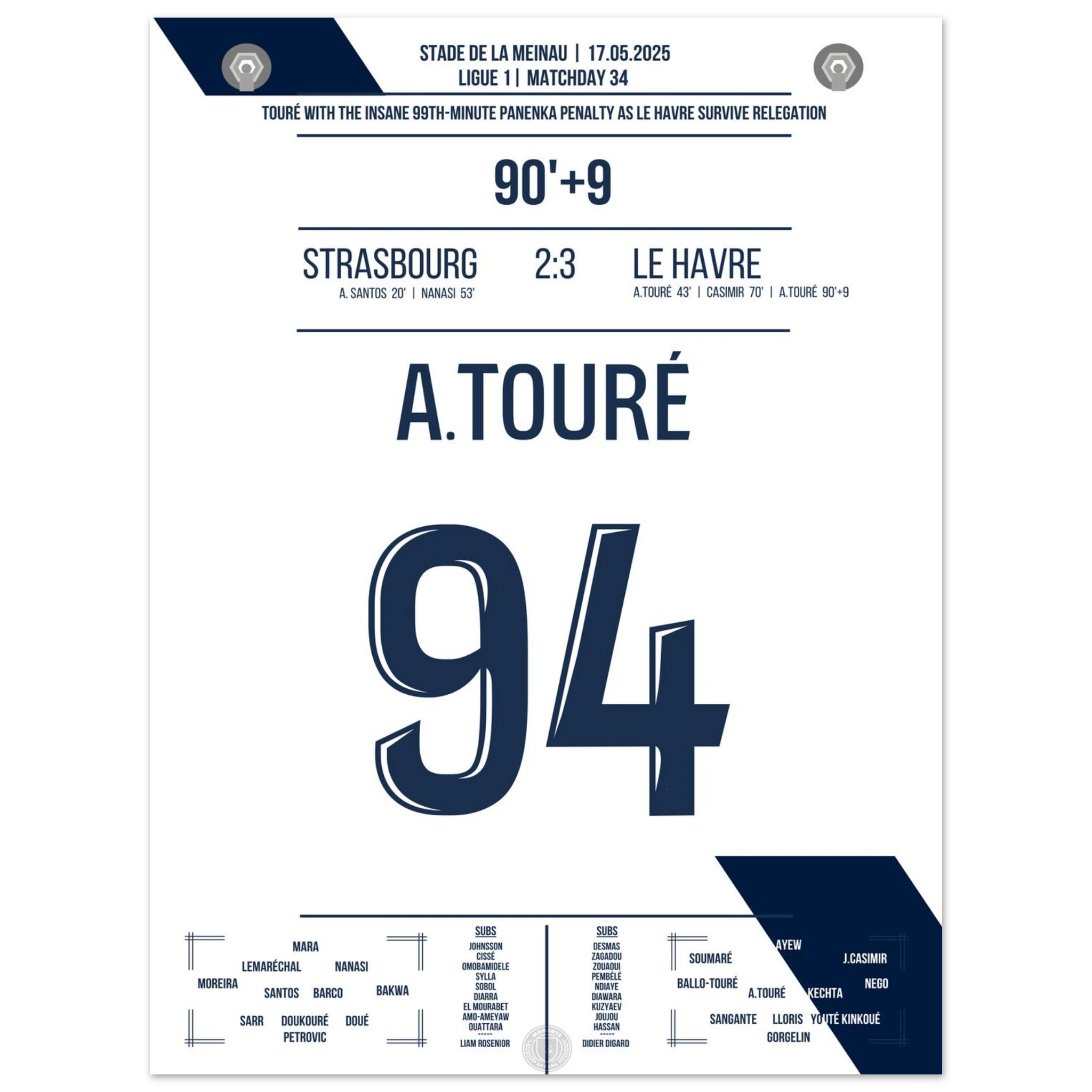 17. Mai 2025 – Strasbourg vs. Le Havre 2:3: In einem atemberaubenden Abstiegskrimi sorgt Touré in der 99. Minute für den Schockmoment im Stade de la Meinau. Sein Last-Minute Elfmeter im Panenka-Stil sichert Le Havre den Klassenerhalt – und schreibt sich in die Geschichtsbücher ein. Unser Poster fängt diesen dramatischen Schlusspunkt in voller Emotion ein.