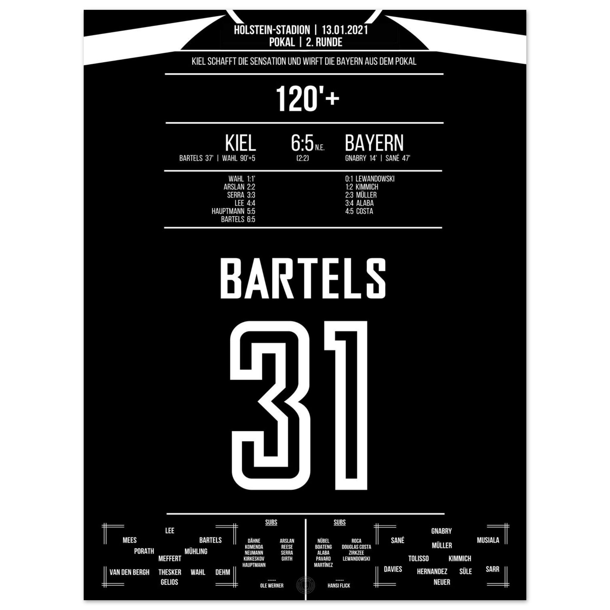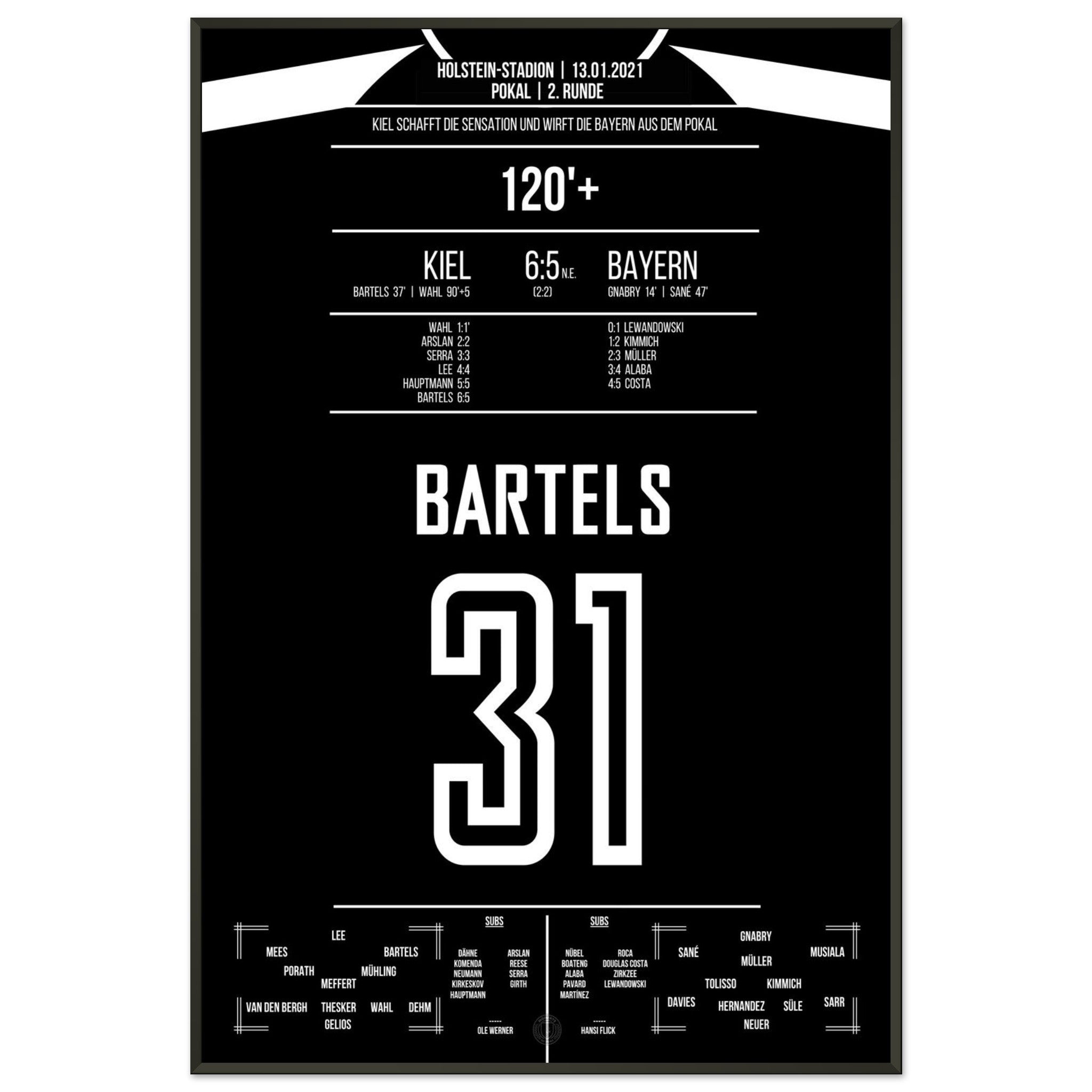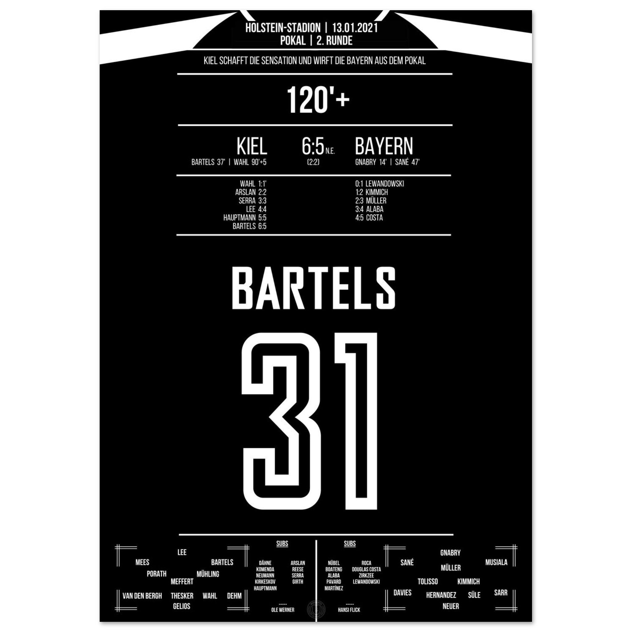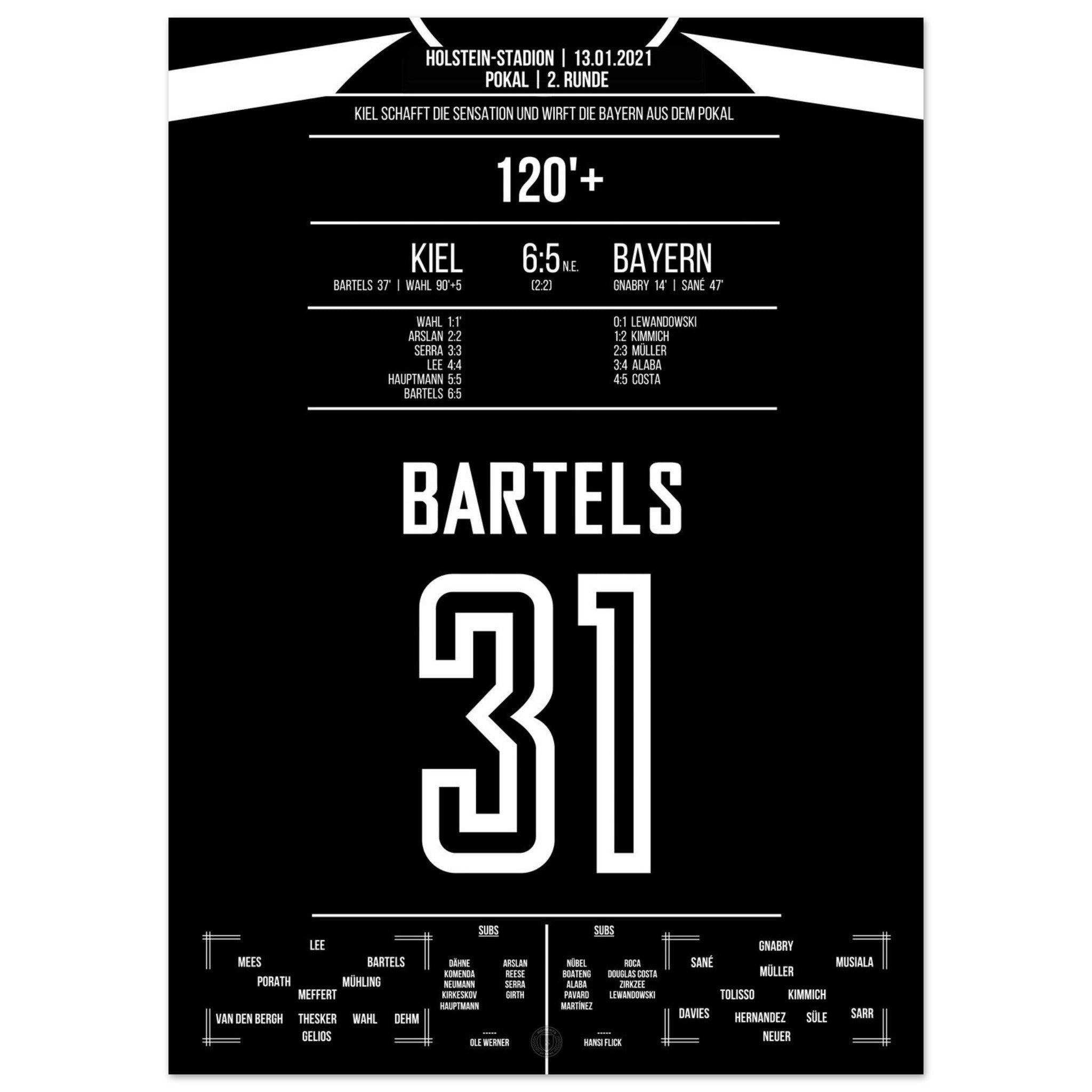 13. Januar 2021 – Kiel vs. Bayern 2:2, 6:5 i. E.: In der zweiten Runde des Pokals trifft Fin Bartels im Elfmeterschießen eiskalt gegen Manuel Neuer und macht den Sensationssieg gegen den Rekordmeister perfekt. Zuvor hatte er bereits das 1:1 erzielt. Unser Poster feiert diesen magischen Pokalabend an der Förde.