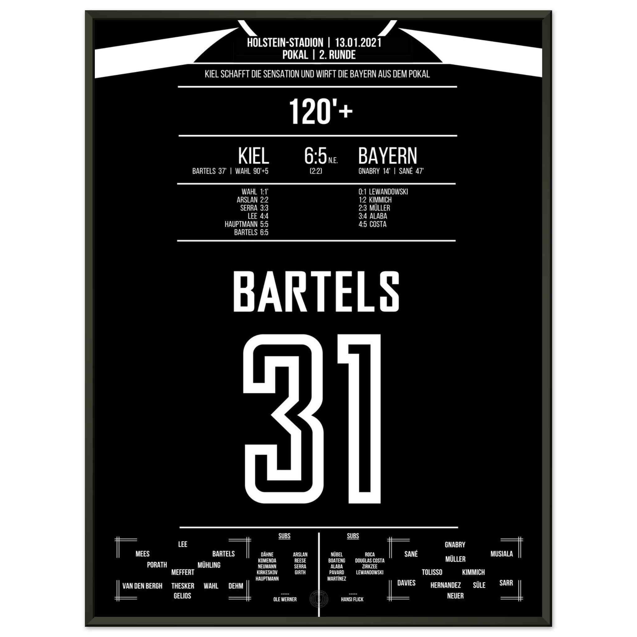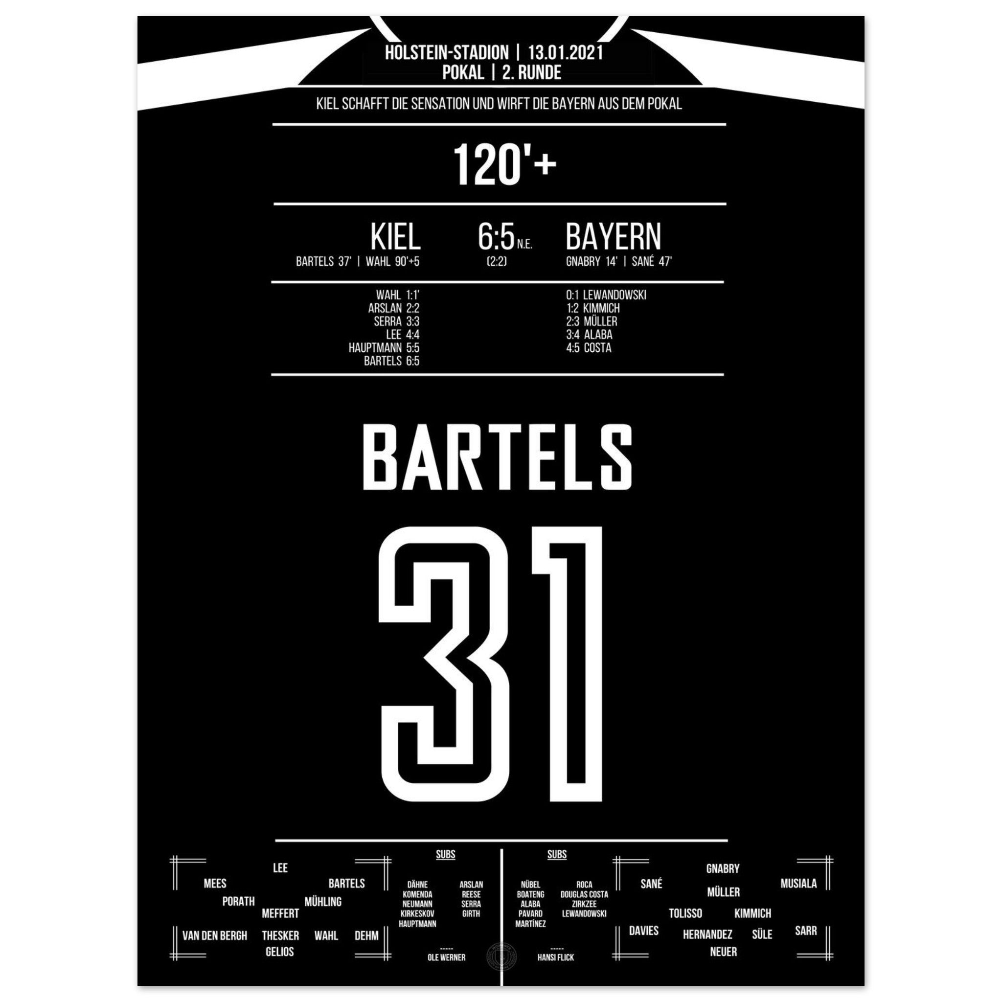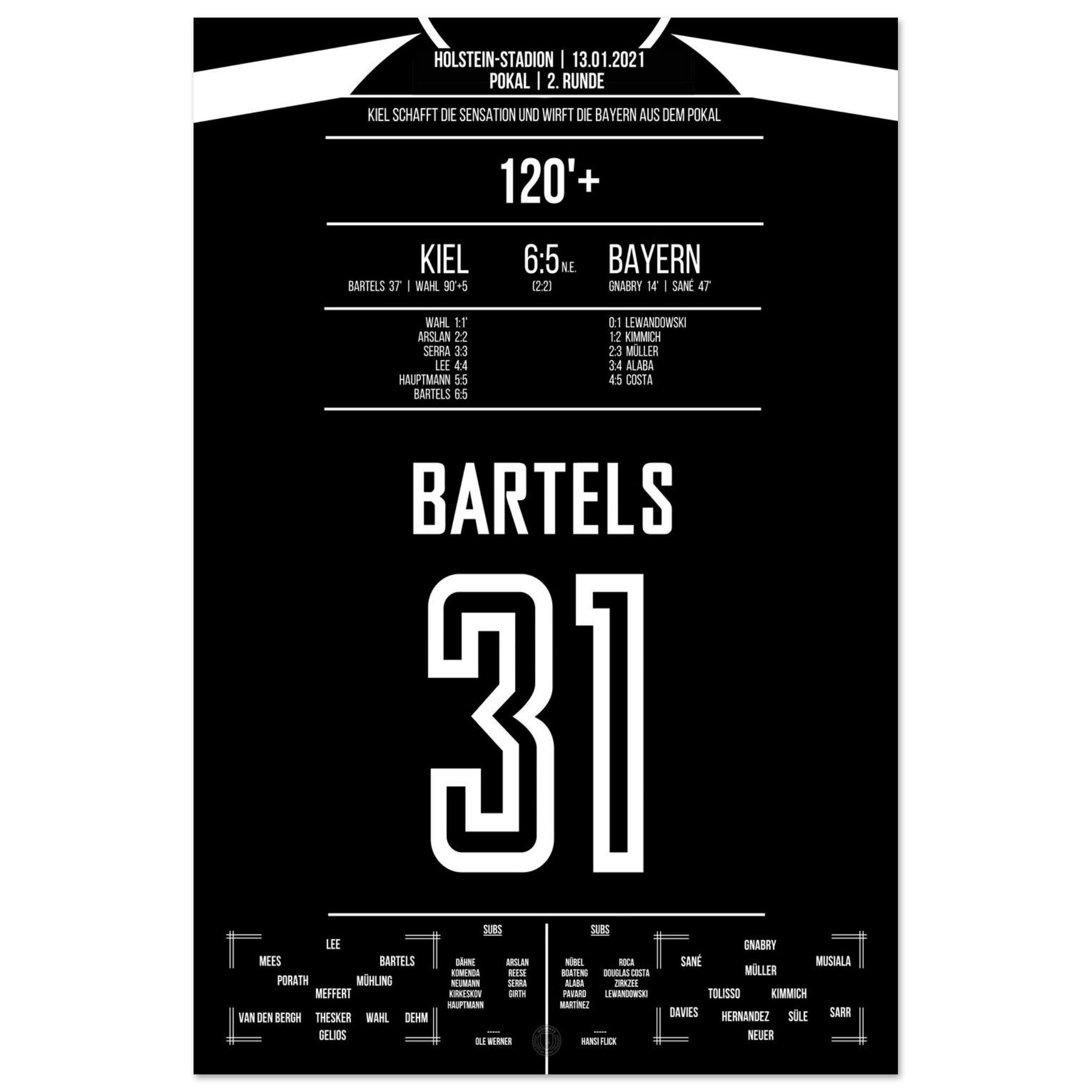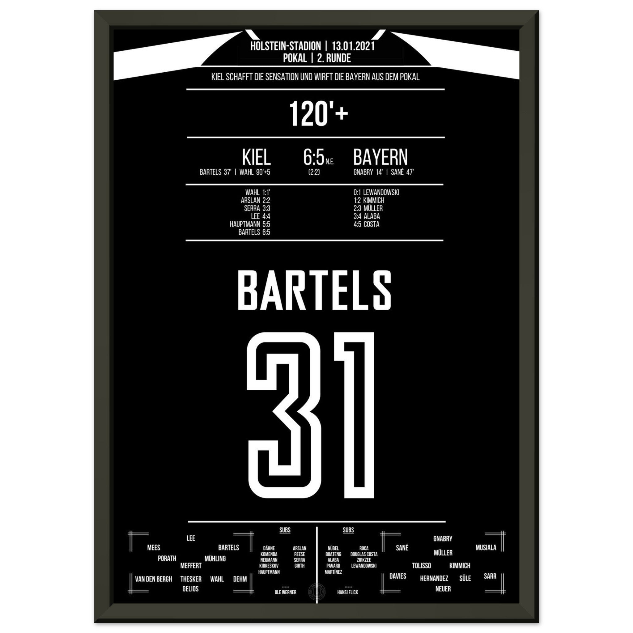 13. Januar 2021 – Kiel vs. Bayern 2:2, 6:5 i. E.: In der zweiten Runde des Pokals trifft Fin Bartels im Elfmeterschießen eiskalt gegen Manuel Neuer und macht den Sensationssieg gegen den Rekordmeister perfekt. Zuvor hatte er bereits das 1:1 erzielt. Unser Poster feiert diesen magischen Pokalabend an der Förde.