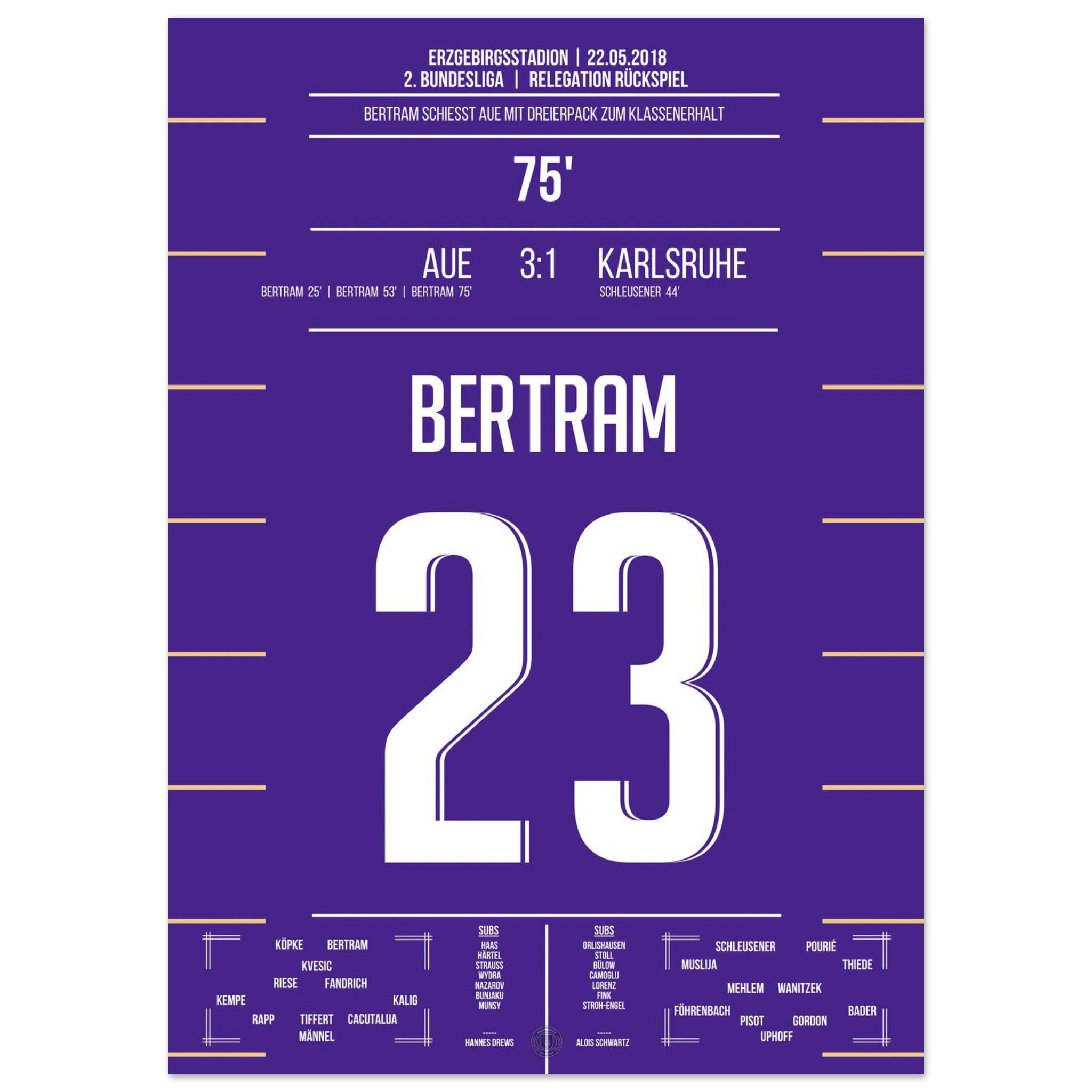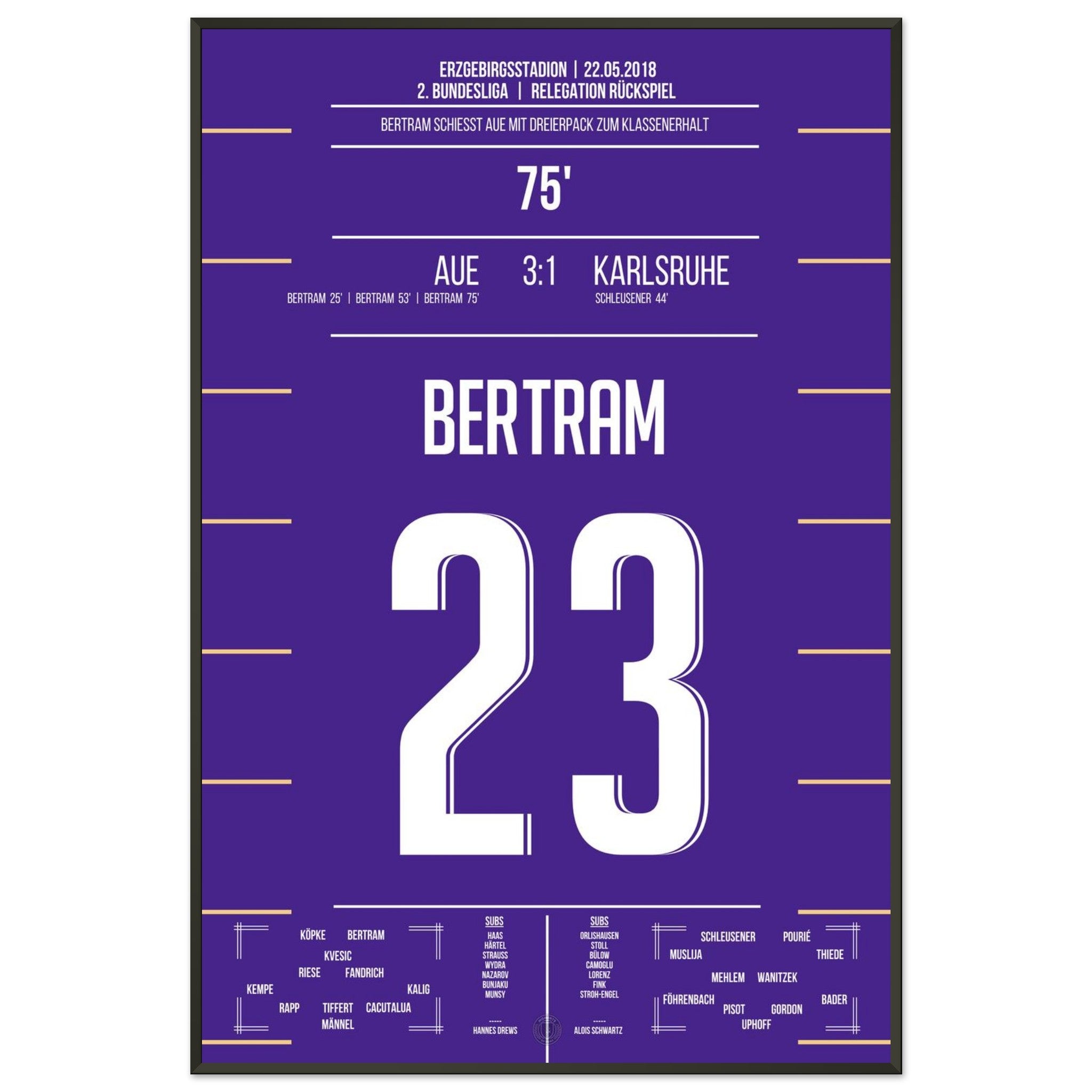 Bertram schnürt einen beeindruckenden Dreierpack und wird zum Matchwinner des Abends. Mit seinem dritten Treffer in der 75. Minute sichert er Aue den Verbleib in der 2. Bundesliga – pure Erleichterung und grenzenloser Jubel auf den Rängen!