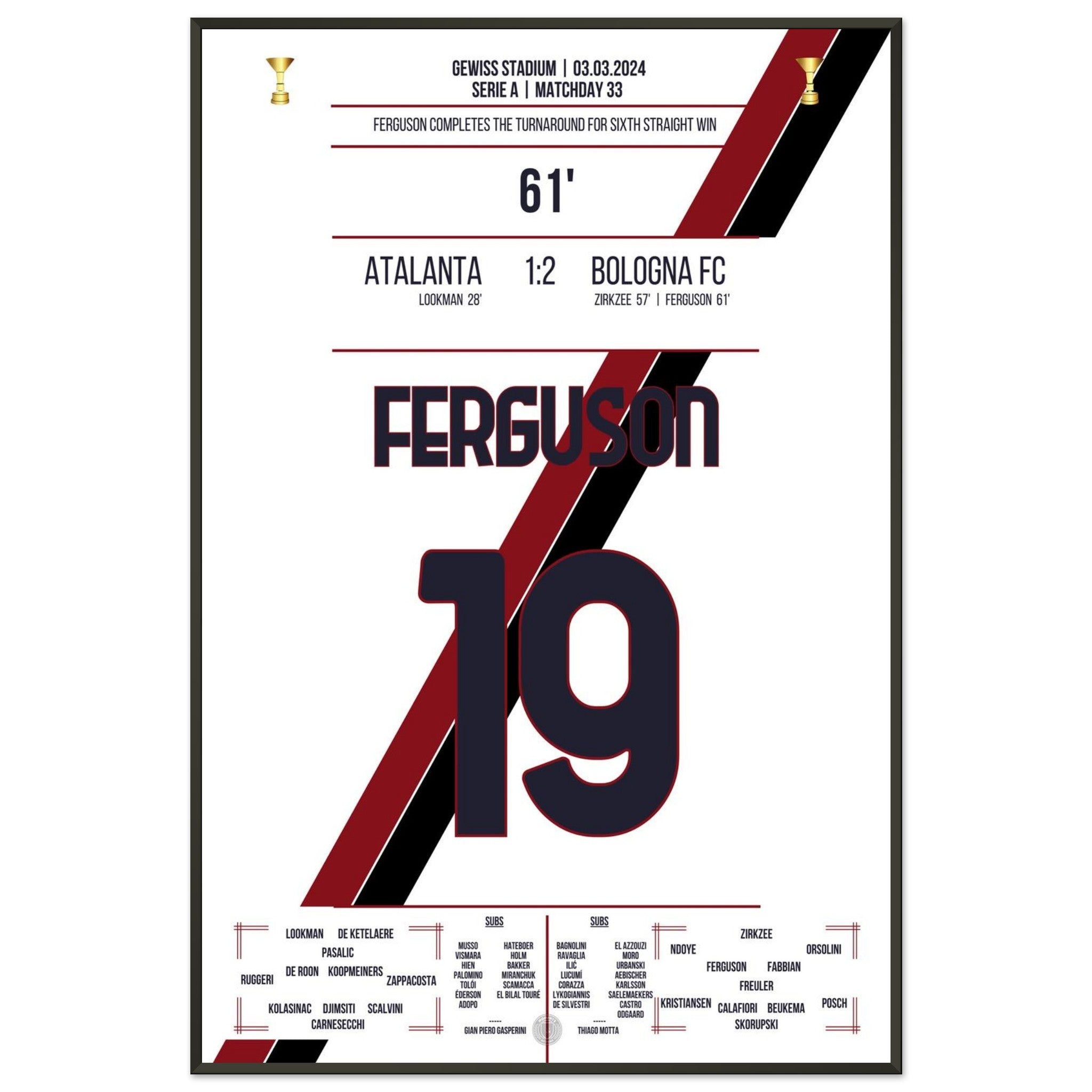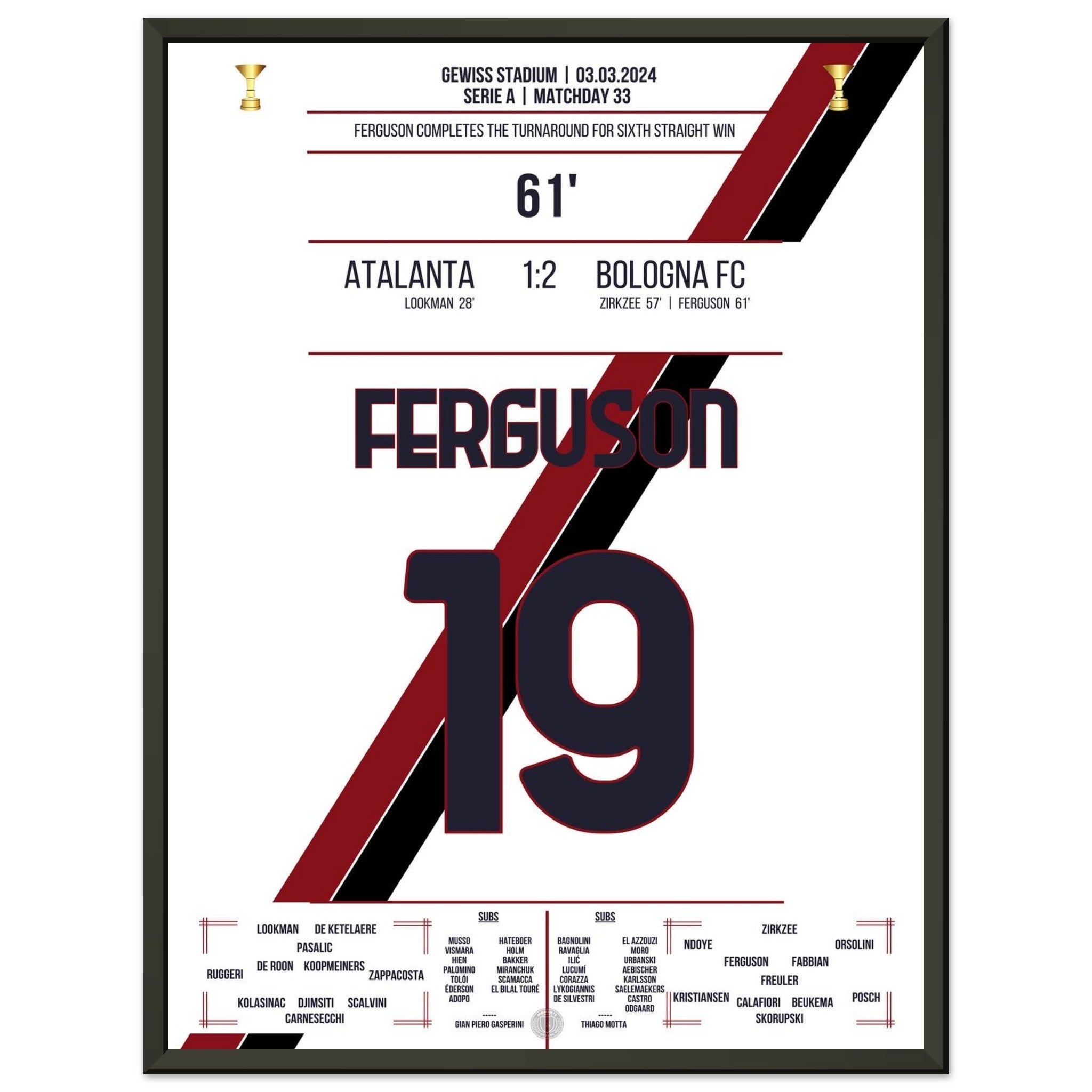 Sie können sicher sein, dass jedes Poster und jeder Rahmen in einer robusten Verpackung versandt wird, damit es in tadellosem Zustand ankommt. Es ist die perfekte Ergänzung für die Sammlung eines jeden Fußballfans oder das perfekte Geschenk für den eingefleischten Fußball-Fan ihres Freundes- oder Familienkreises.
