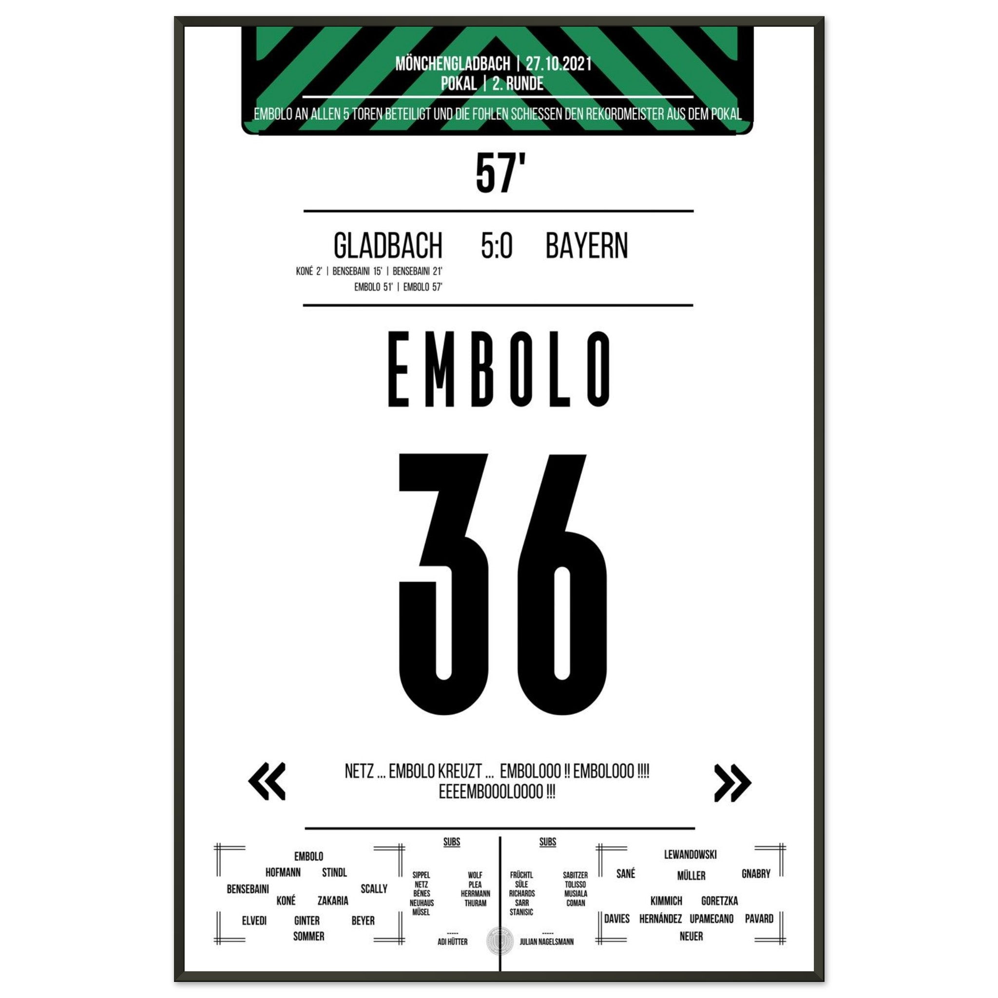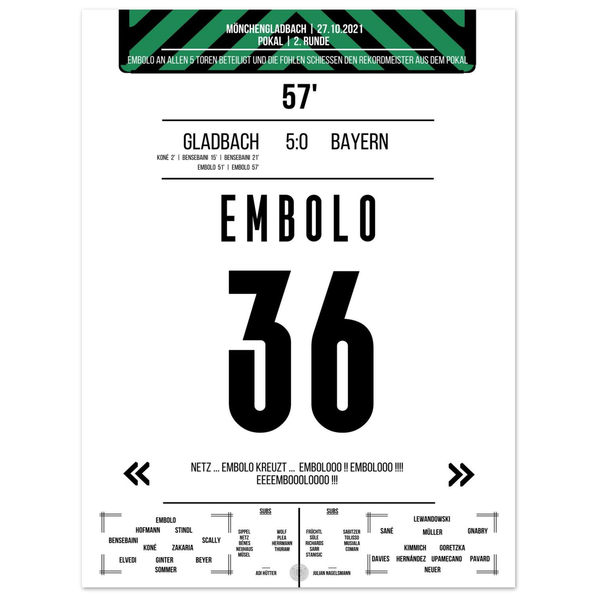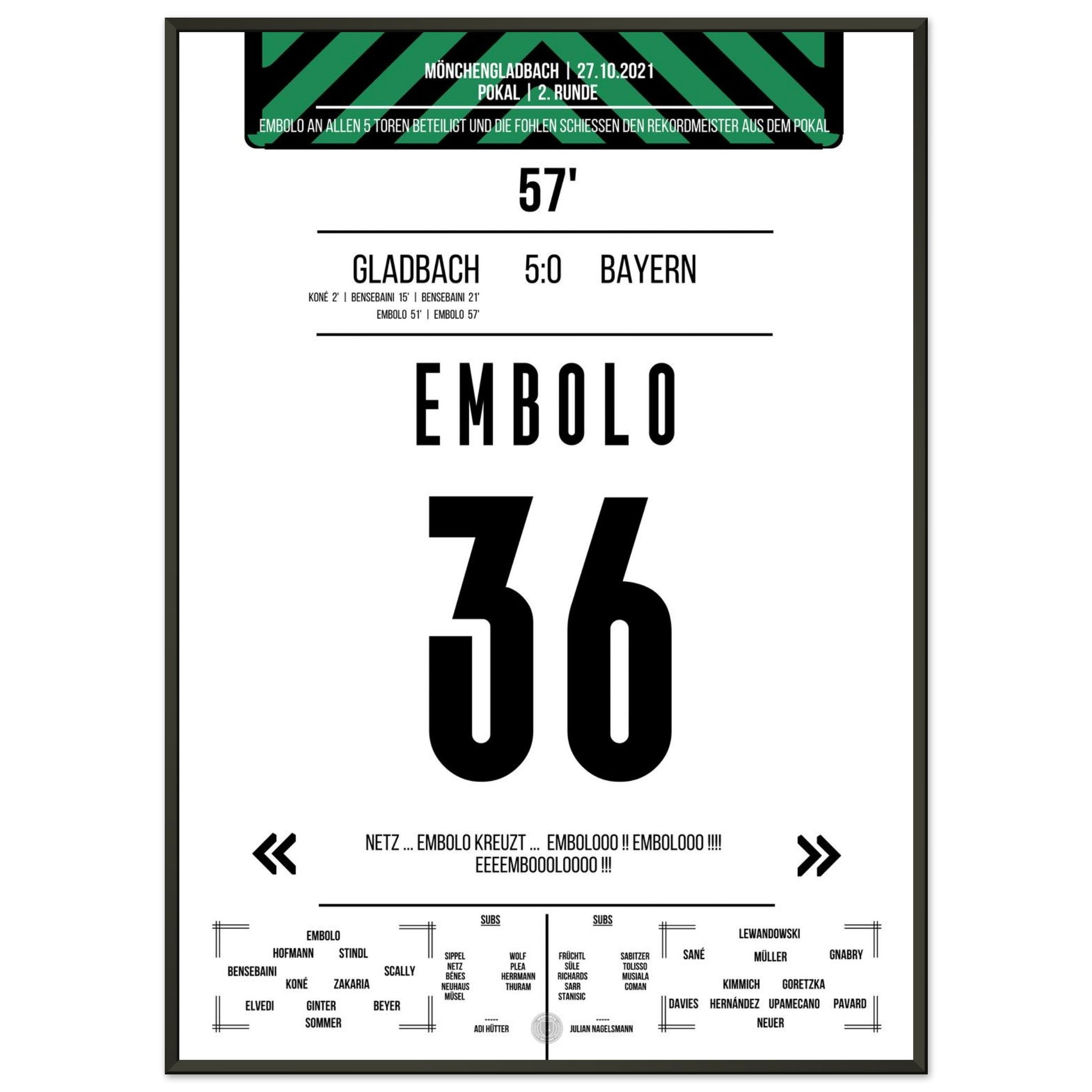 Ein Abend, der in die Vereinsgeschichte eingeht: Gladbach demontiert den Rekordmeister im Pokal mit 5:0. Breel Embolo trifft doppelt und ist Sinnbild einer entfesselten Fohlenelf, die dem Favoriten keine Chance lässt. Ein magischer Abend im Borussia-Park.