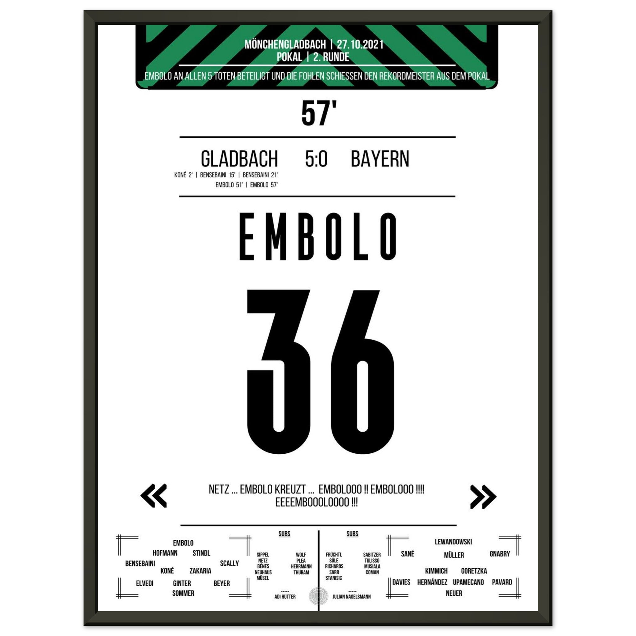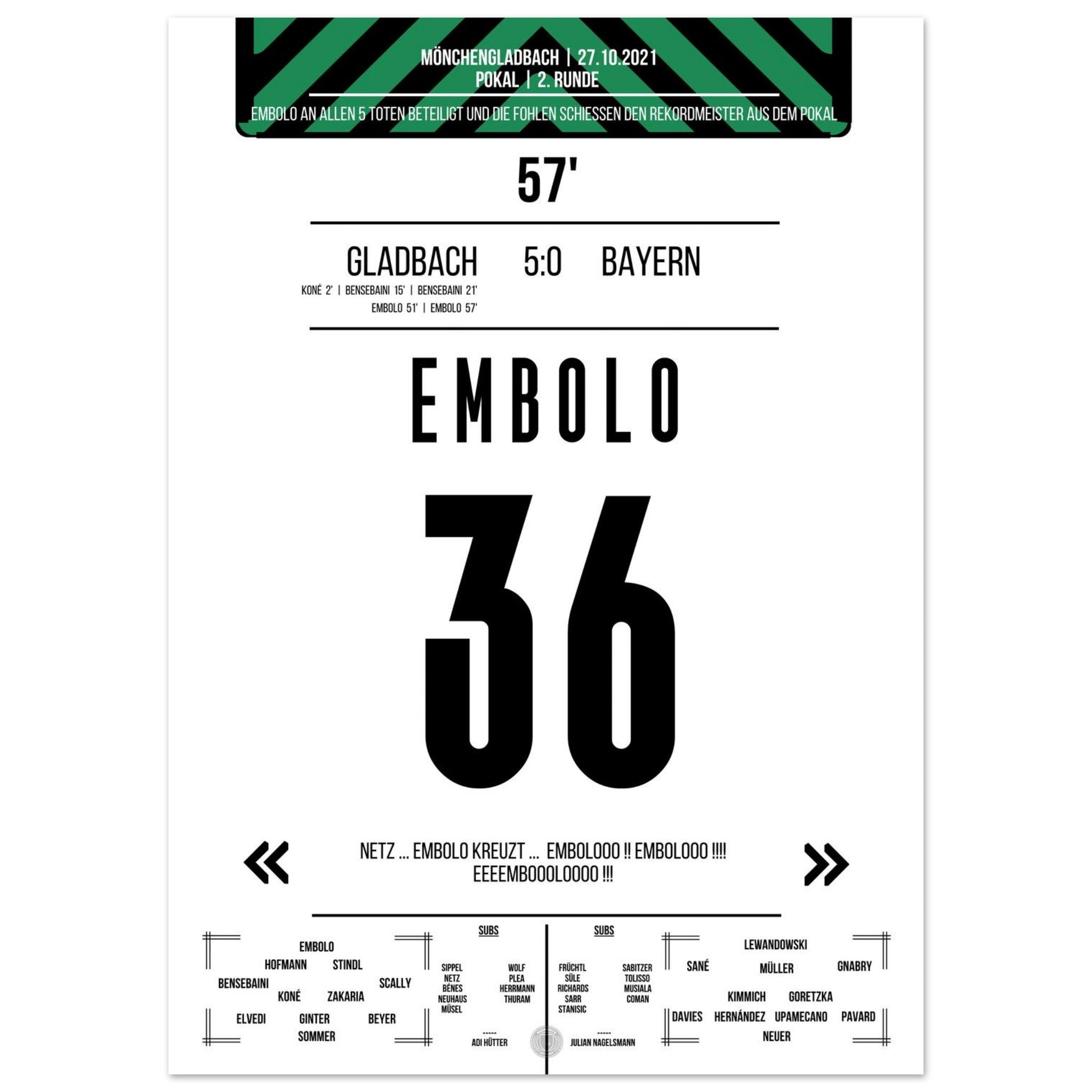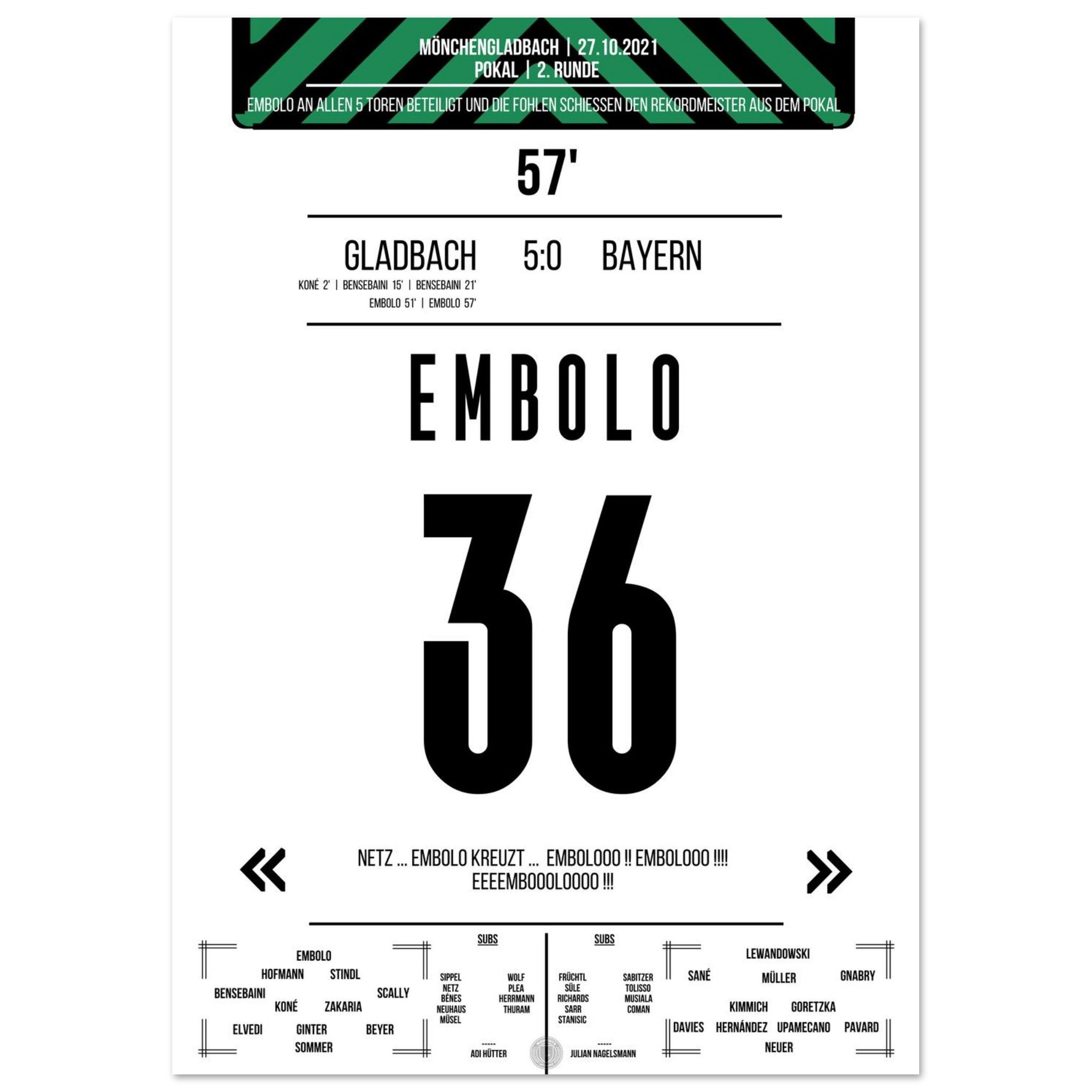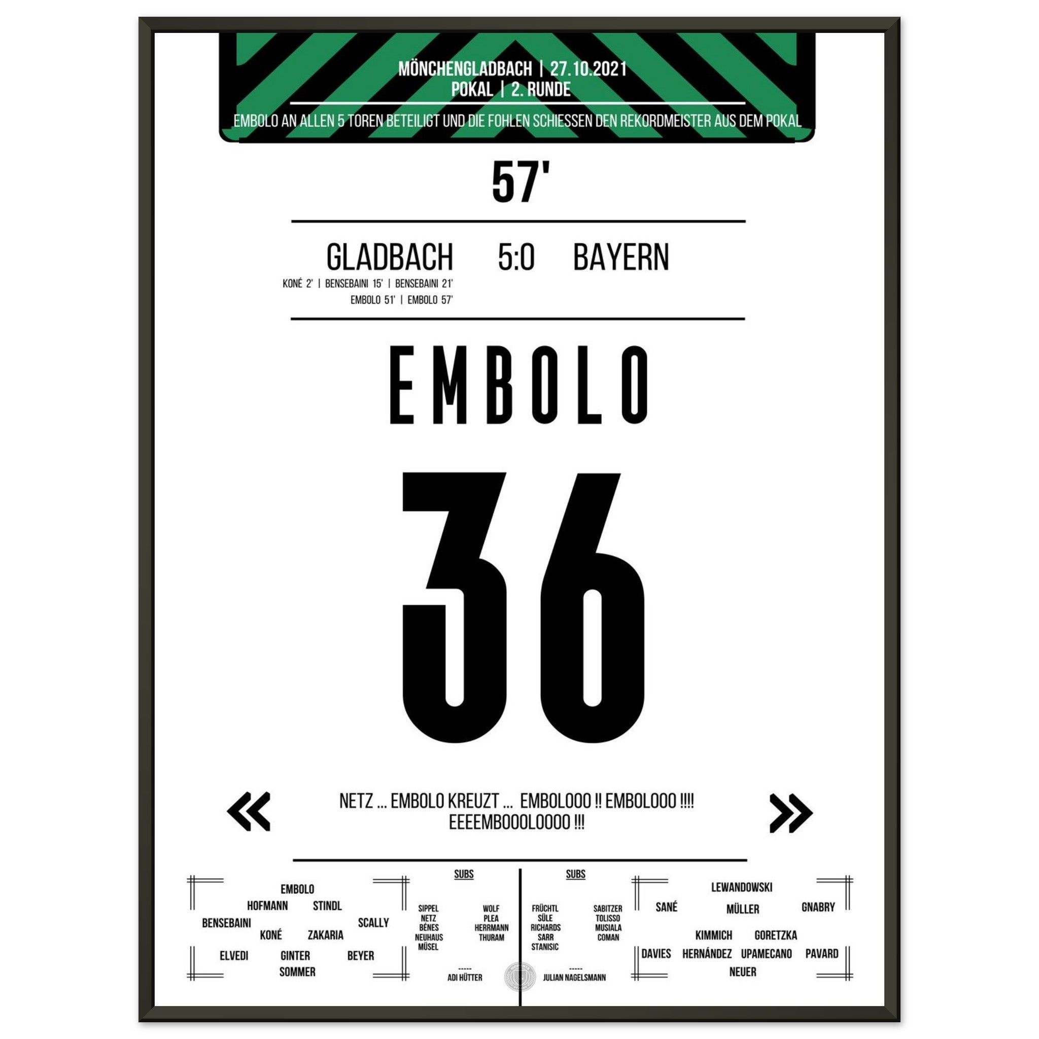 Ein Abend, der in die Vereinsgeschichte eingeht: Gladbach demontiert den Rekordmeister im Pokal mit 5:0. Breel Embolo trifft doppelt und ist Sinnbild einer entfesselten Fohlenelf, die dem Favoriten keine Chance lässt. Ein magischer Abend im Borussia-Park.
