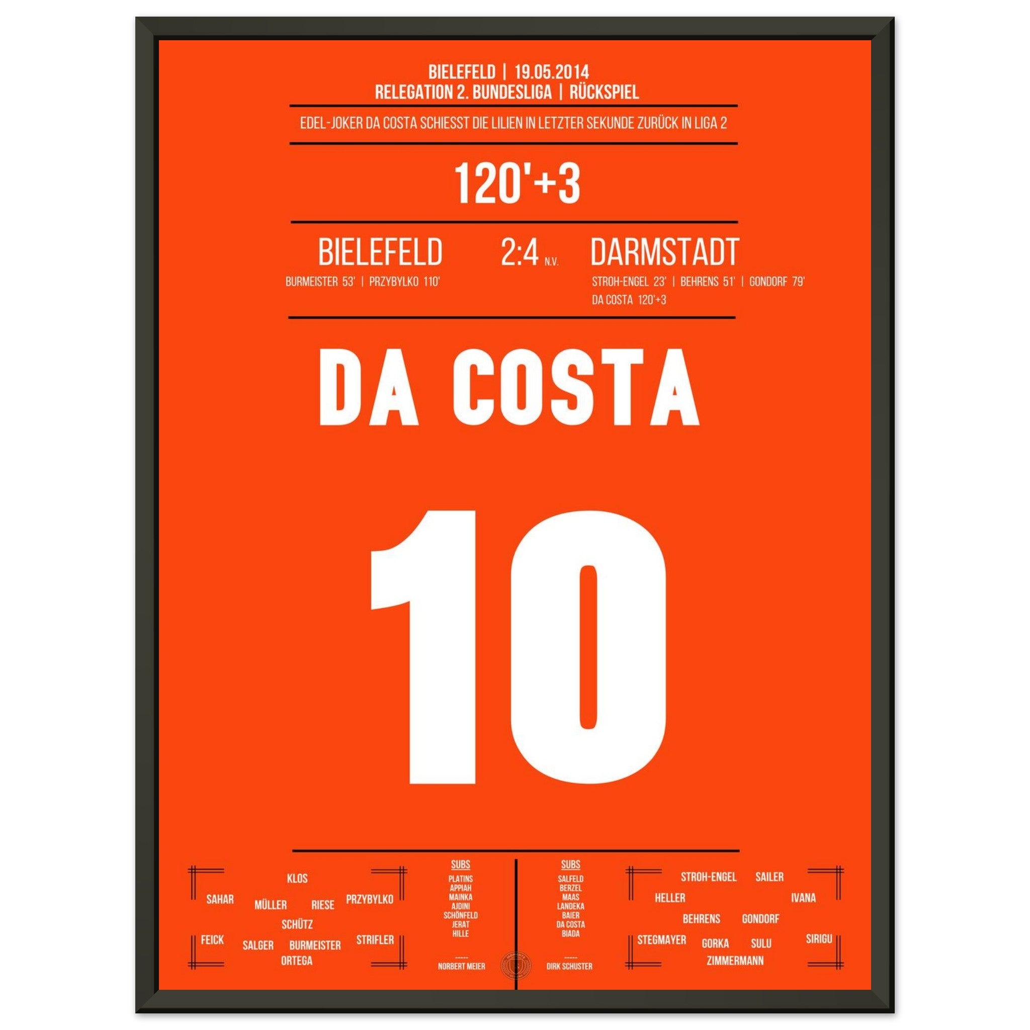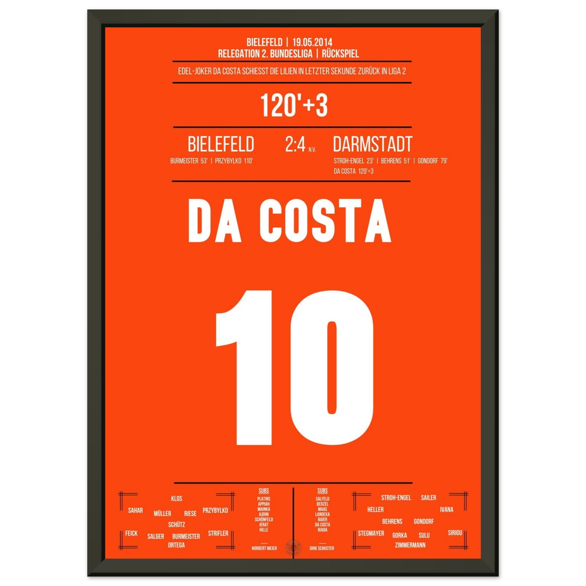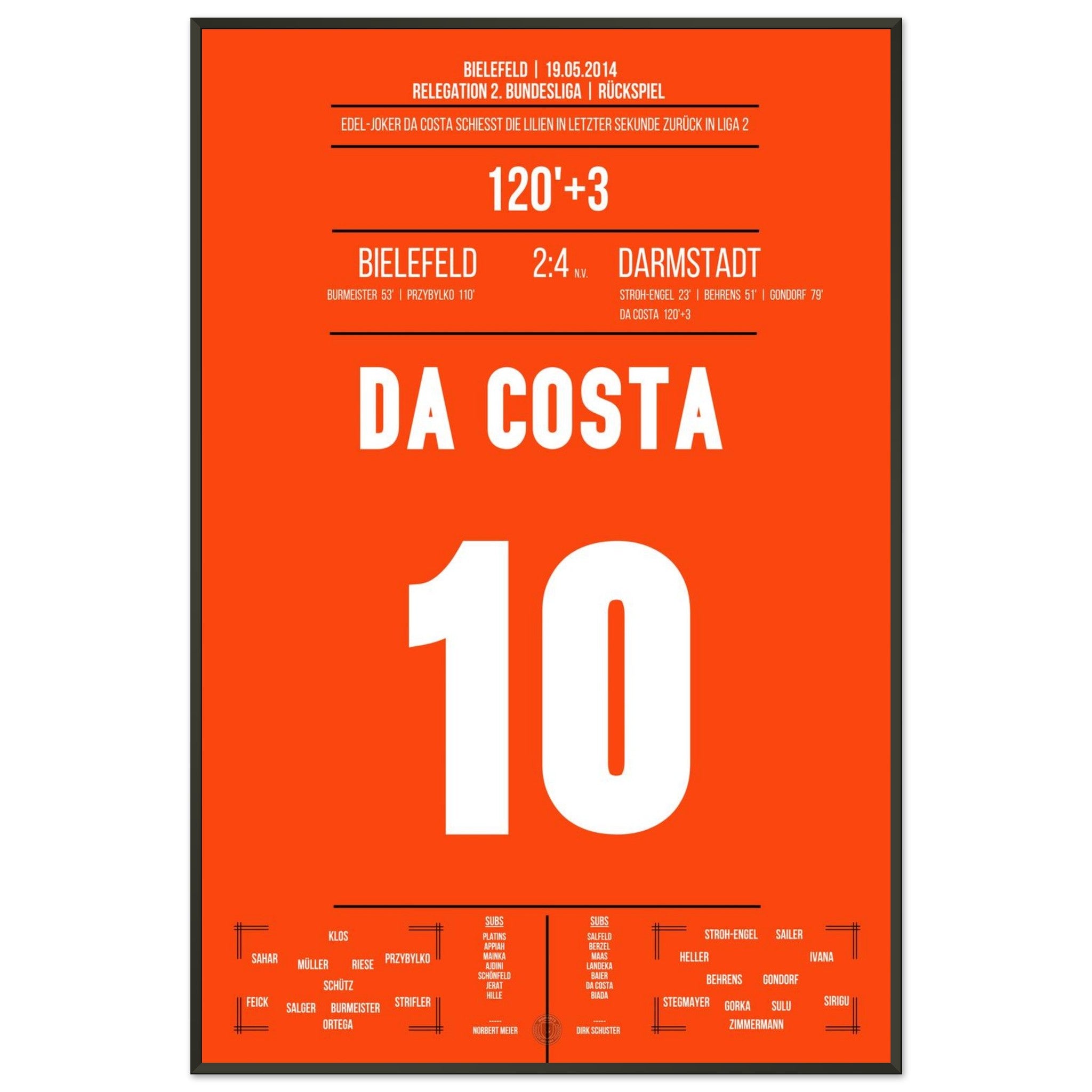 19. Mai 2014 – Bielefeld vs. Darmstadt  2:4 (n. V.): Im dramatischen Relegations-Rückspiel erzielt da Costa das 3:1 in der Verlängerung und bringt die Lilien dem Bundesliga-Aufstieg einen Schritt näher. Es war der Beginn des „Wunders von Bielefeld“. Das dazugehörige Poster fängt diesen unvergesslichen Moment ein.