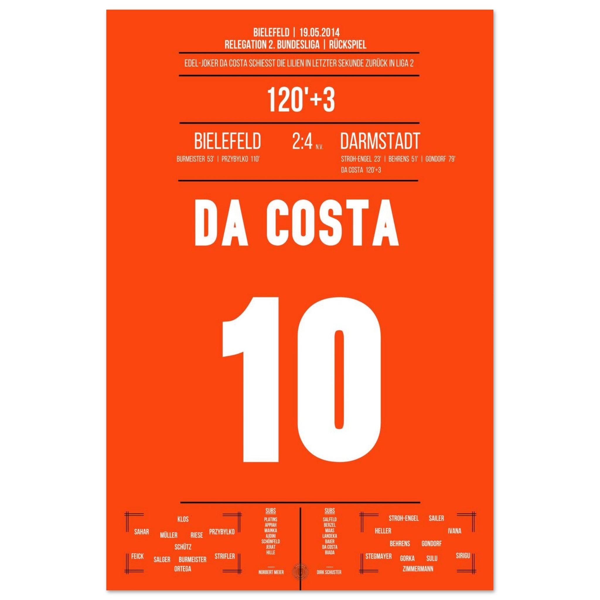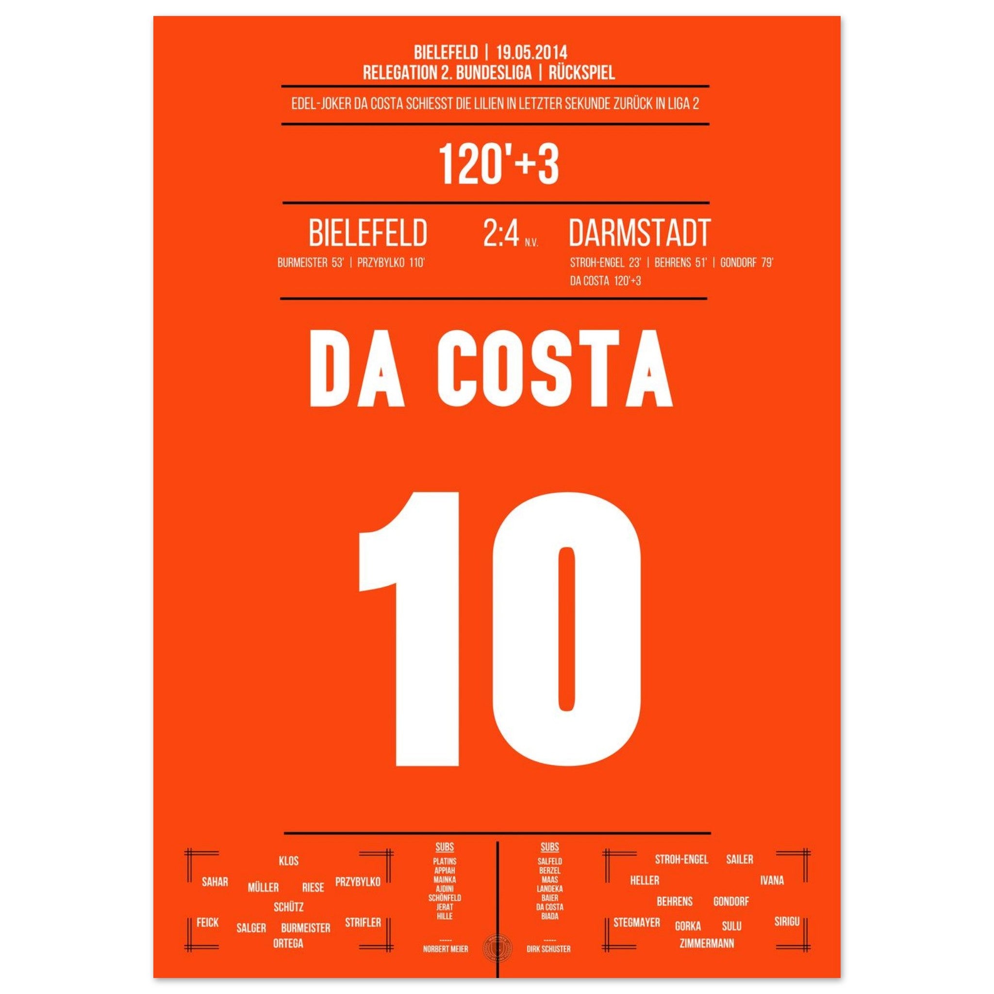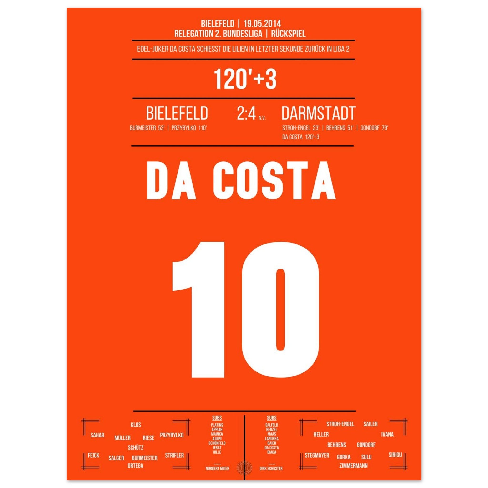 19. Mai 2014 – Bielefeld vs. Darmstadt  2:4 (n. V.): Im dramatischen Relegations-Rückspiel erzielt da Costa das 3:1 in der Verlängerung und bringt die Lilien dem Bundesliga-Aufstieg einen Schritt näher. Es war der Beginn des „Wunders von Bielefeld“. Das dazugehörige Poster fängt diesen unvergesslichen Moment ein.
