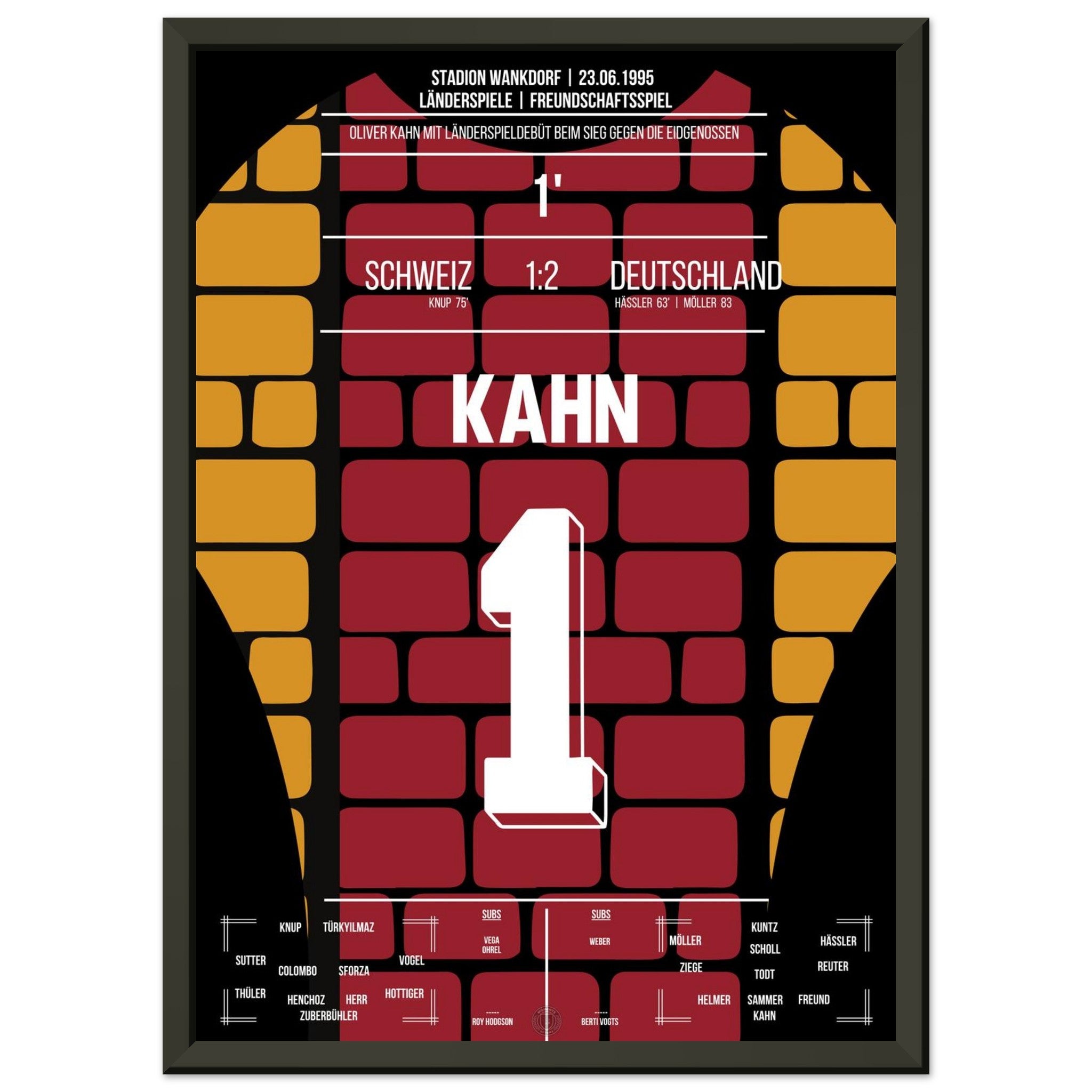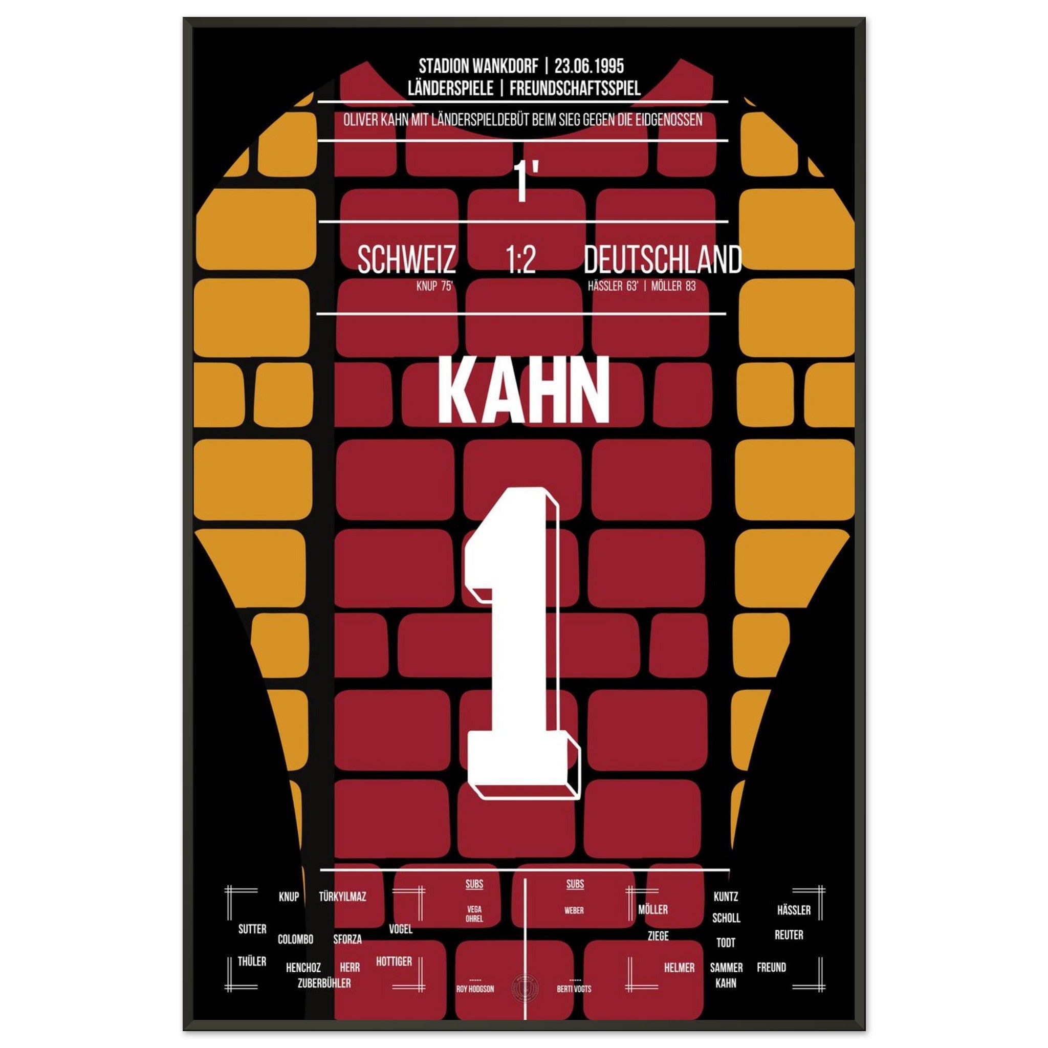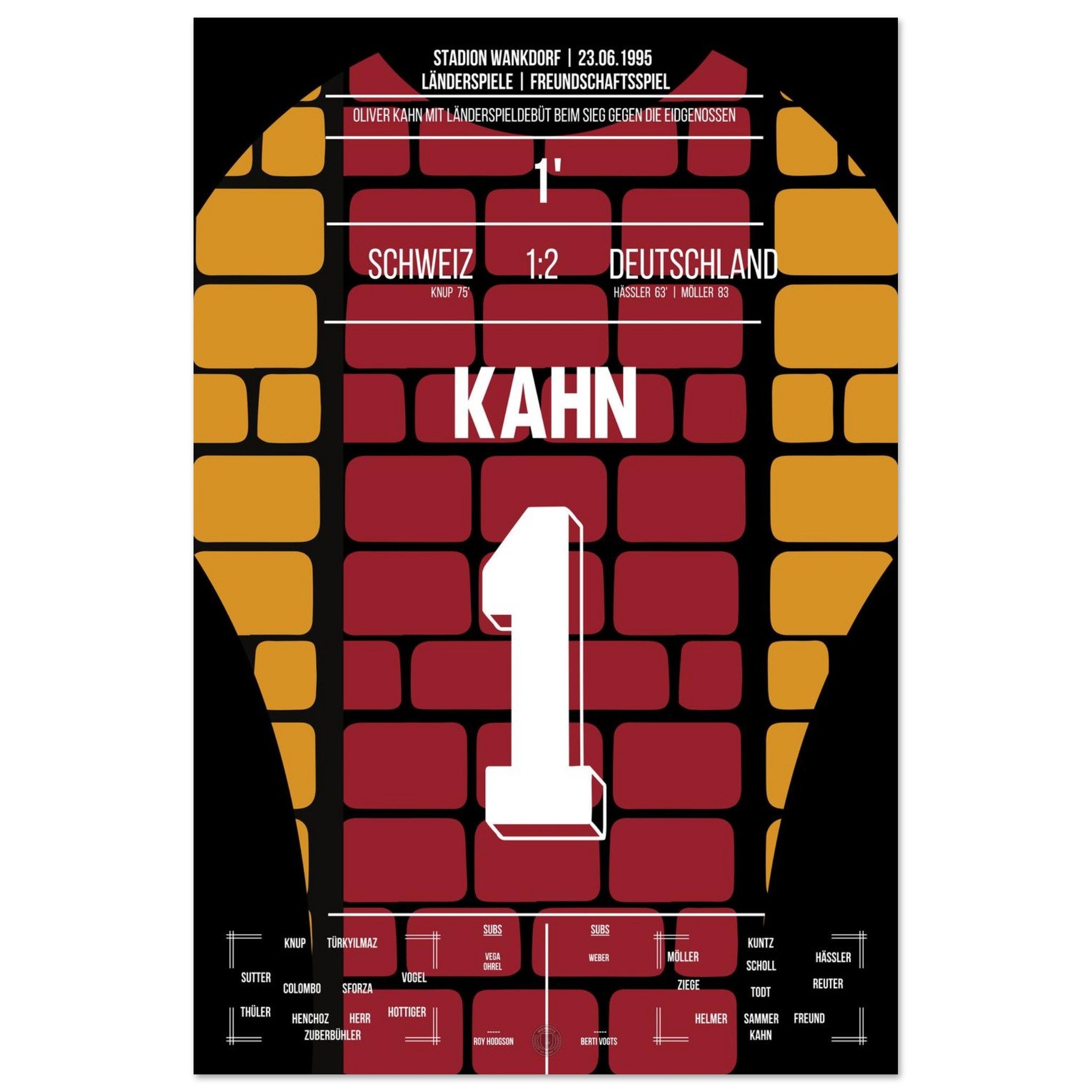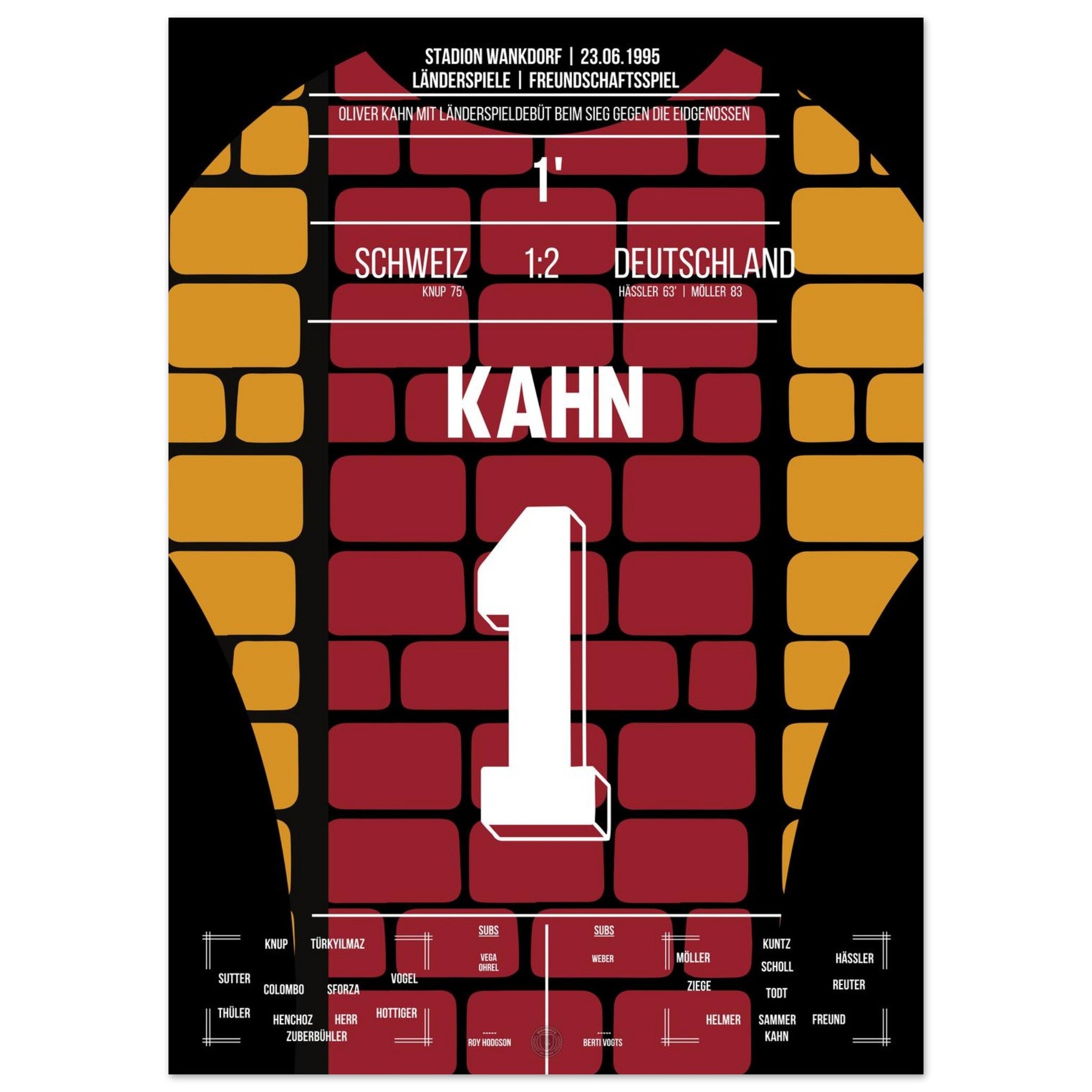 23. Juni 1995 – Deutschland vs. Schweiz 2:1: In Zürich gibt Oliver Kahn sein Debüt im Trikot der Nationalmannschaft – der Beginn einer legendären Torwartkarriere. Ruhig, souverän, unübersehbar: Die Ära des Titanen nimmt ihren Anfang. Unser Poster würdigt den ersten Auftritt einer Ikone.