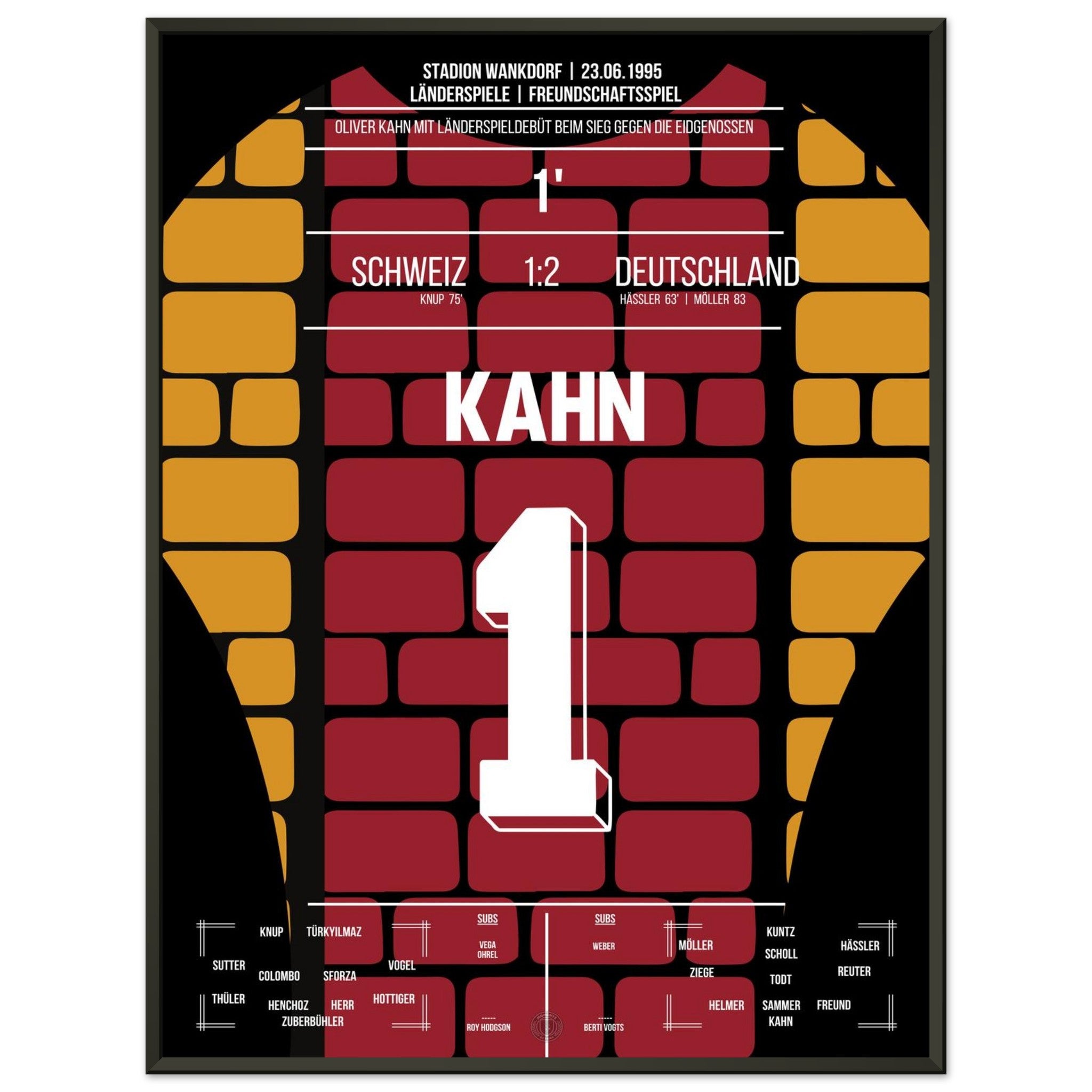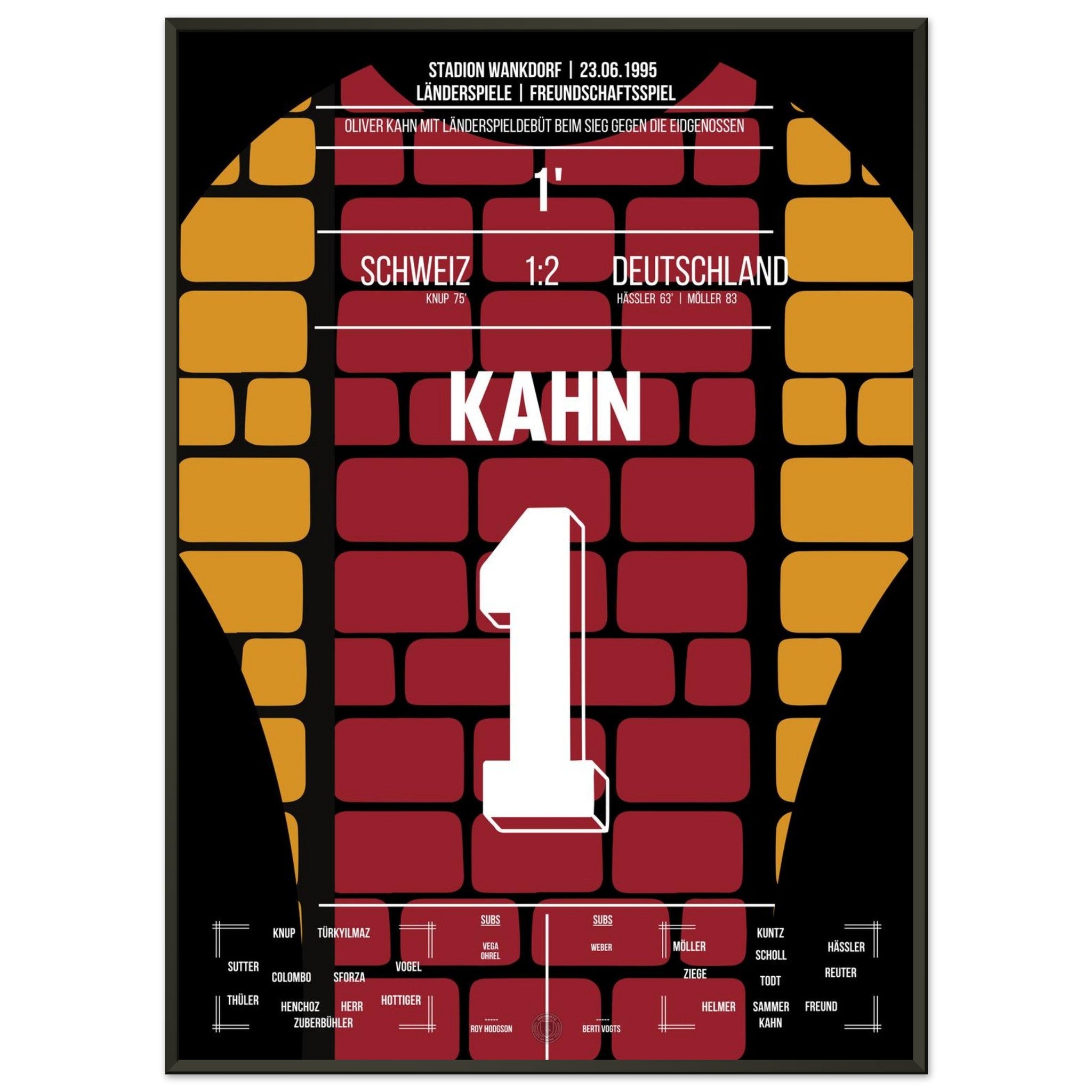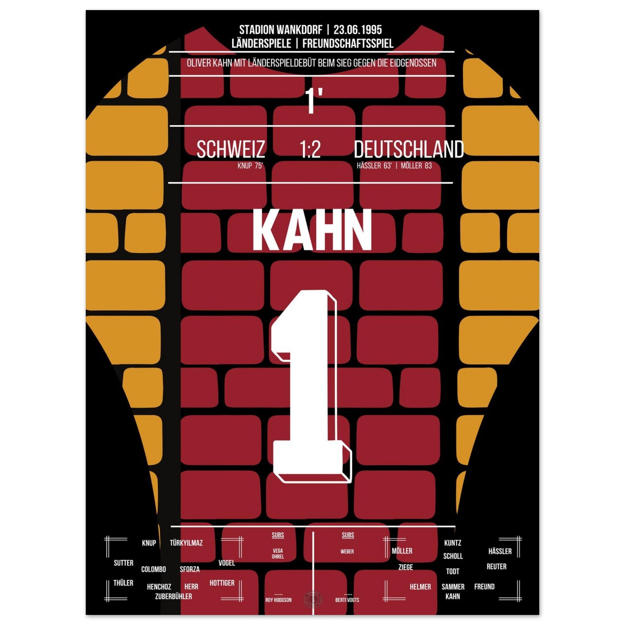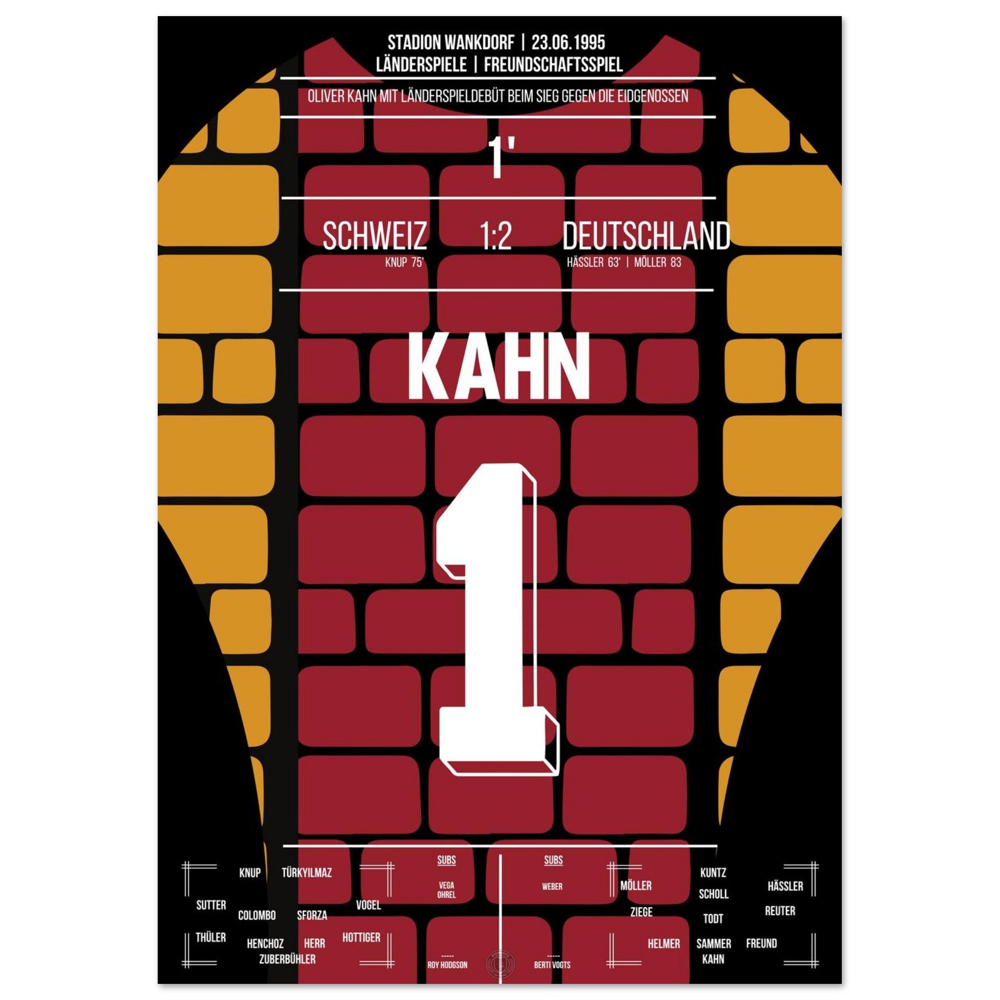 23. Juni 1995 – Deutschland vs. Schweiz 2:1: In Zürich gibt Oliver Kahn sein Debüt im Trikot der Nationalmannschaft – der Beginn einer legendären Torwartkarriere. Ruhig, souverän, unübersehbar: Die Ära des Titanen nimmt ihren Anfang. Unser Poster würdigt den ersten Auftritt einer Ikone.