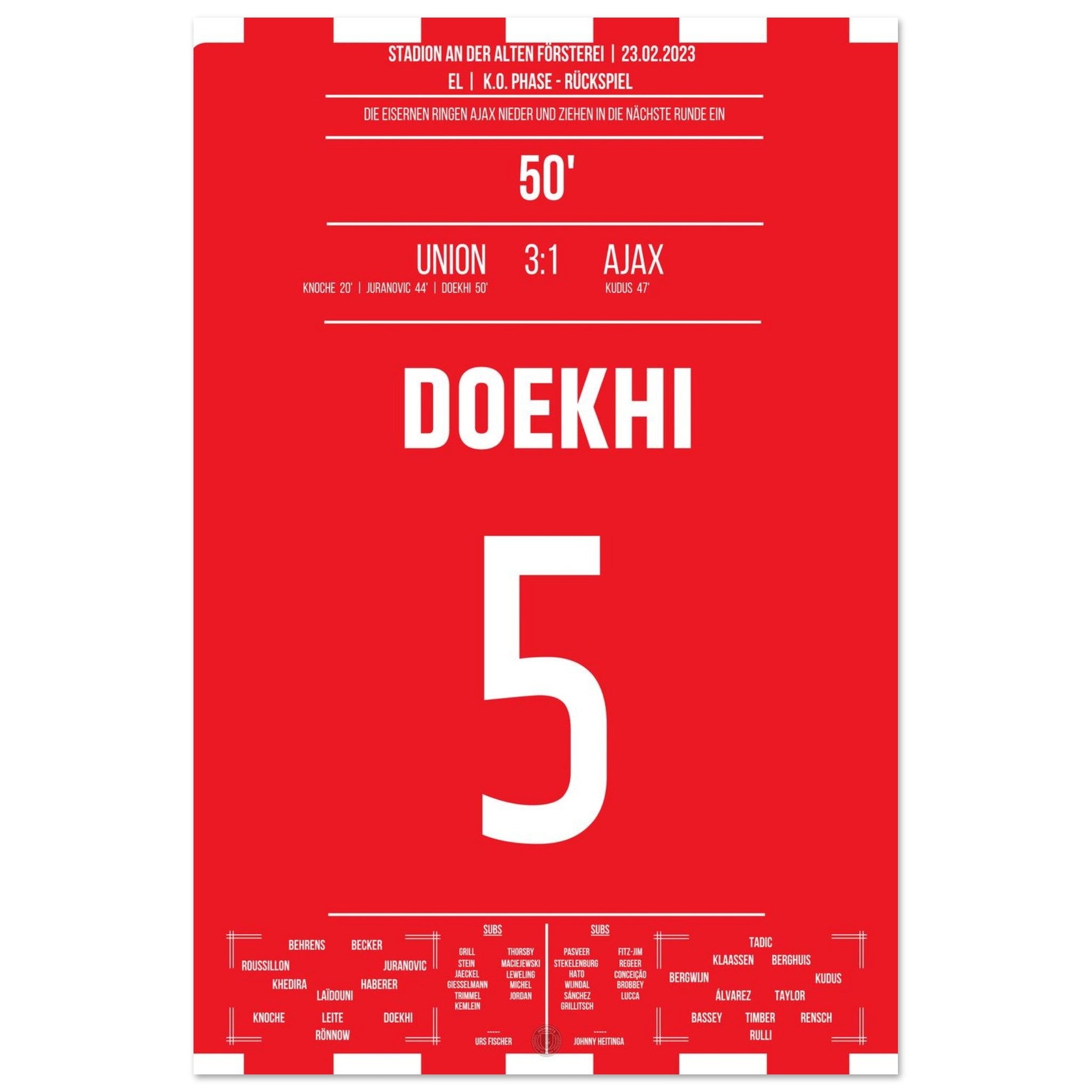 23. Februar 2023 – Berlin vs. Amsterdam 3:1: In der 50. Minute steigt Danilho Doekhi nach einem Eckball am höchsten und köpft das 2:0 gegen Ajax – mitten im vollen Stadion An der Alten Försterei. Mit seinem Treffer ebnet er Union den Weg ins Achtelfinale. Unser Poster hält diesen magischen Europapokal-Moment fest.