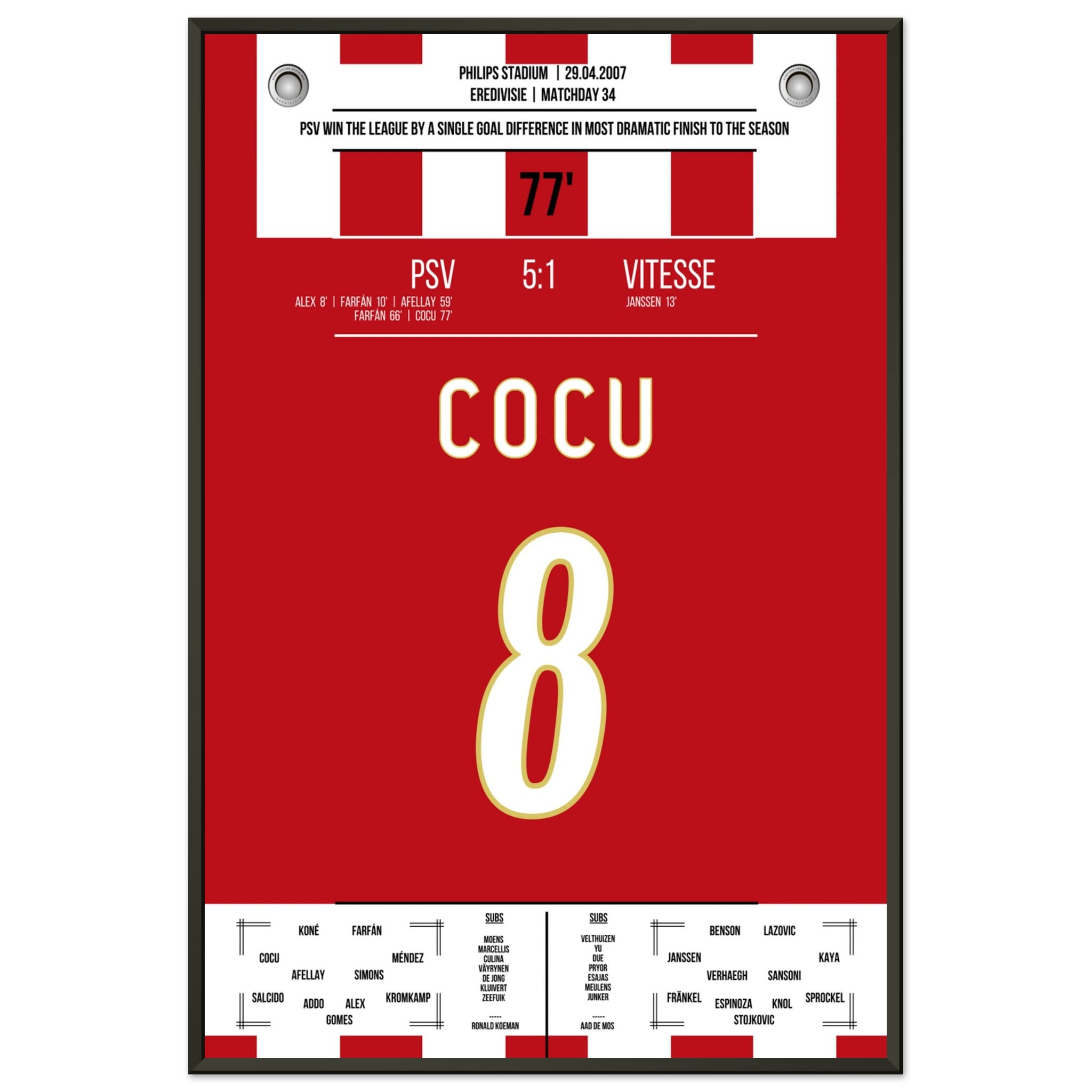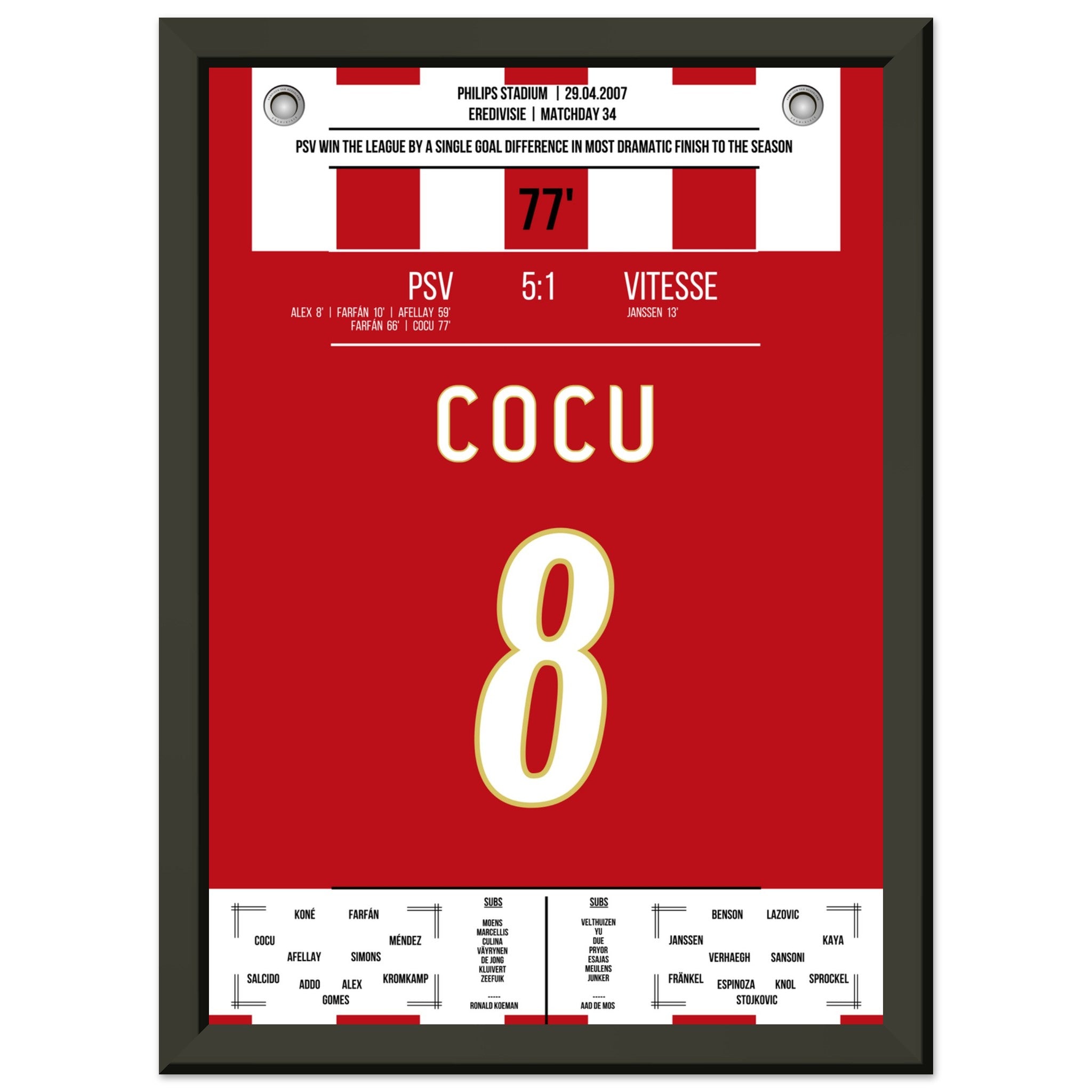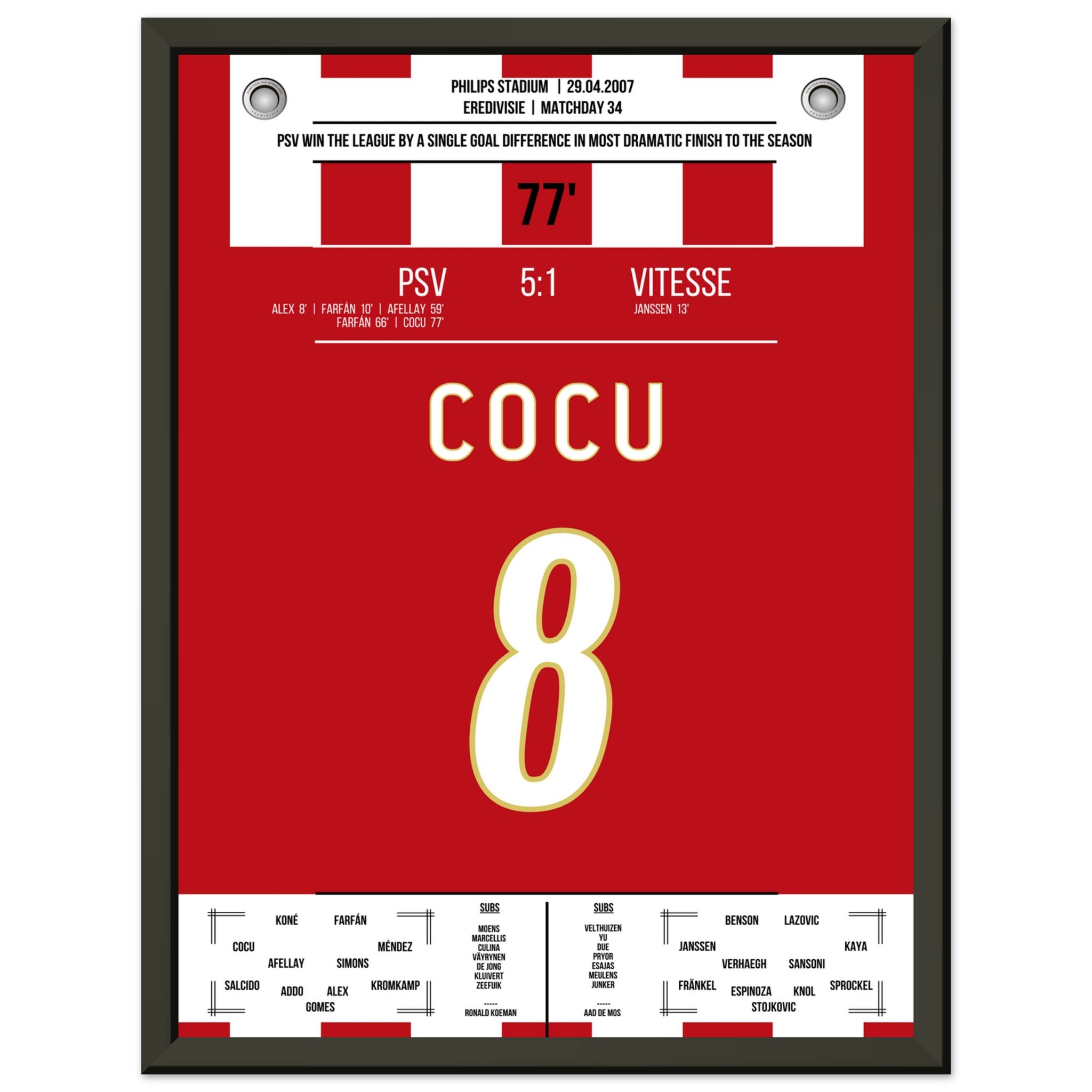 Sie können sicher sein, dass jedes Poster und jeder Rahmen in einer robusten Verpackung versandt wird, damit es in tadellosem Zustand ankommt. Es ist die perfekte Ergänzung für die Sammlung eines jeden Fußballfans oder das perfekte Geschenk für den eingefleischten Fußball-Fan ihres Freundes- oder Familienkreises.