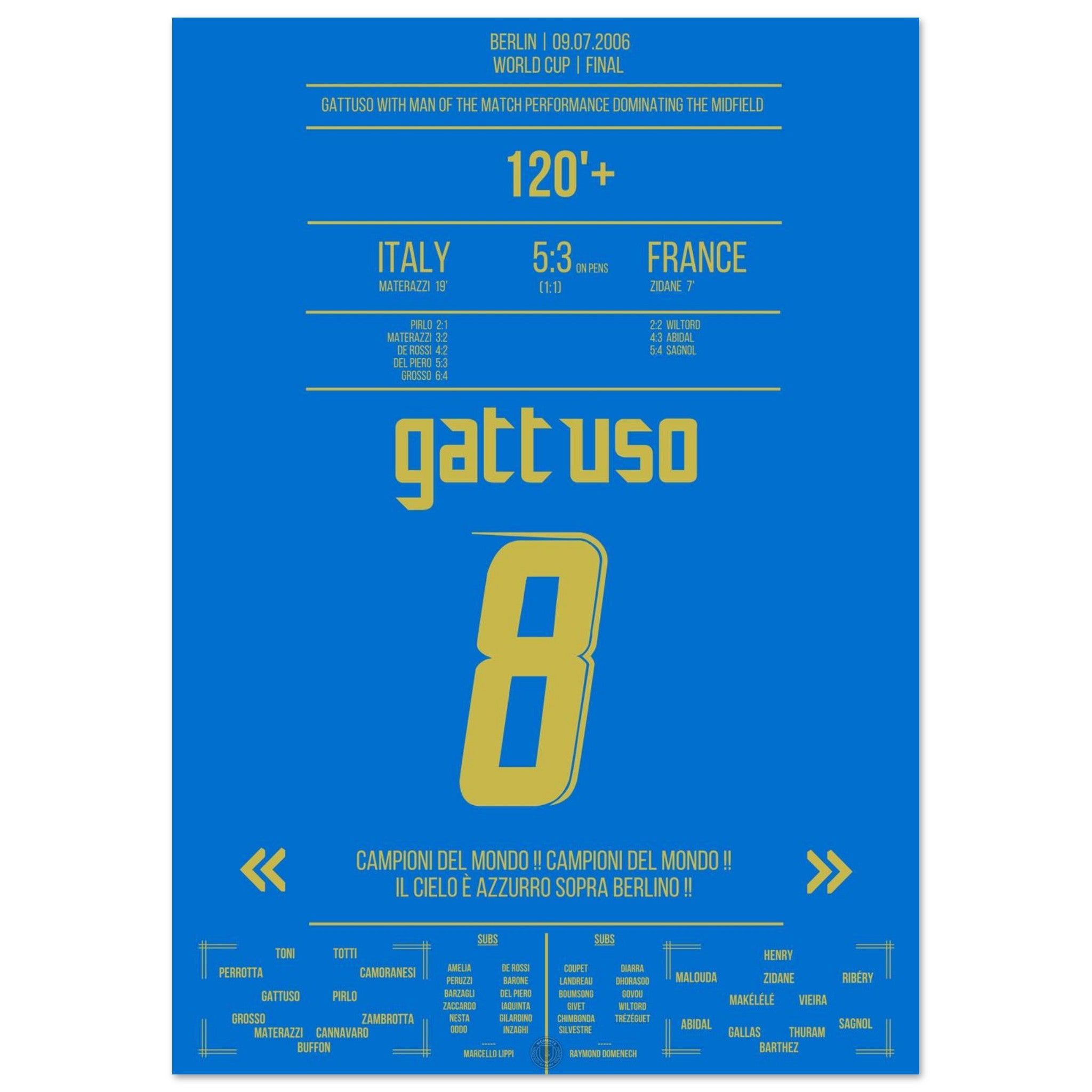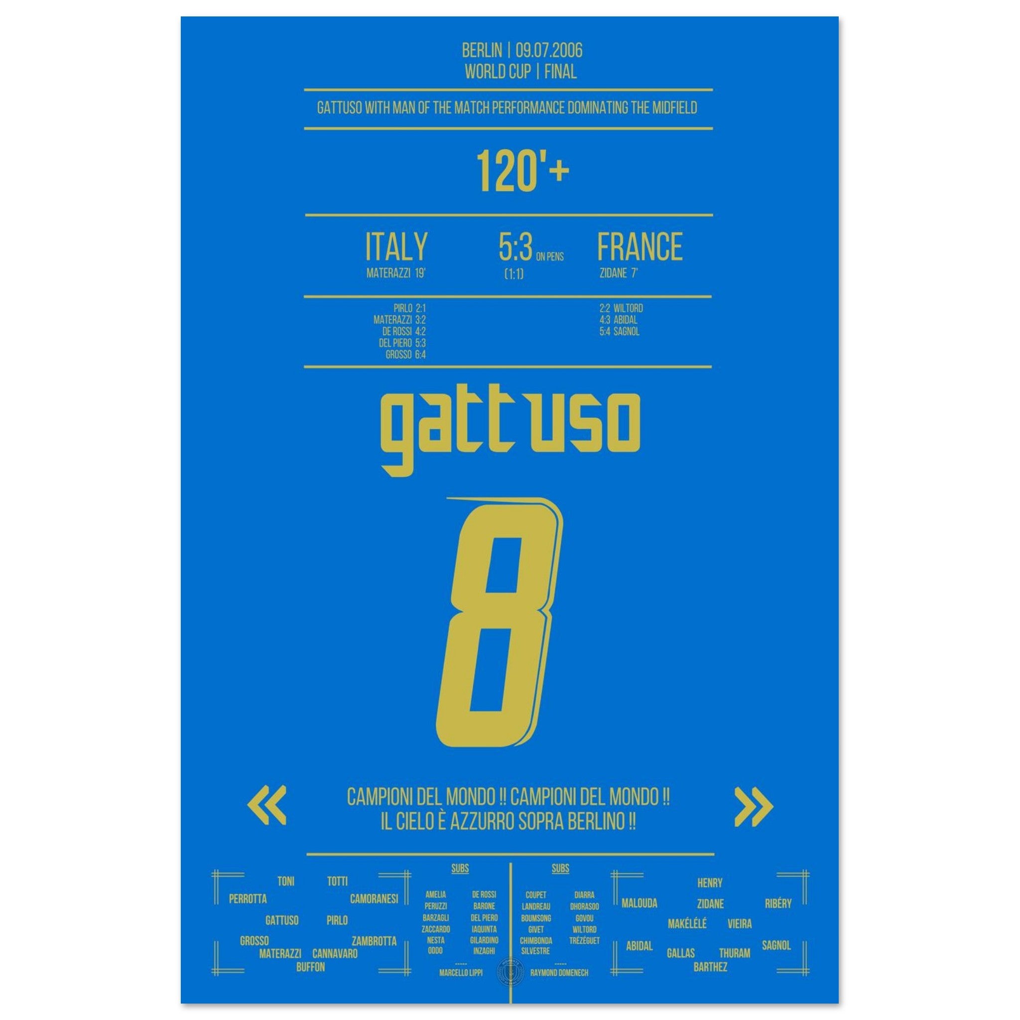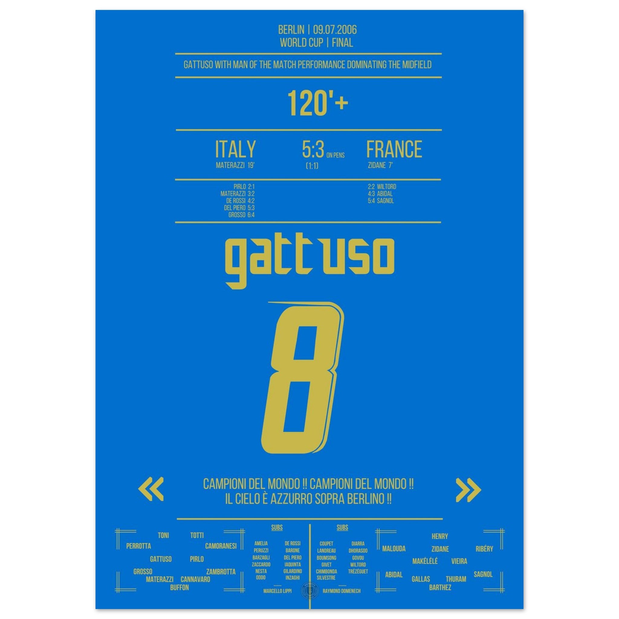 Im WM-Finale von Berlin kämpft Gennaro Gattuso wie ein Löwe. Mit unermüdlichem Einsatz, Leidenschaft und purer Entschlossenheit treibt er seine Mannschaft an – Sinnbild für Italiens unerschütterlichen Willen. Am Ende krönt sich die Squadra Azzurra im Elfmeterschießen zum Weltmeister.