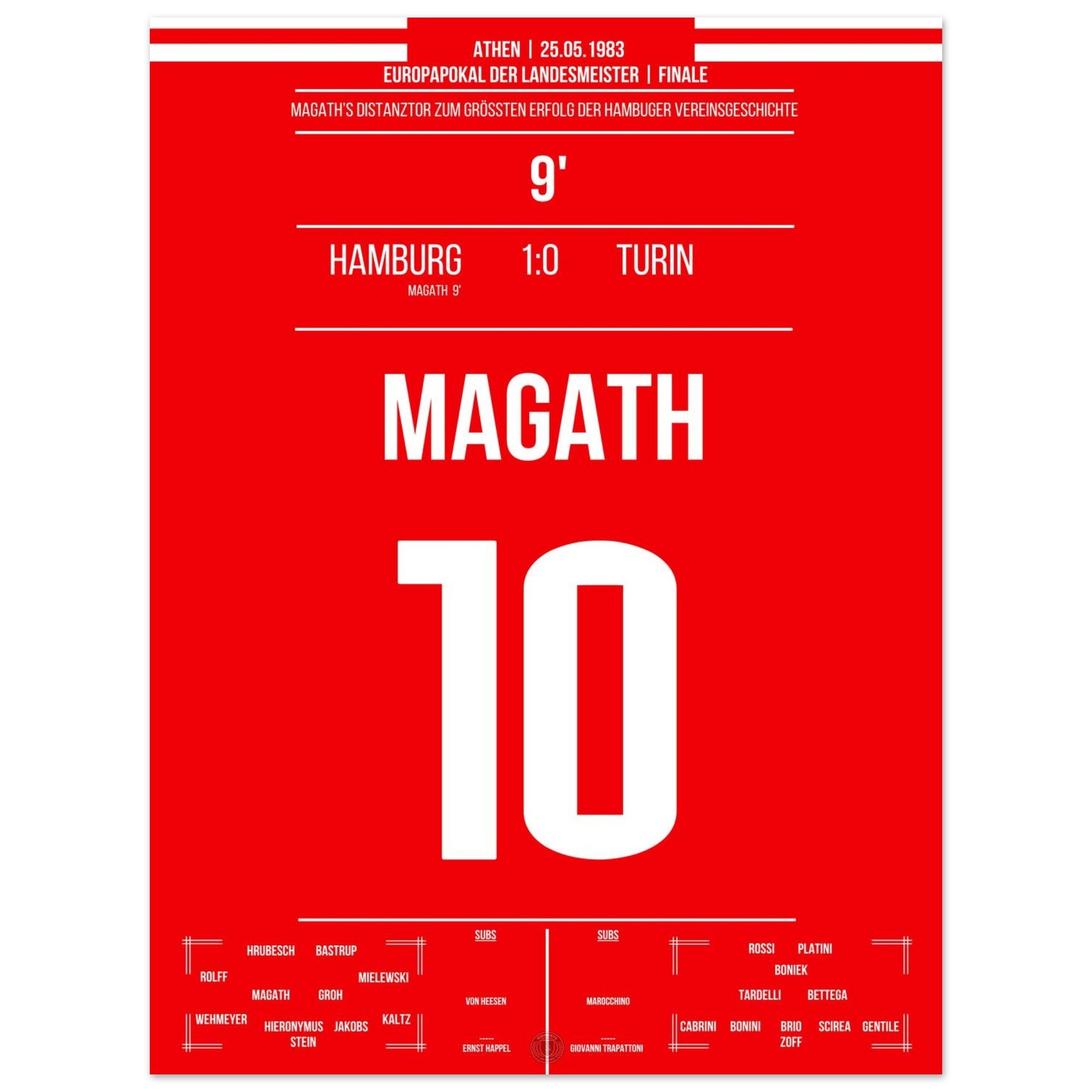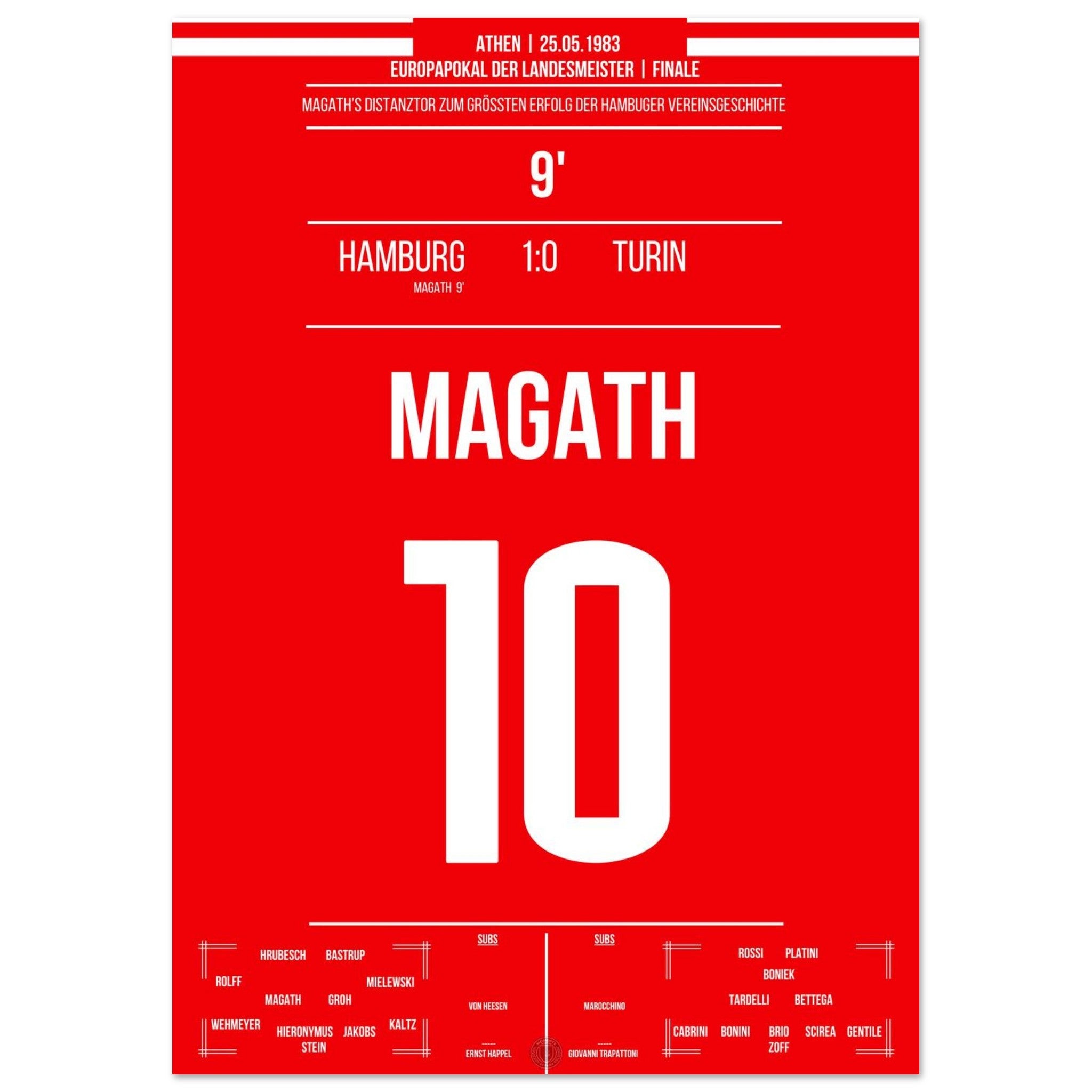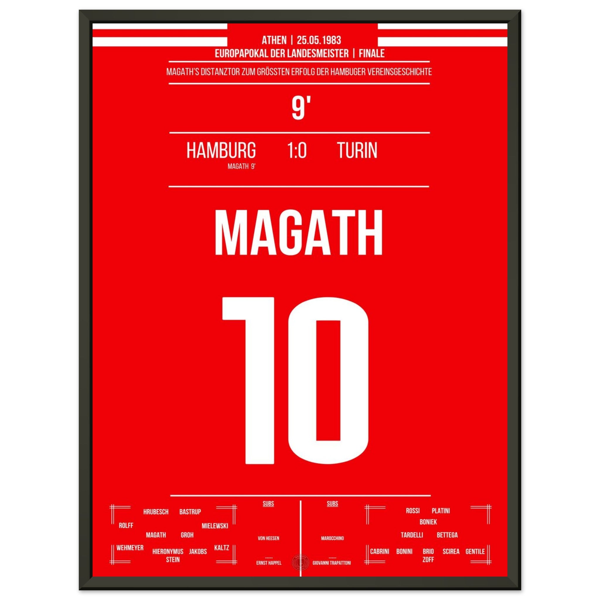 25. Mai 1983 – Hamburg vs. J. Turin 1:0: Felix Magath krönt Hamburg mit einem Traumtor in der 8. Minute zum Europapokalsieger der Landesmeister. In Athen schlägt Hamburg die Alte Dame – und schreibt Vereinsgeschichte. Unser Poster würdigt diesen goldenen Abend für den deutschen Fußball.