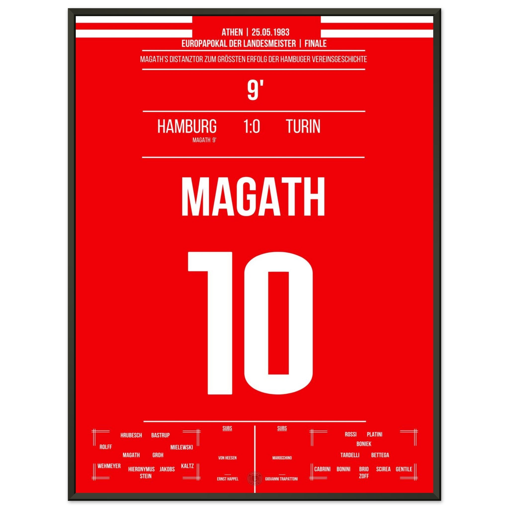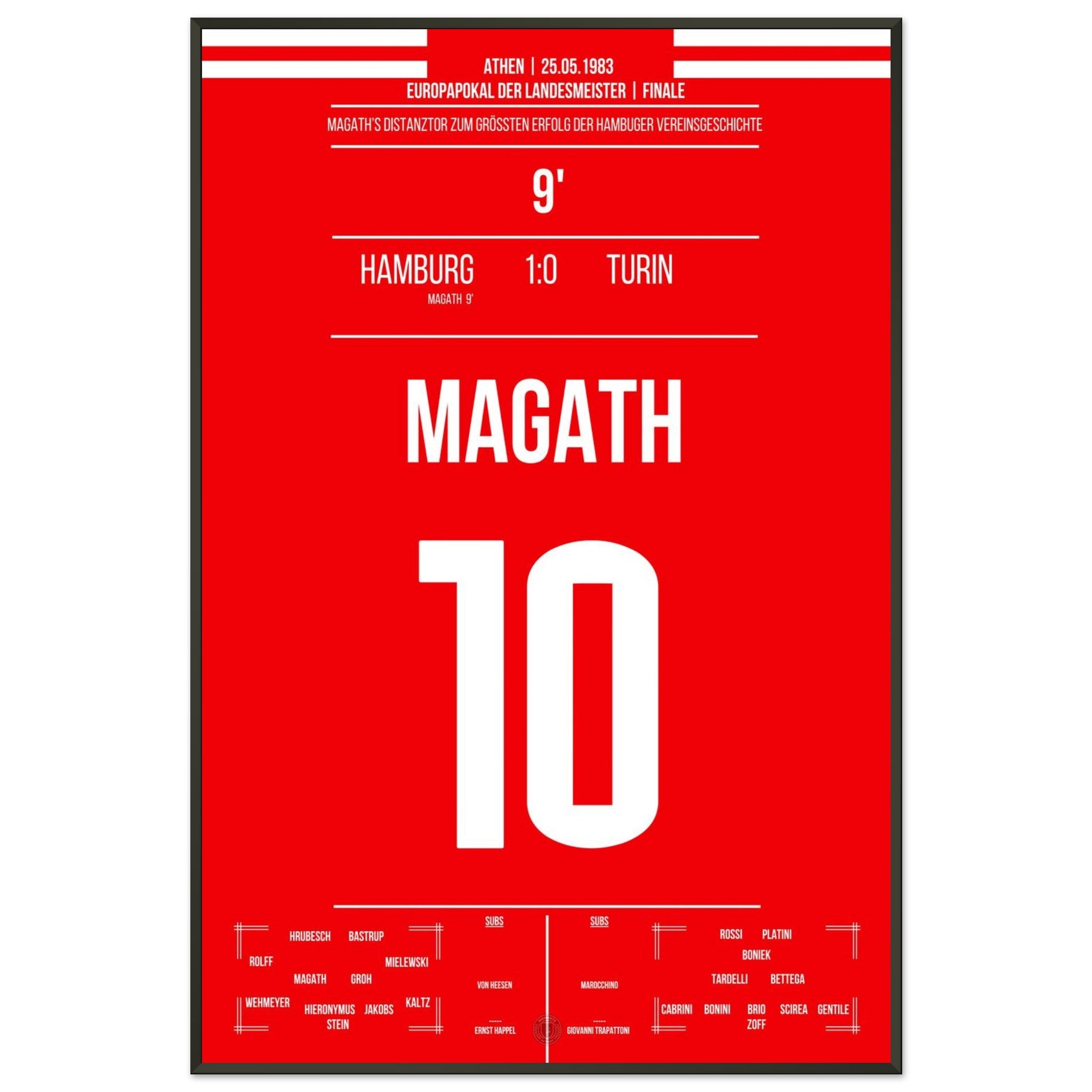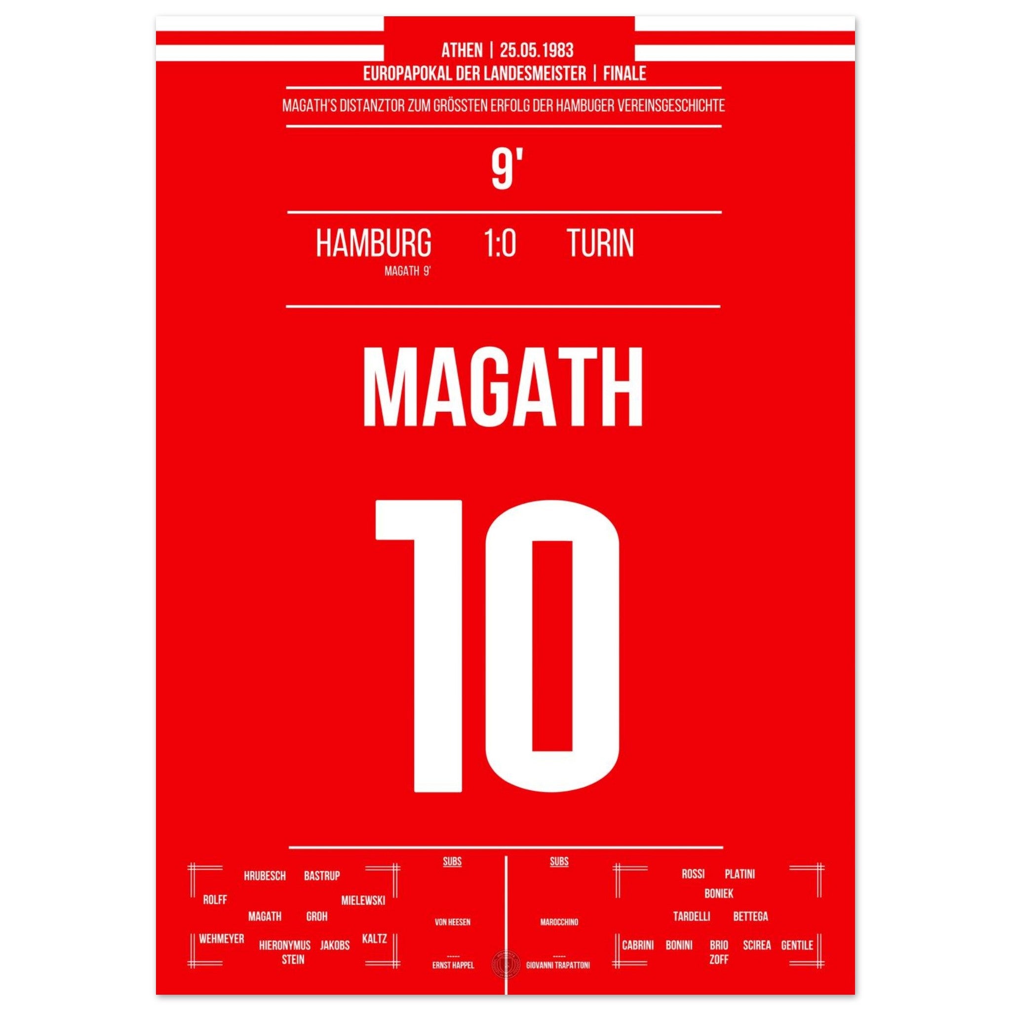 25. Mai 1983 – Hamburg vs. J. Turin 1:0: Felix Magath krönt Hamburg mit einem Traumtor in der 8. Minute zum Europapokalsieger der Landesmeister. In Athen schlägt Hamburg die Alte Dame – und schreibt Vereinsgeschichte. Unser Poster würdigt diesen goldenen Abend für den deutschen Fußball.