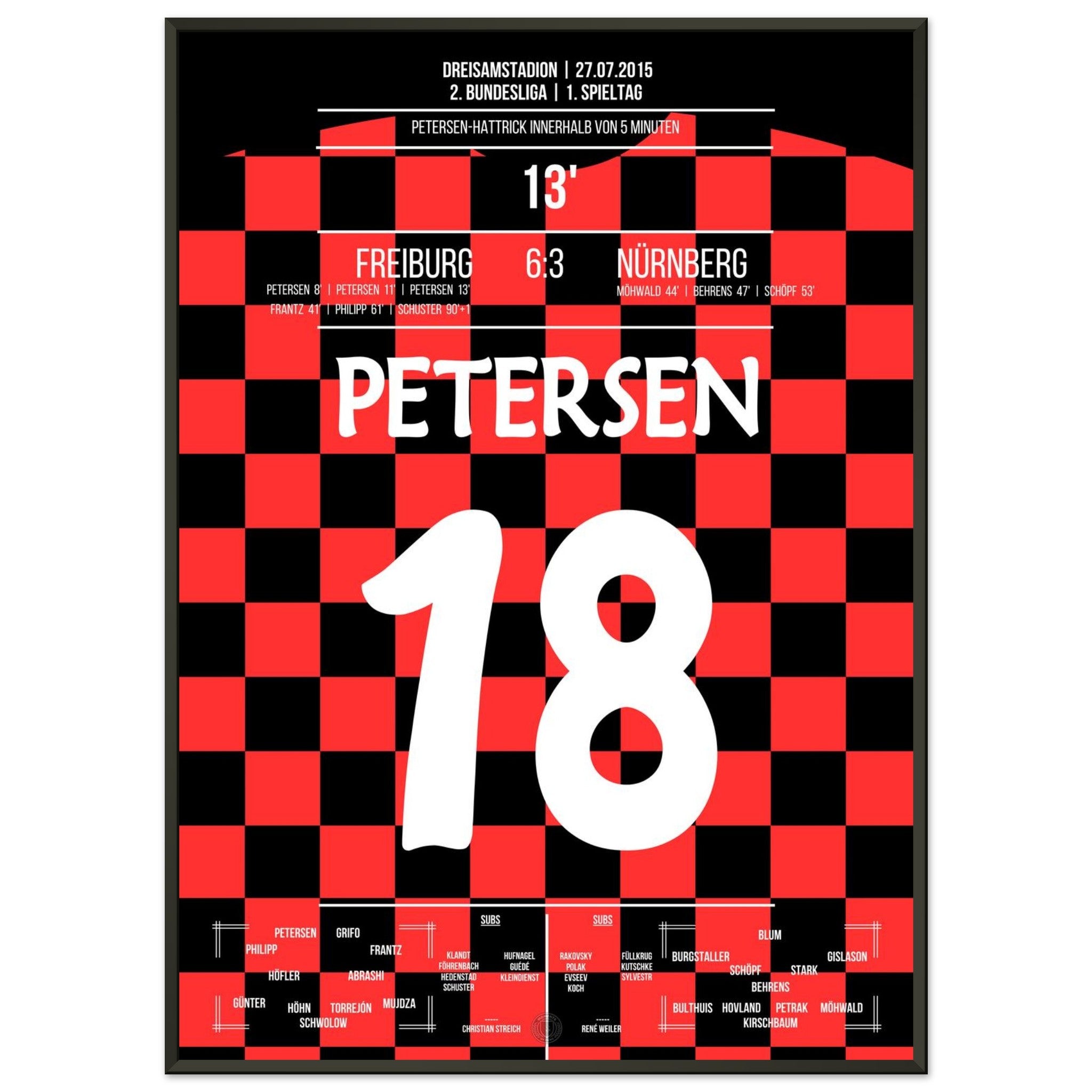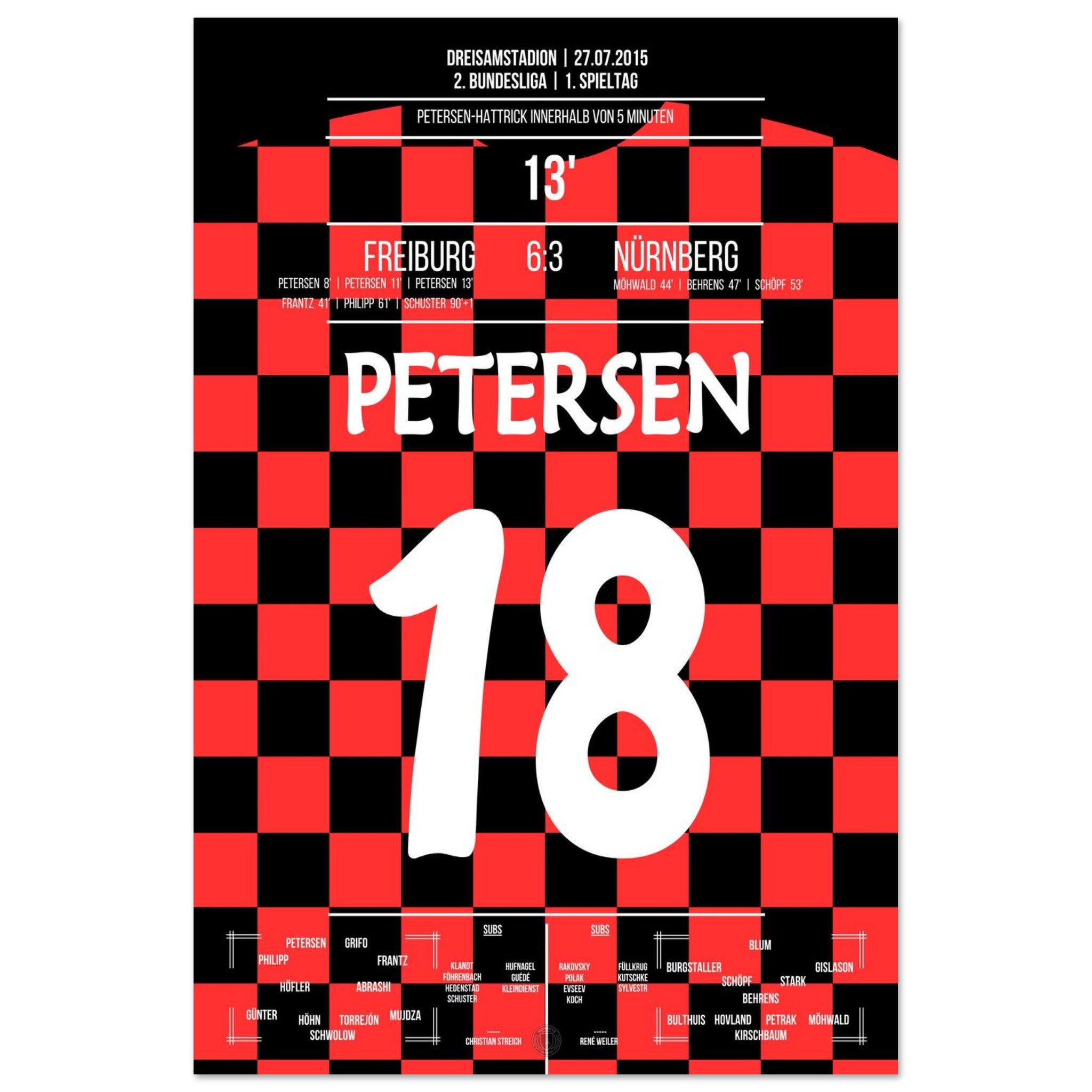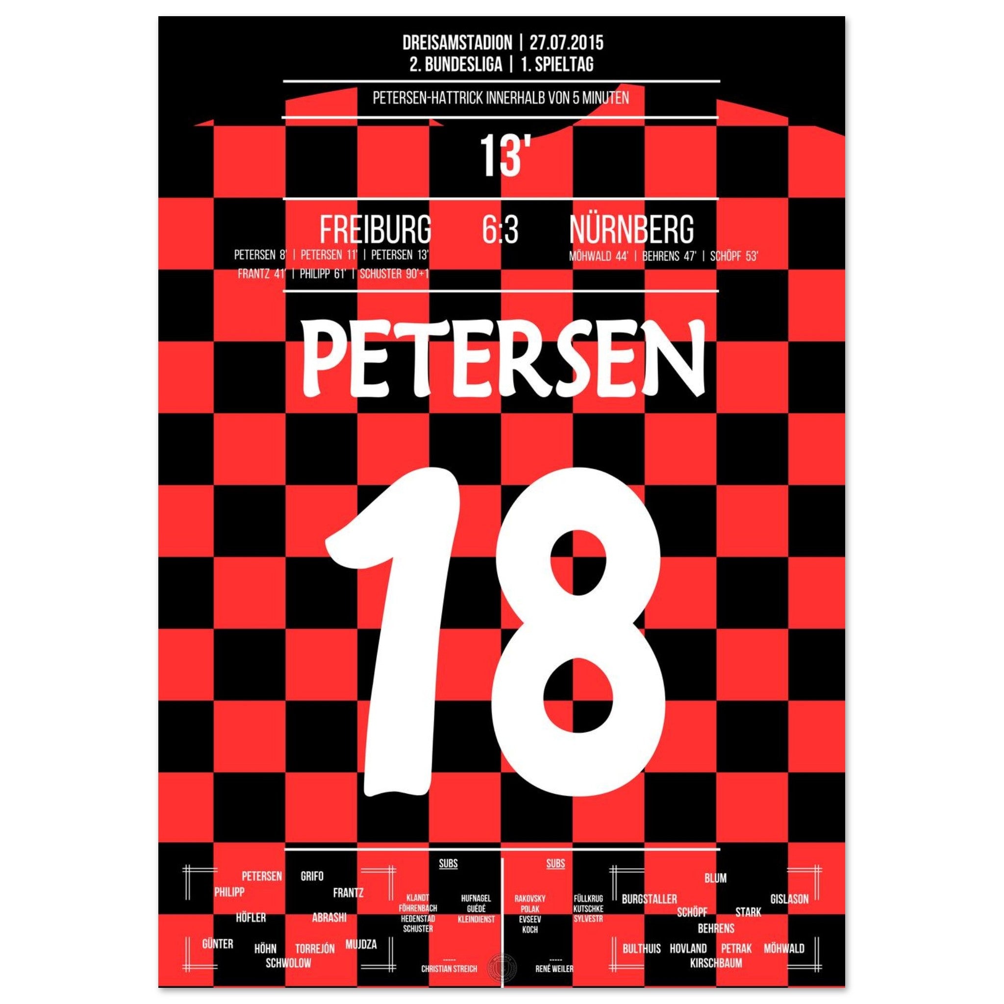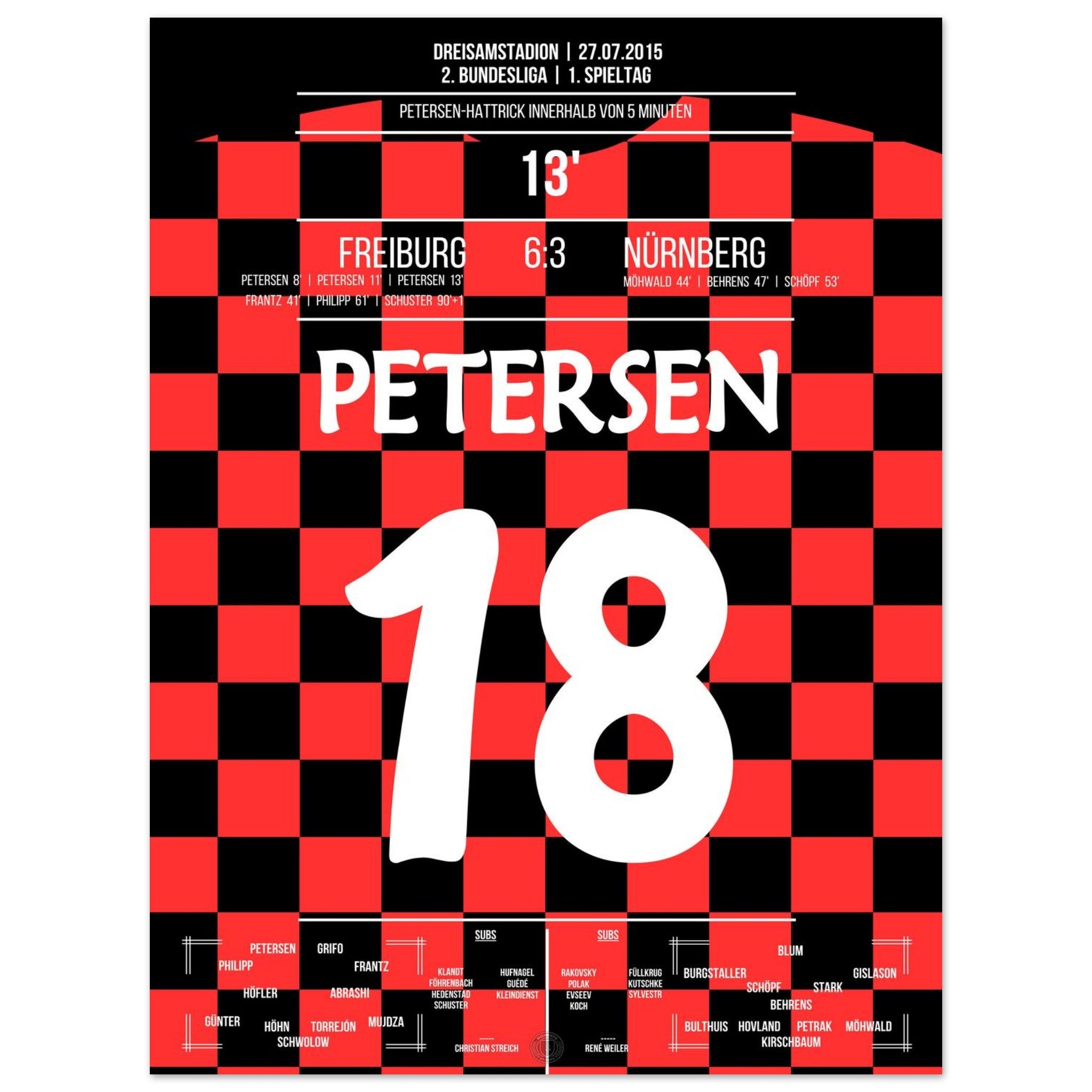 27. Juli 2015 – Freiburg vs. Nürnberg 6:3: Nils Petersen schnürt beim wilden Zweitliga-Auftakt einen Hattrick und führt Freiburg mit eiskalter Präzision zum Torfestival gegen Nürnberg. Ein Einstand nach Maß und ein echtes Offensivfeuerwerk. Unser Poster verewigt diesen Hattrick-Moment.