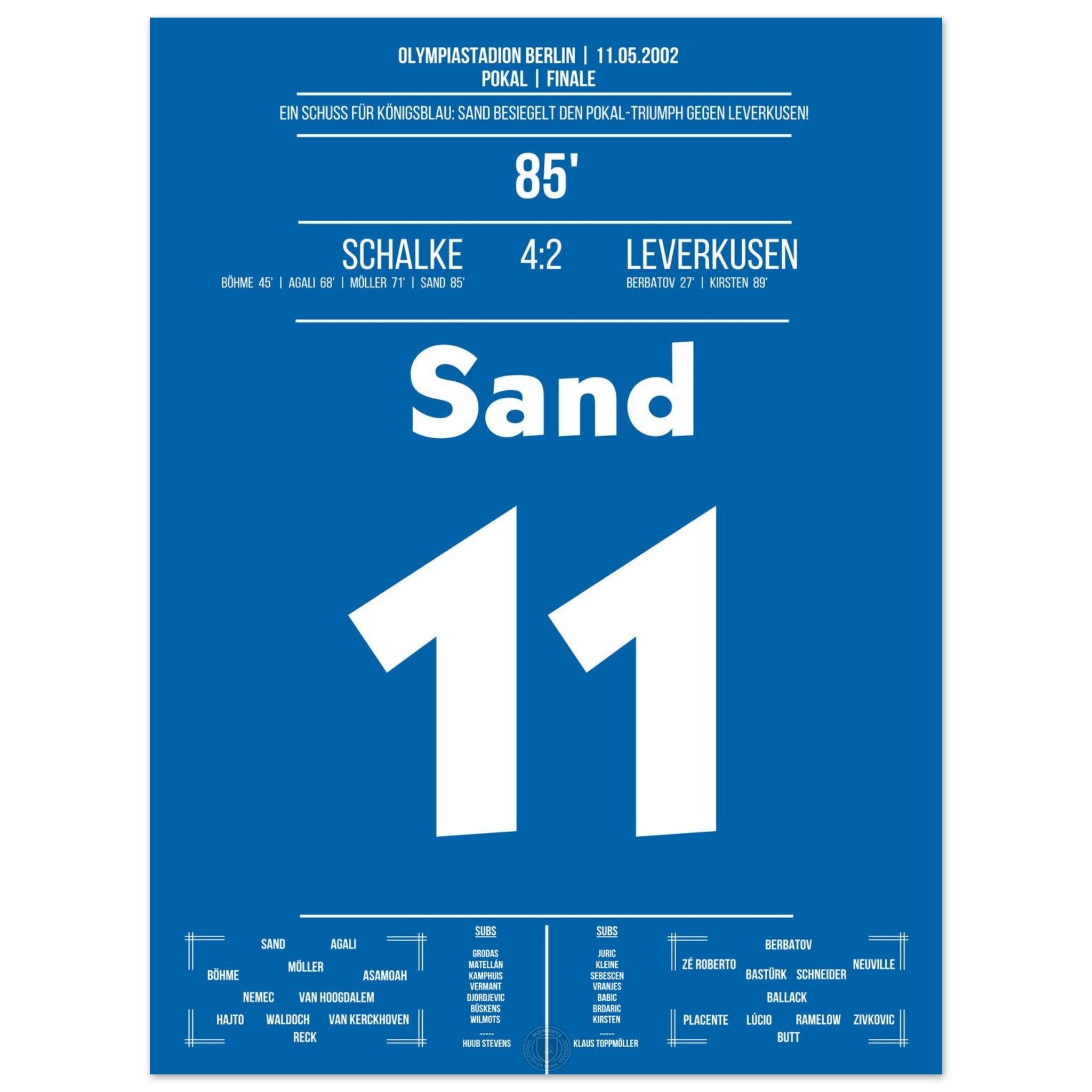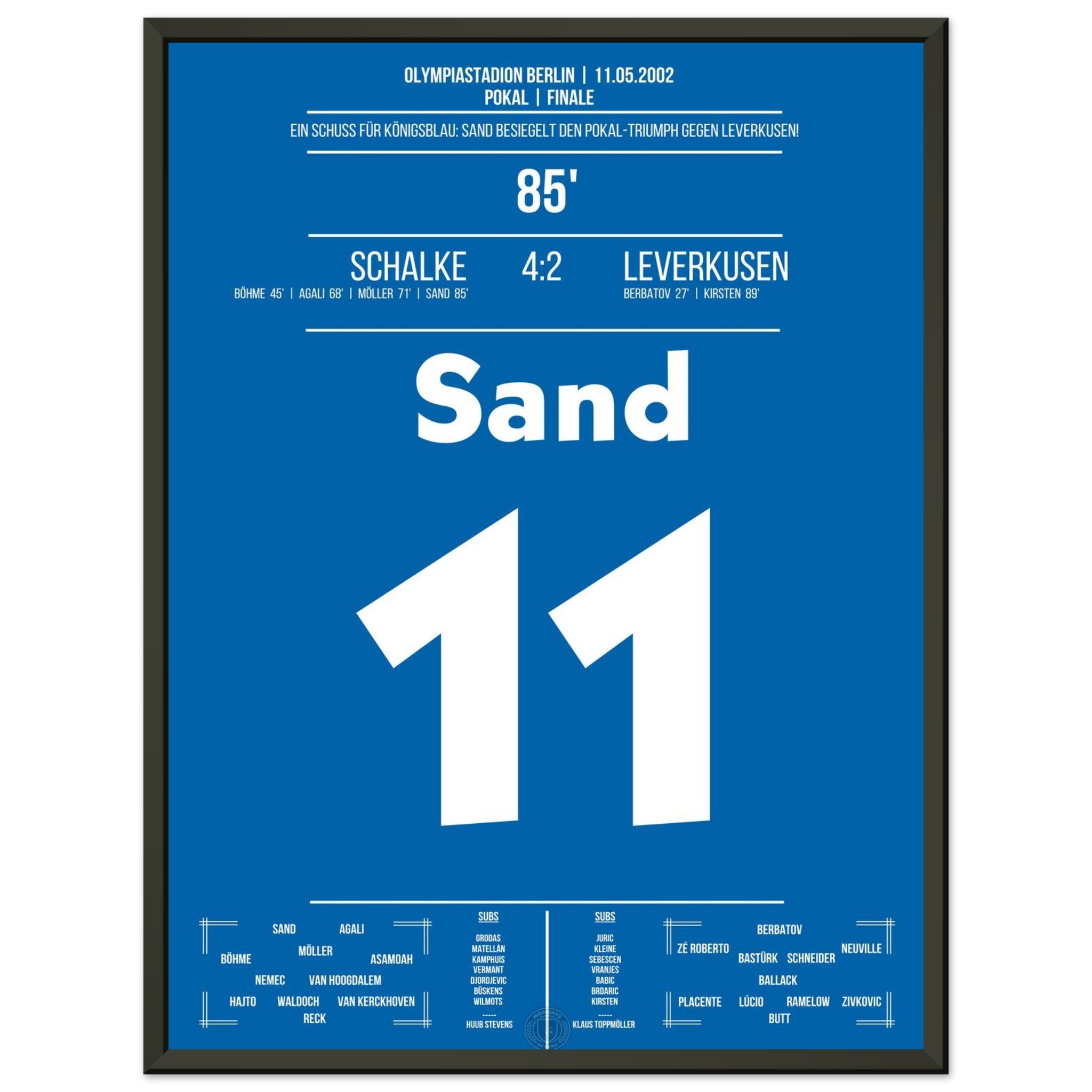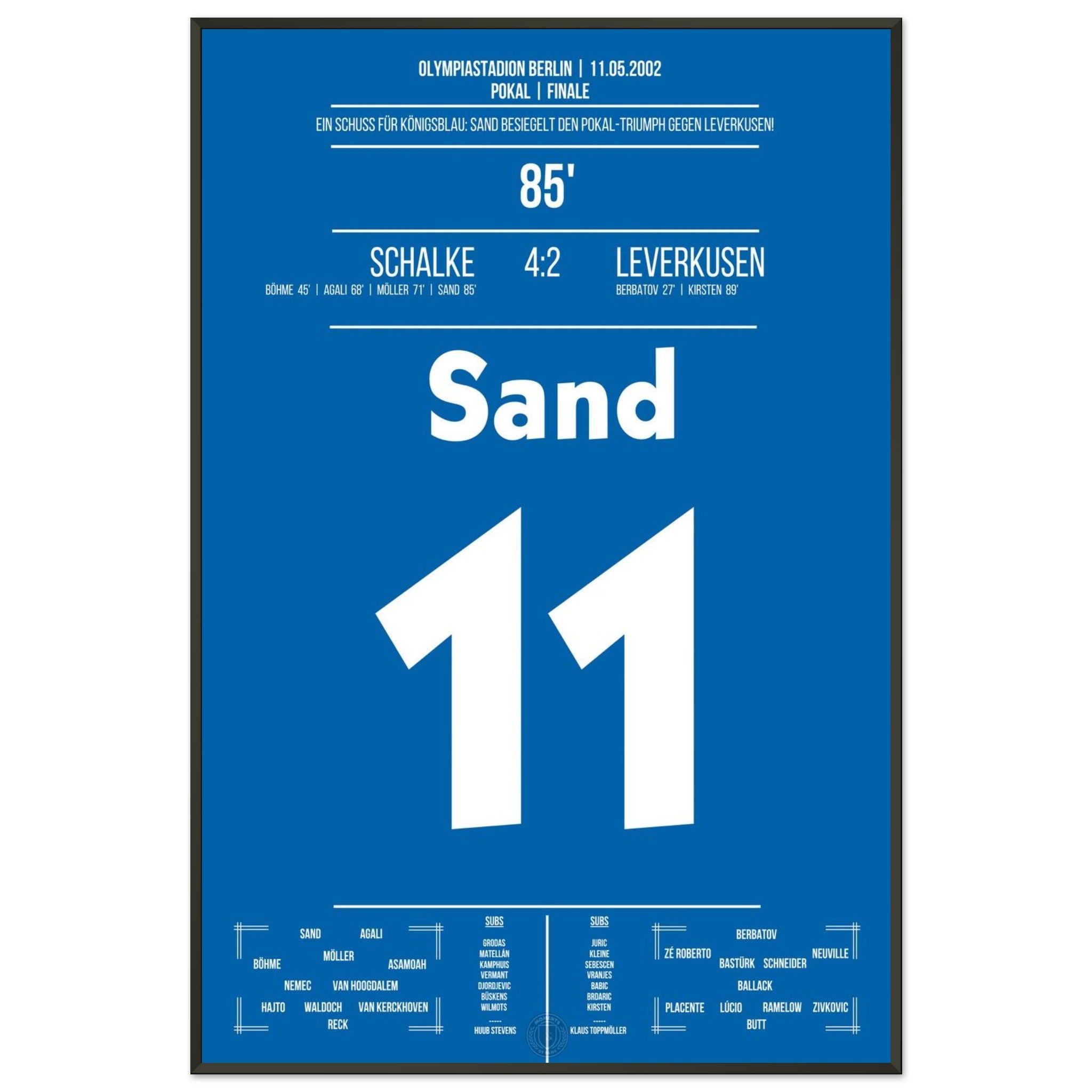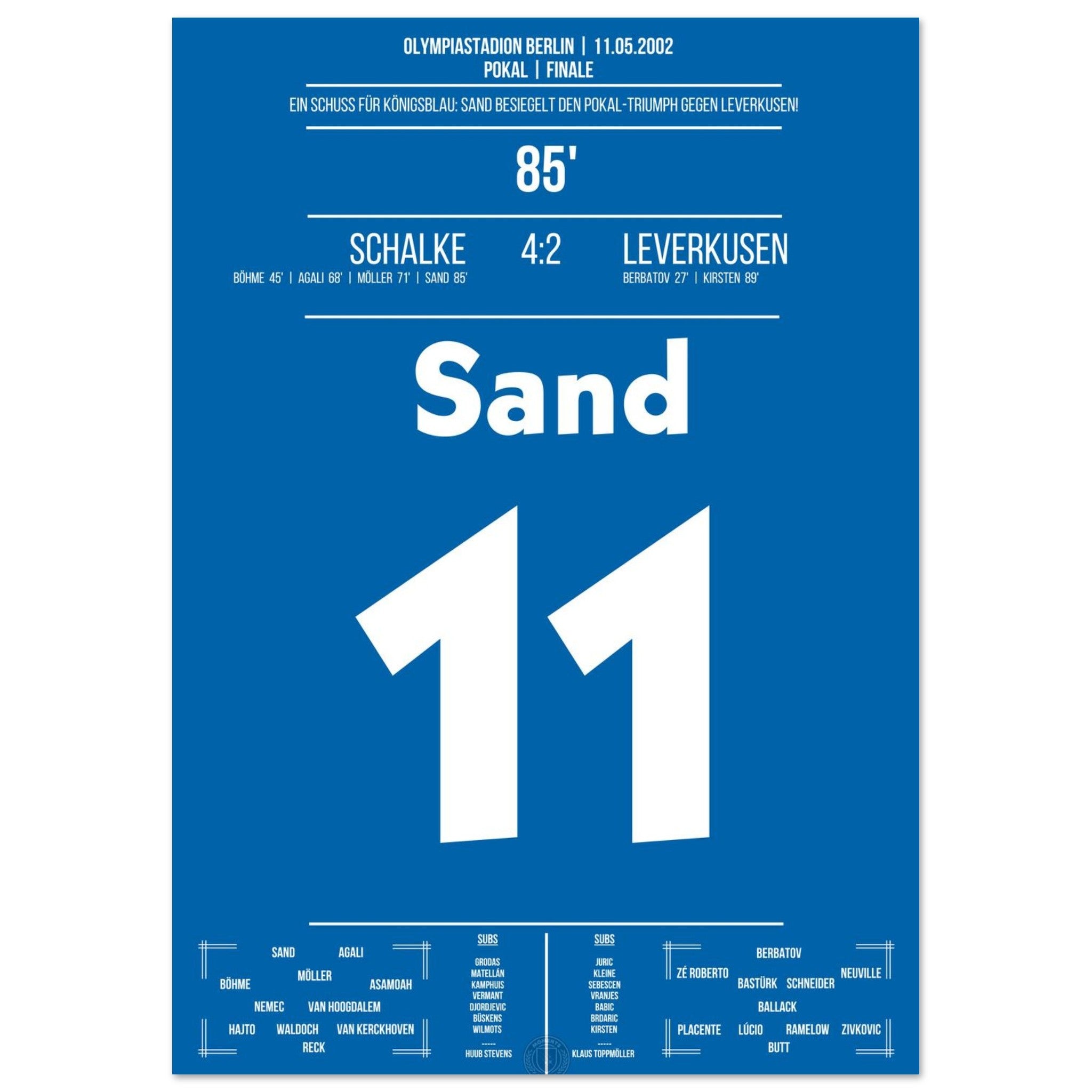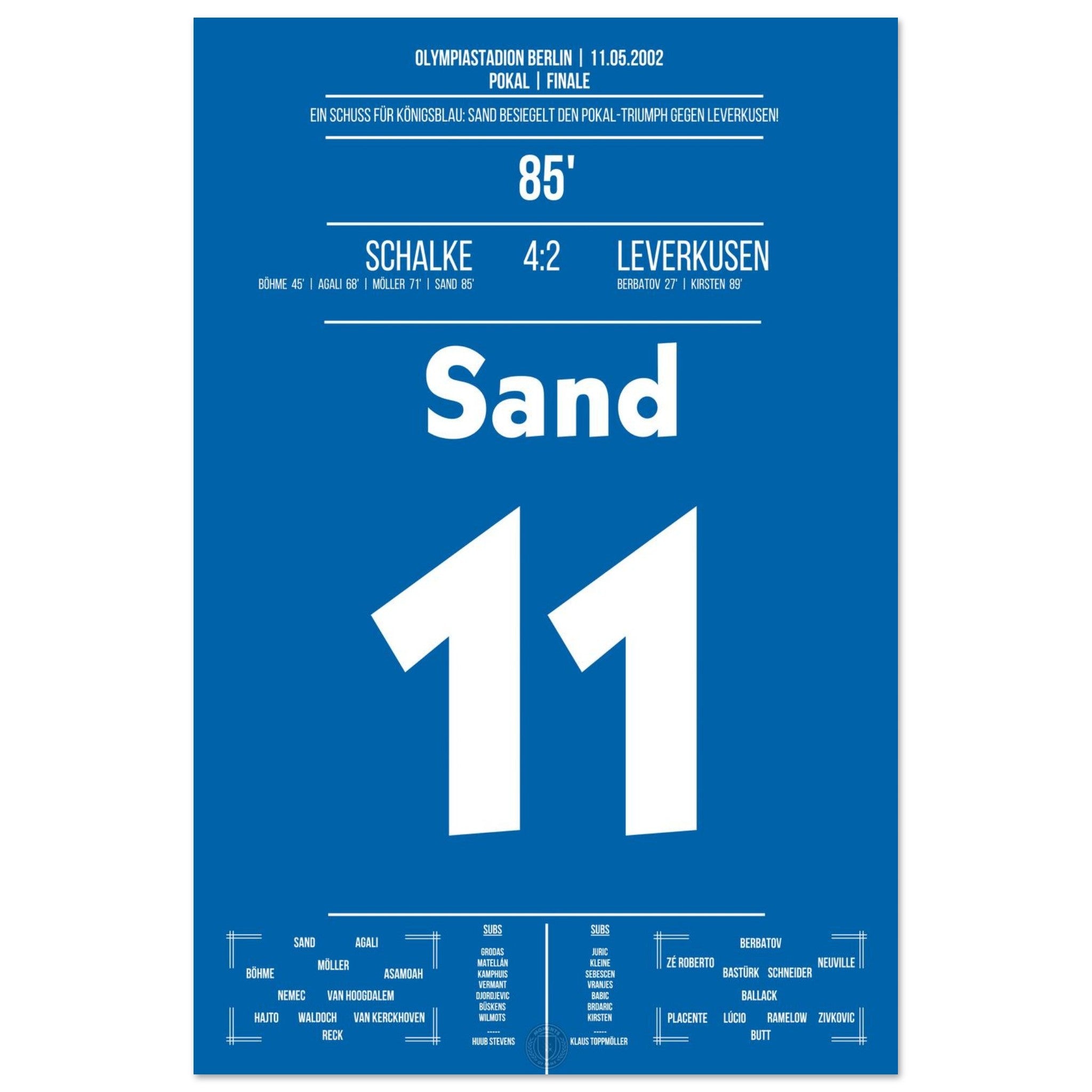 11. Mai 2002 – Schalke vs. Leverkusen 4:2: In der 85. Minute trifft Ebbe Sand zum 4:2 und besiegelt Schalkes Sieg im Pokalfinale. Gänsehaut auf Schalke, Enttäuschung beim Gegner. Unser Poster hält diesen entscheidenden Sand-Moment in Königsblau fest.