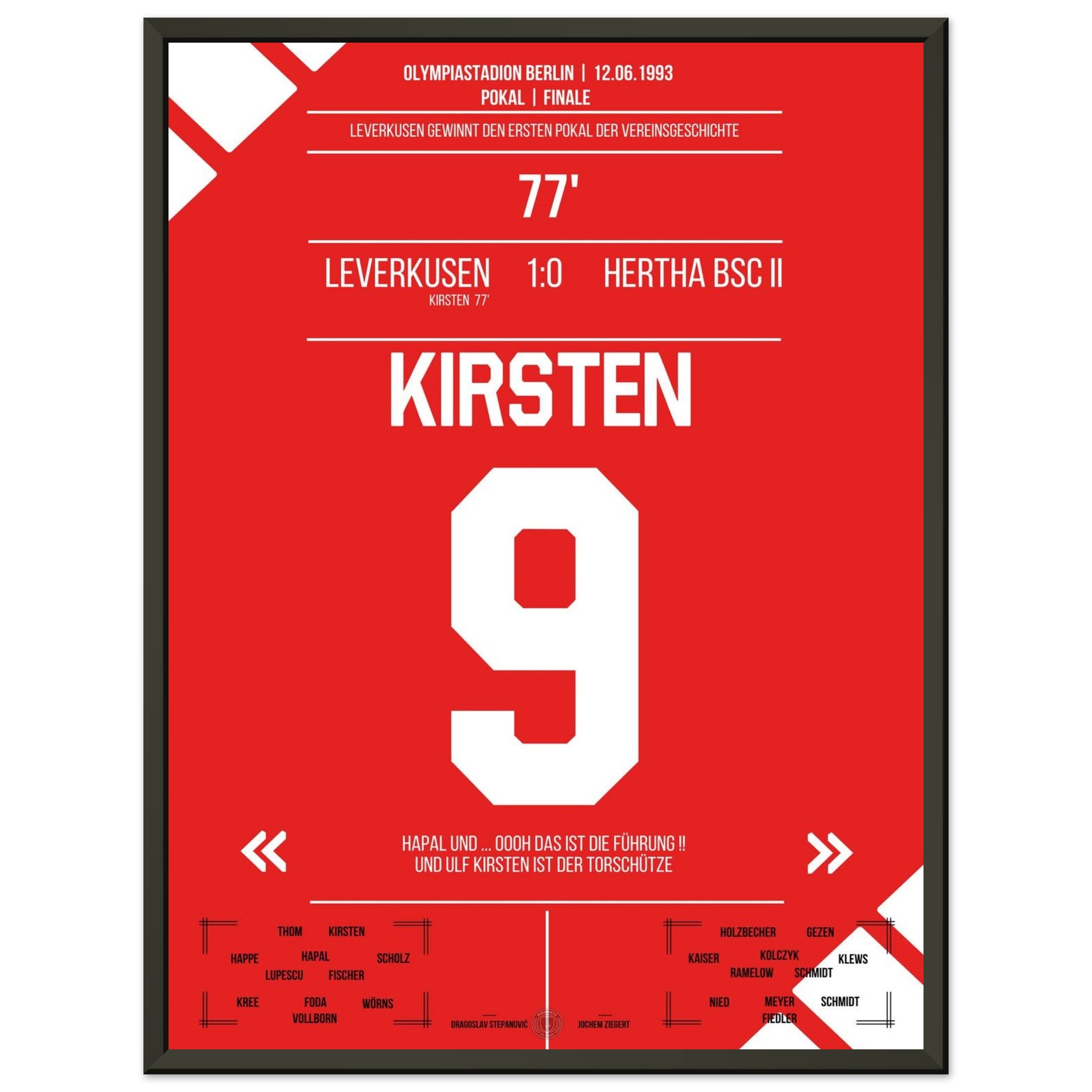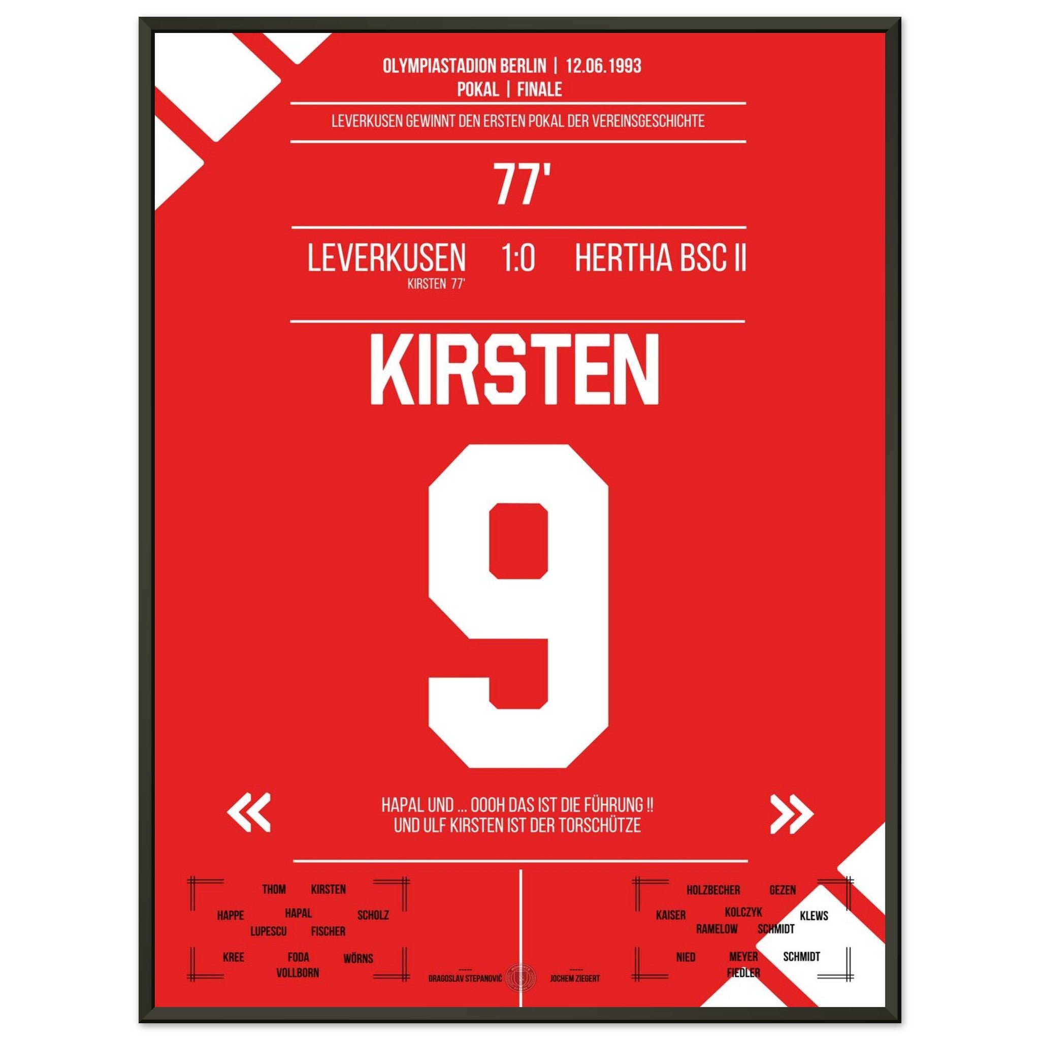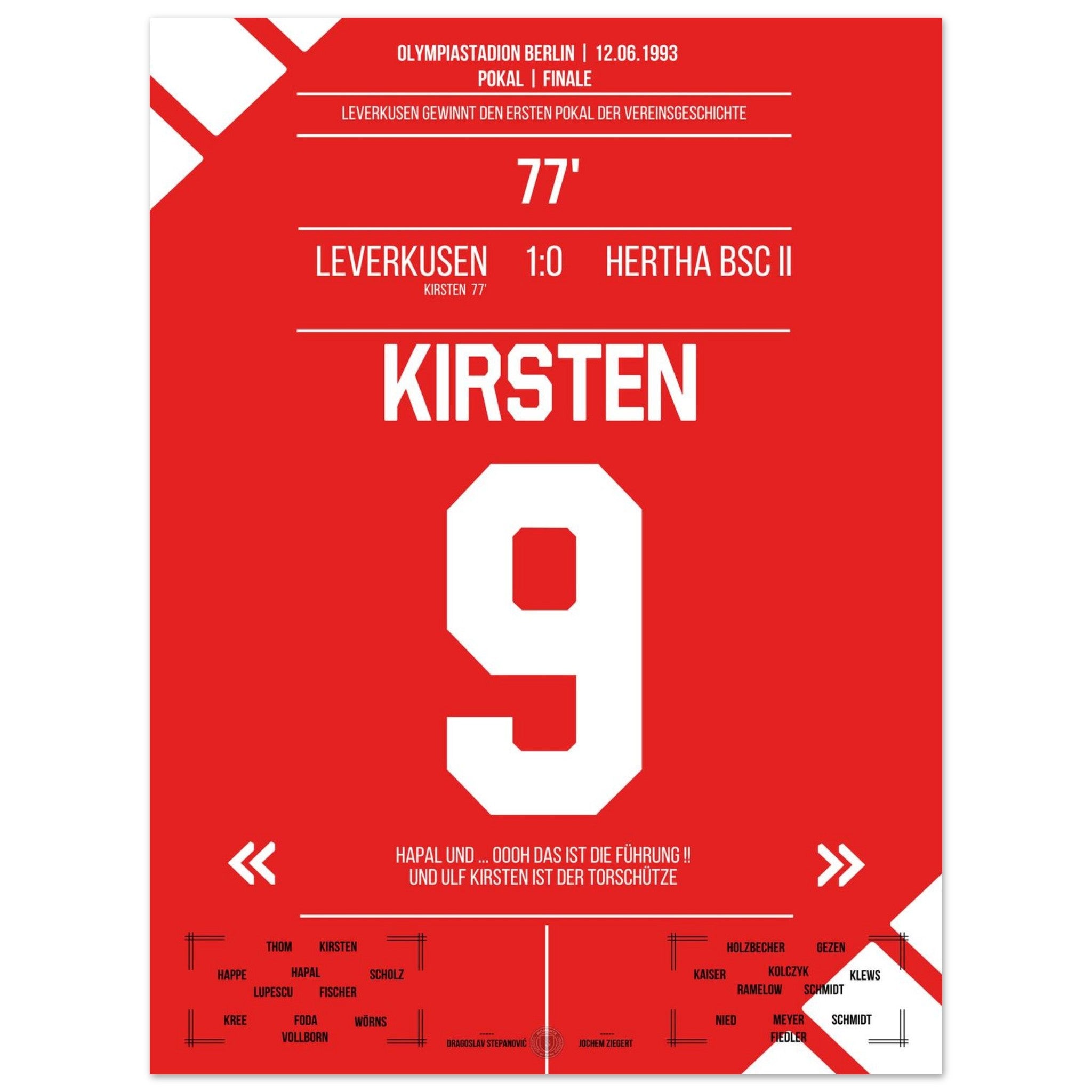 12. Juni 1993 – Leverkusen vs. Hertha BSC II 1:0: In der 77. Minute erlöst Ulf Kirsten Leverkusen im Pokalfinale mit seinem Treffer zum 1:0 – und sichert dem Verein den ersten großen nationalen Titel der Klubgeschichte. Ein historischer Moment im Berliner Olympiastadion. Unser Poster hält diesen goldenen Pokalcoup in Schwarz-Rot fest.