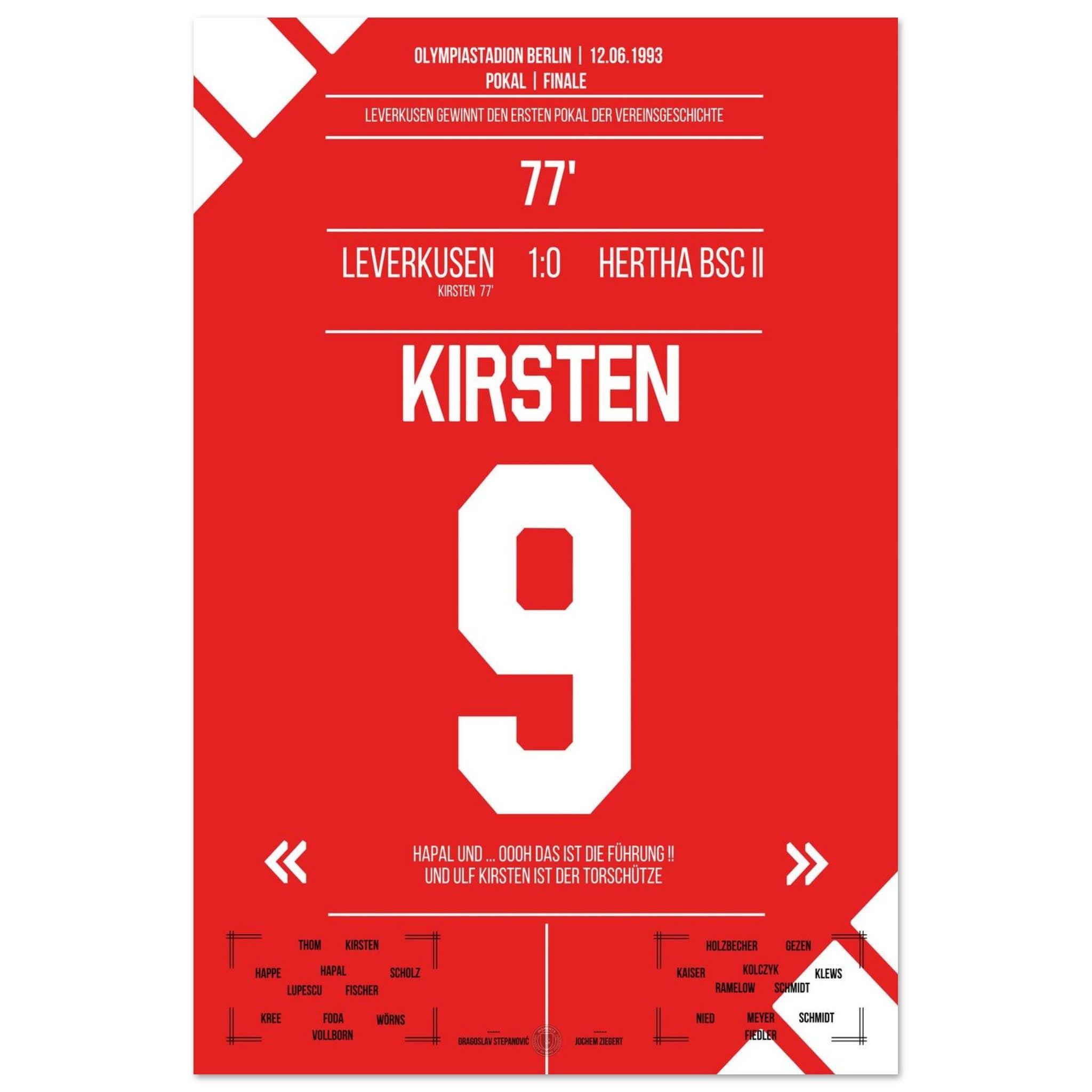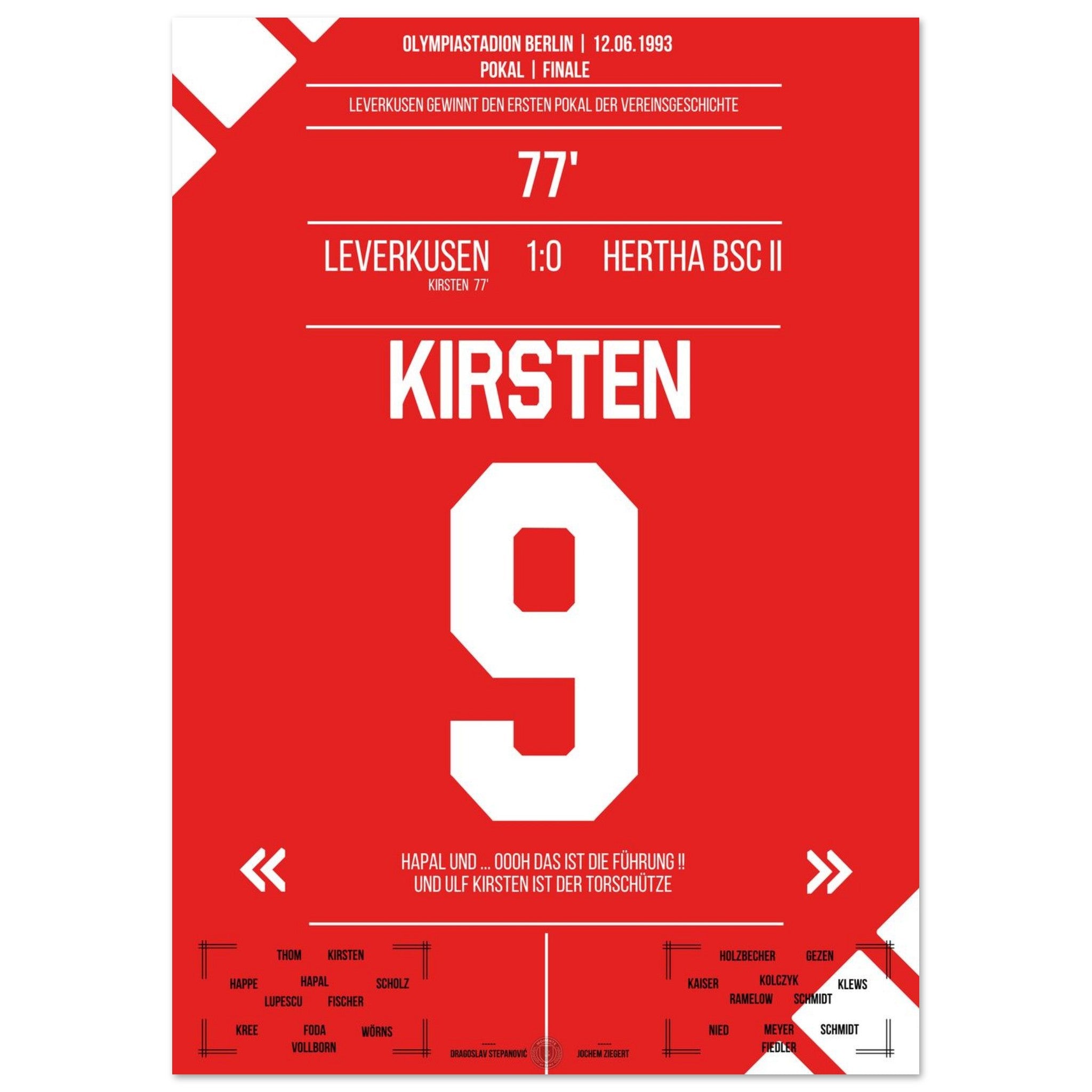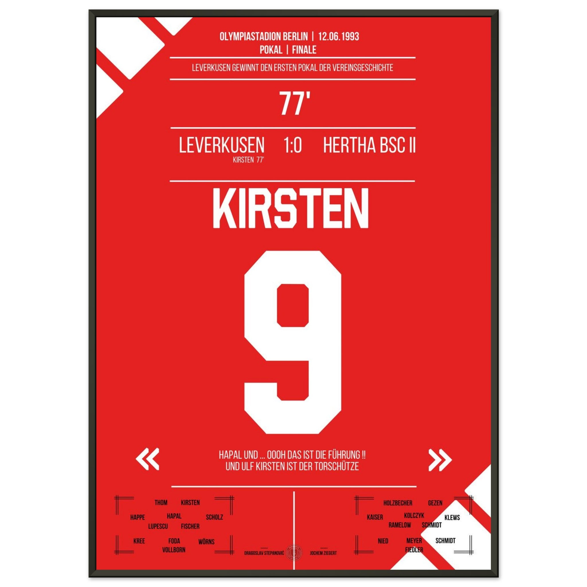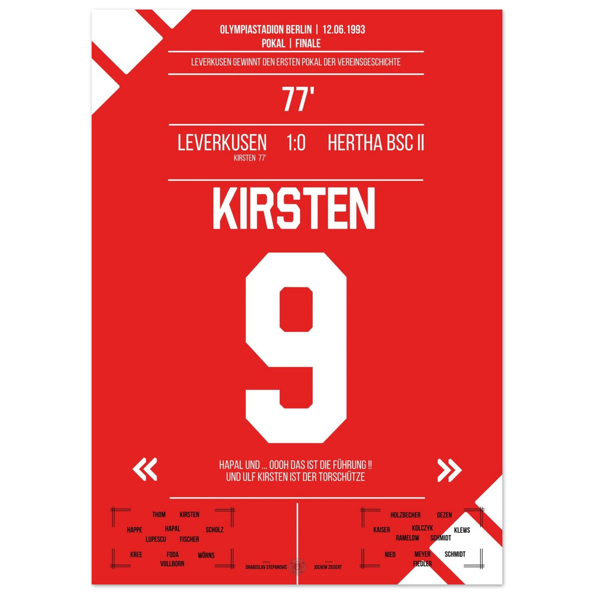 12. Juni 1993 – Leverkusen vs. Hertha BSC II 1:0: In der 77. Minute erlöst Ulf Kirsten Leverkusen im Pokalfinale mit seinem Treffer zum 1:0 – und sichert dem Verein den ersten großen nationalen Titel der Klubgeschichte. Ein historischer Moment im Berliner Olympiastadion. Unser Poster hält diesen goldenen Pokalcoup in Schwarz-Rot fest.