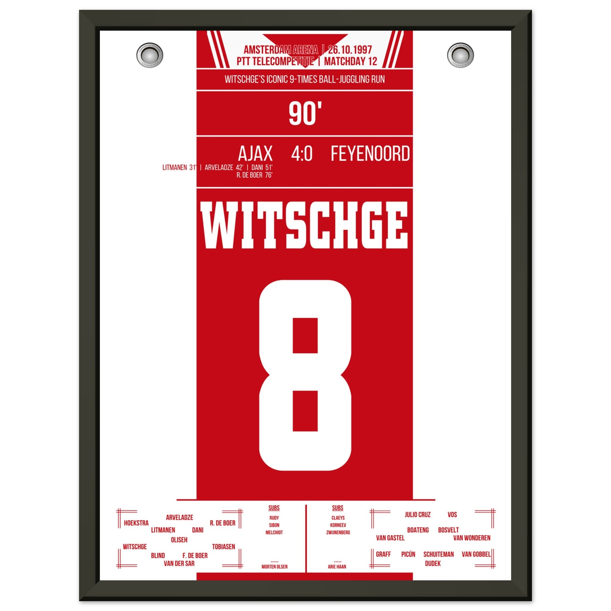 Sie können sicher sein, dass jedes Poster und jeder Rahmen in einer robusten Verpackung versandt wird, damit es in tadellosem Zustand ankommt. Es ist die perfekte Ergänzung für die Sammlung eines jeden Fußballfans oder das perfekte Geschenk für den eingefleischten Fußball-Fan ihres Freundes- oder Familienkreises.