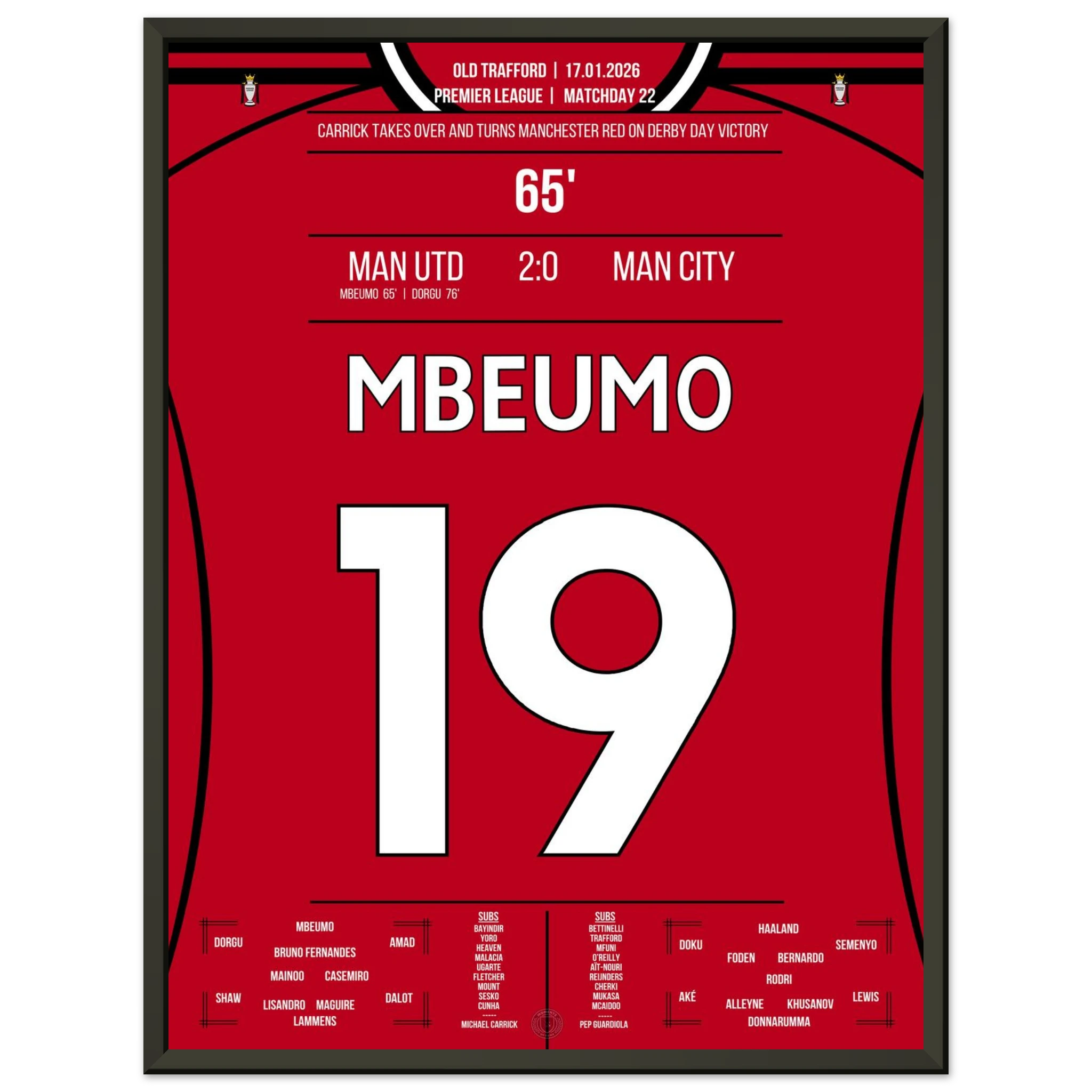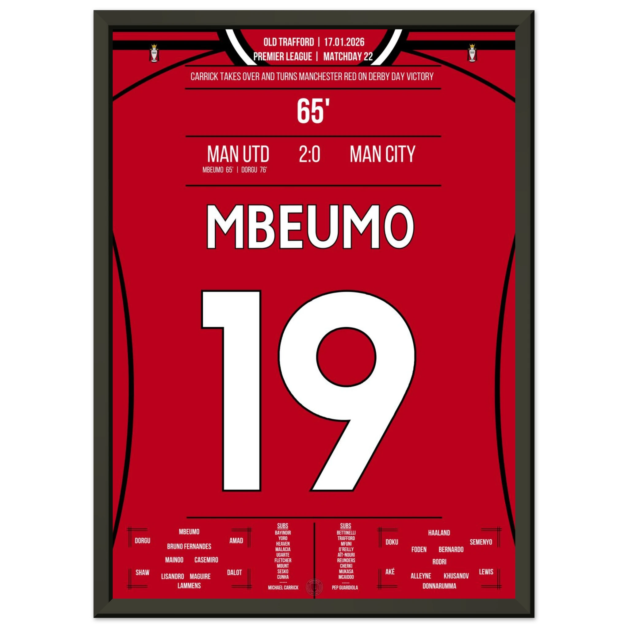 Dieses Poster feiert den Moment, in dem Mbeumo mit einem Schlag das rote Manchester zum Jubeln brachte – Derbyglanz für die Ewigkeit.
