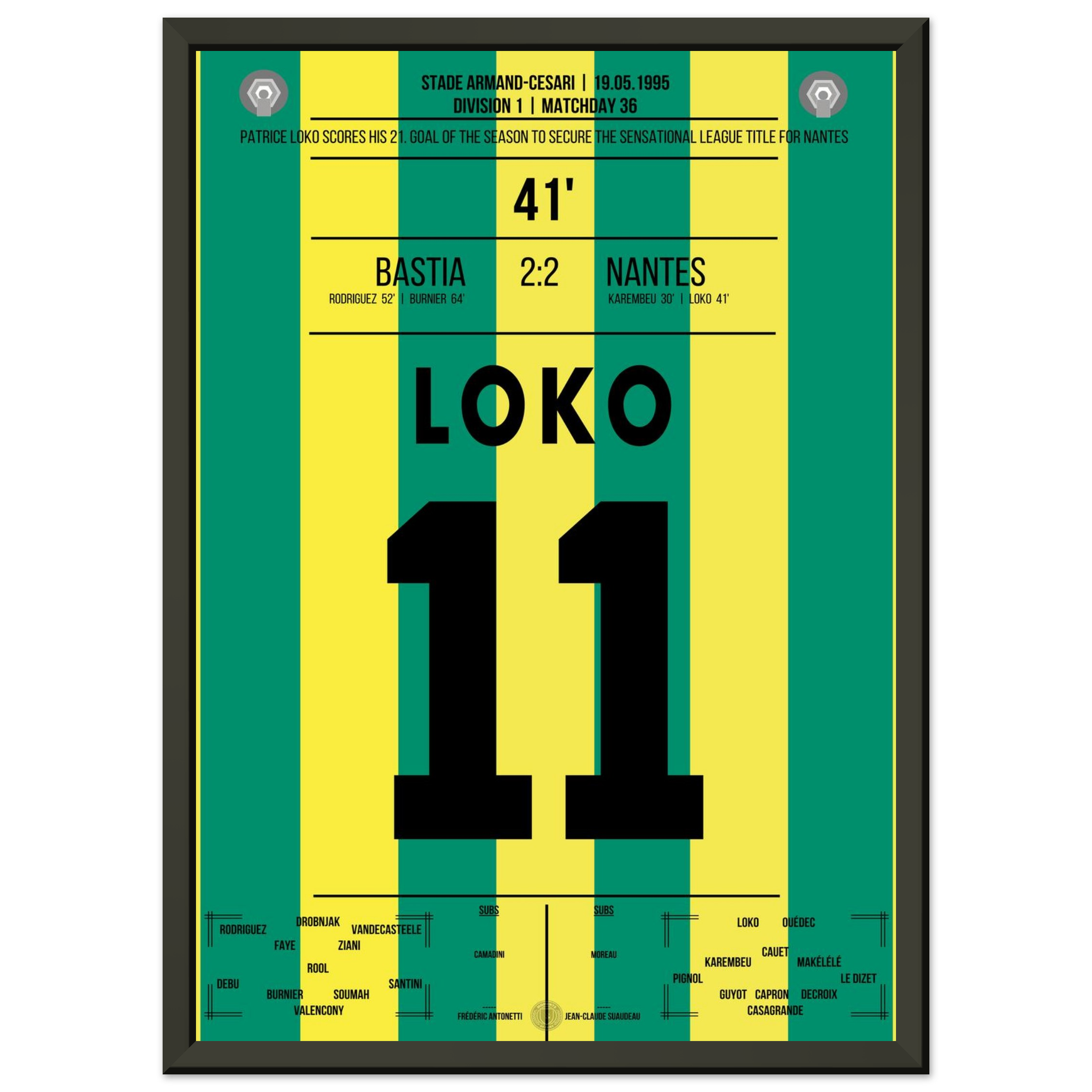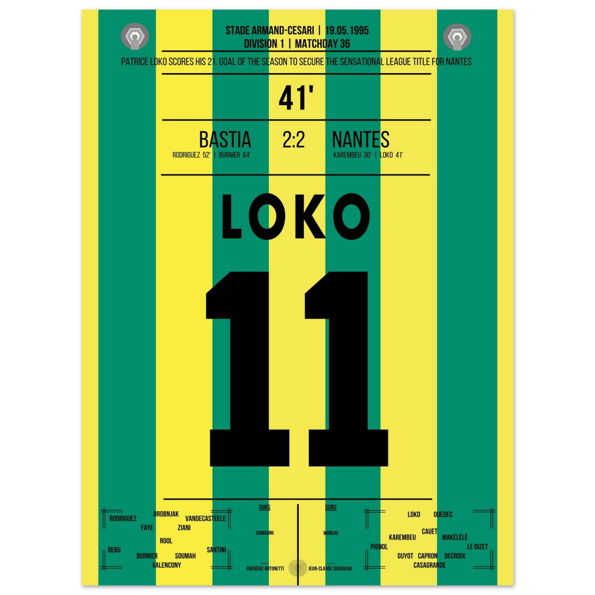 Ein Abend für die Geschichtsbücher: Patrice Loko erzielt den entscheidenden Treffer, der Nantes nach einer überragenden Saison den Meistertitel sichert – ungeschlagen in 32 Spielen!